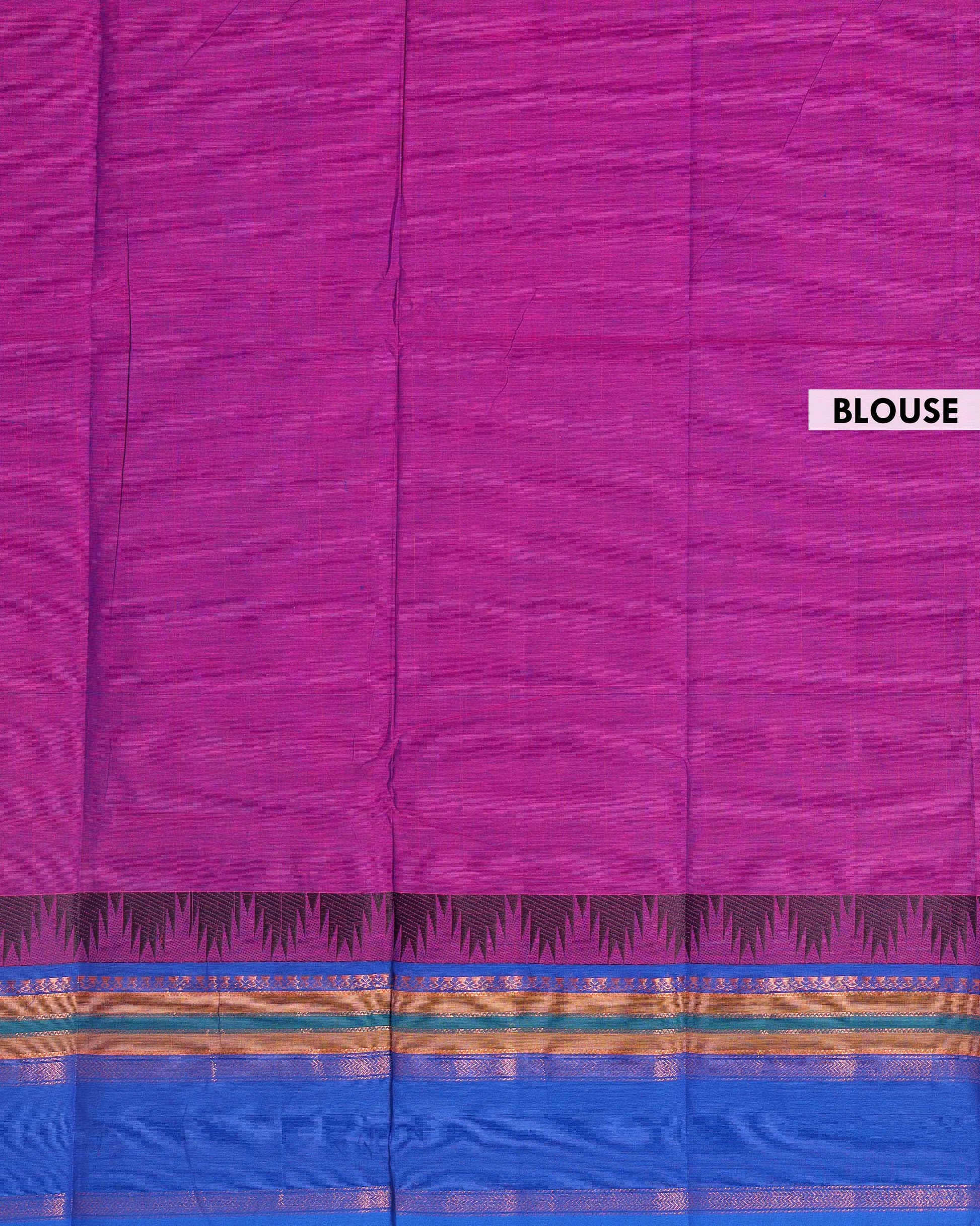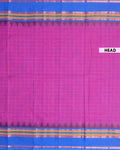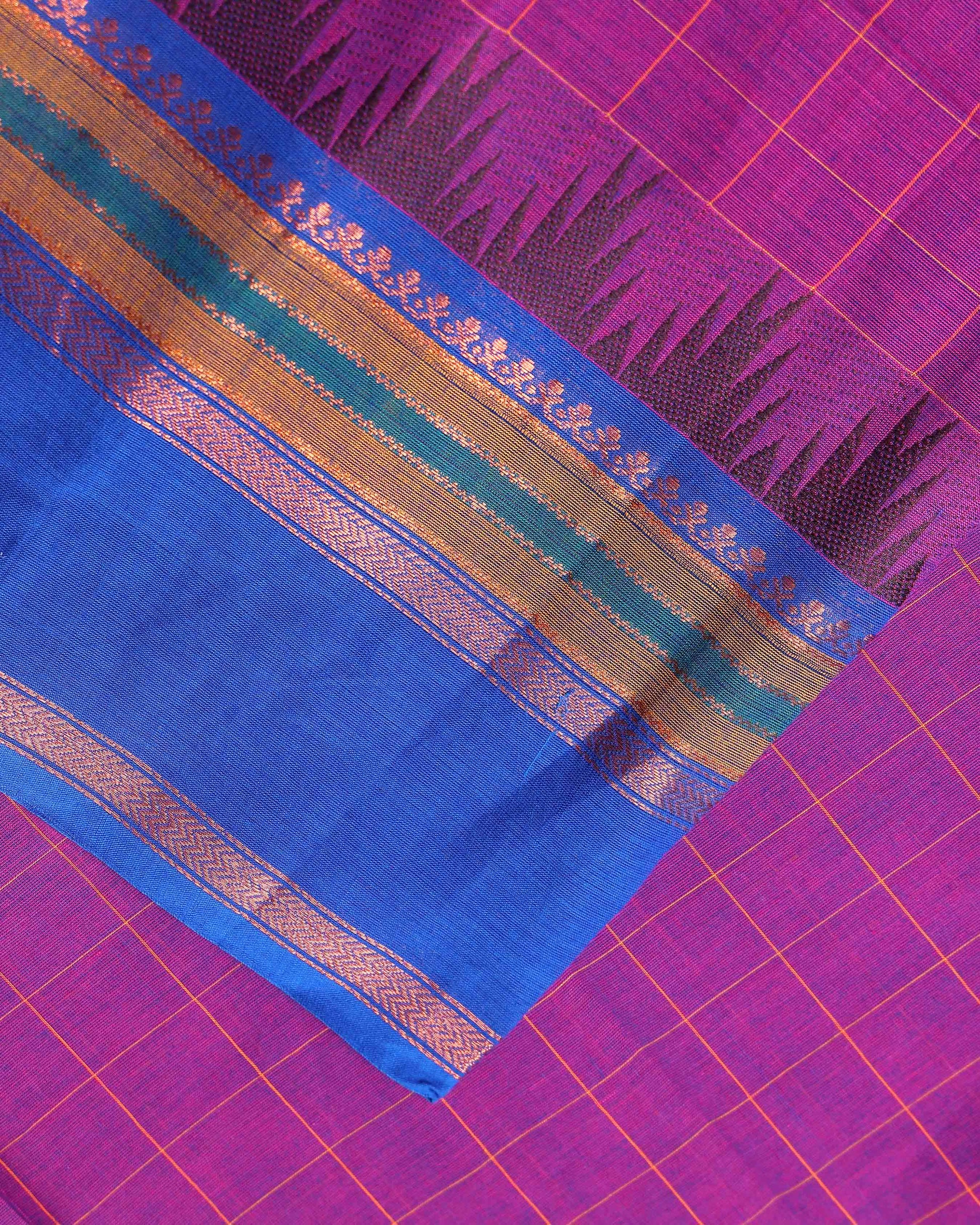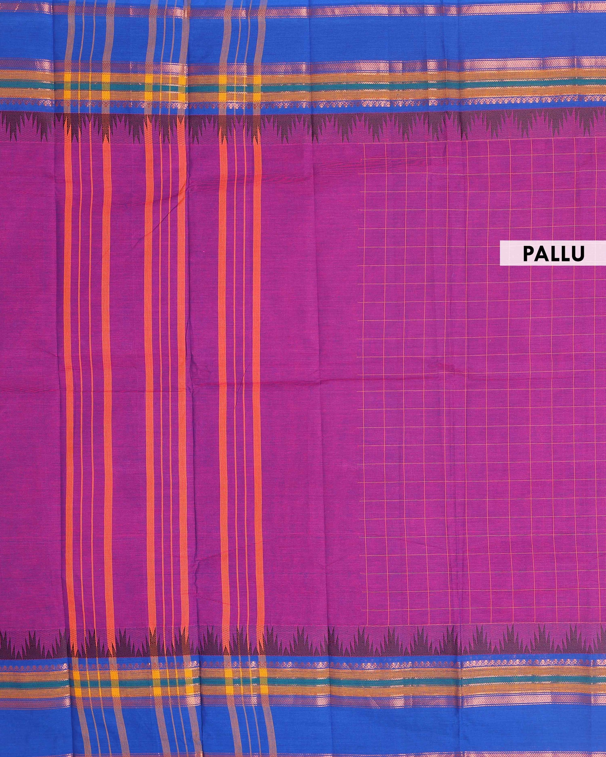 - This handloom Chettinad cotton saree a vibrant Purple body with a subtle checkered pattern, offering a graceful drape and comfortable feel