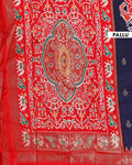 - This handwoven Ikkat saree a rich navy blue body adorned with traditional motifs and a striking red border