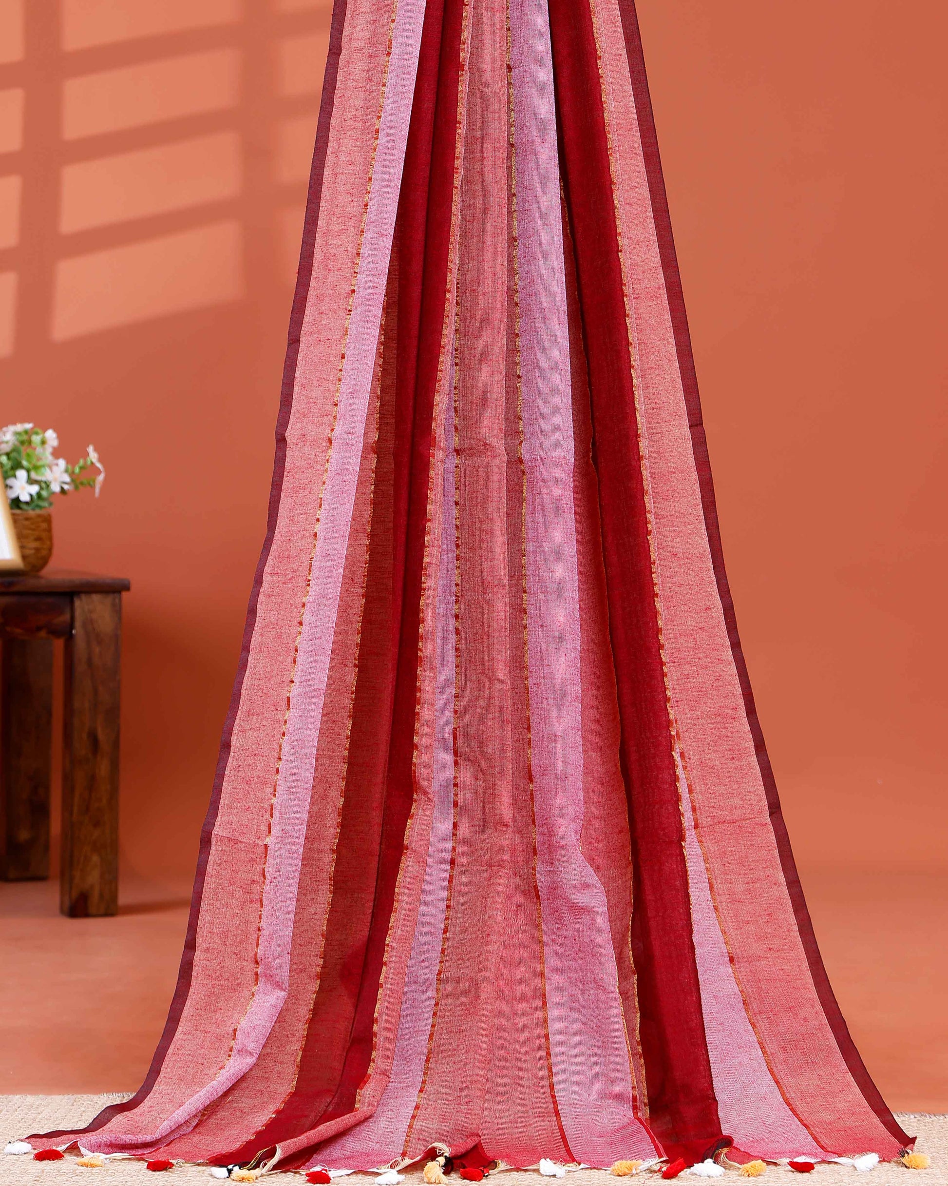 Handwoven Mul Mul Cotton Saree with Bold Striped Pattern and Tassel Detailing – Multi
