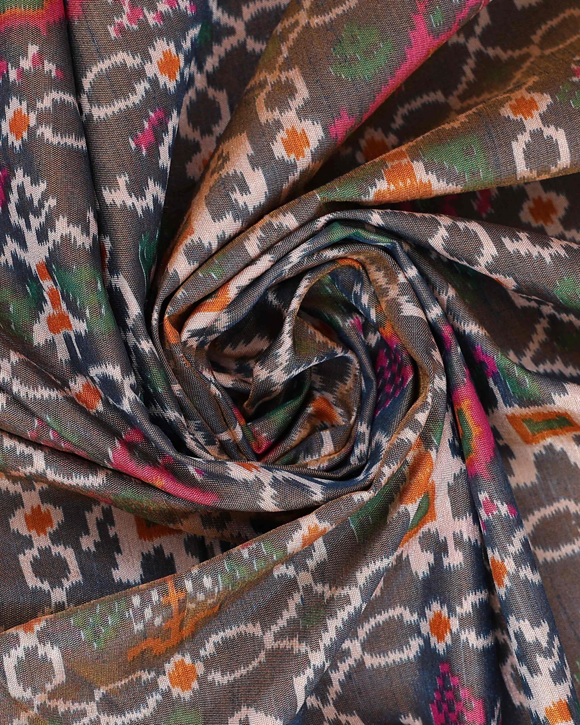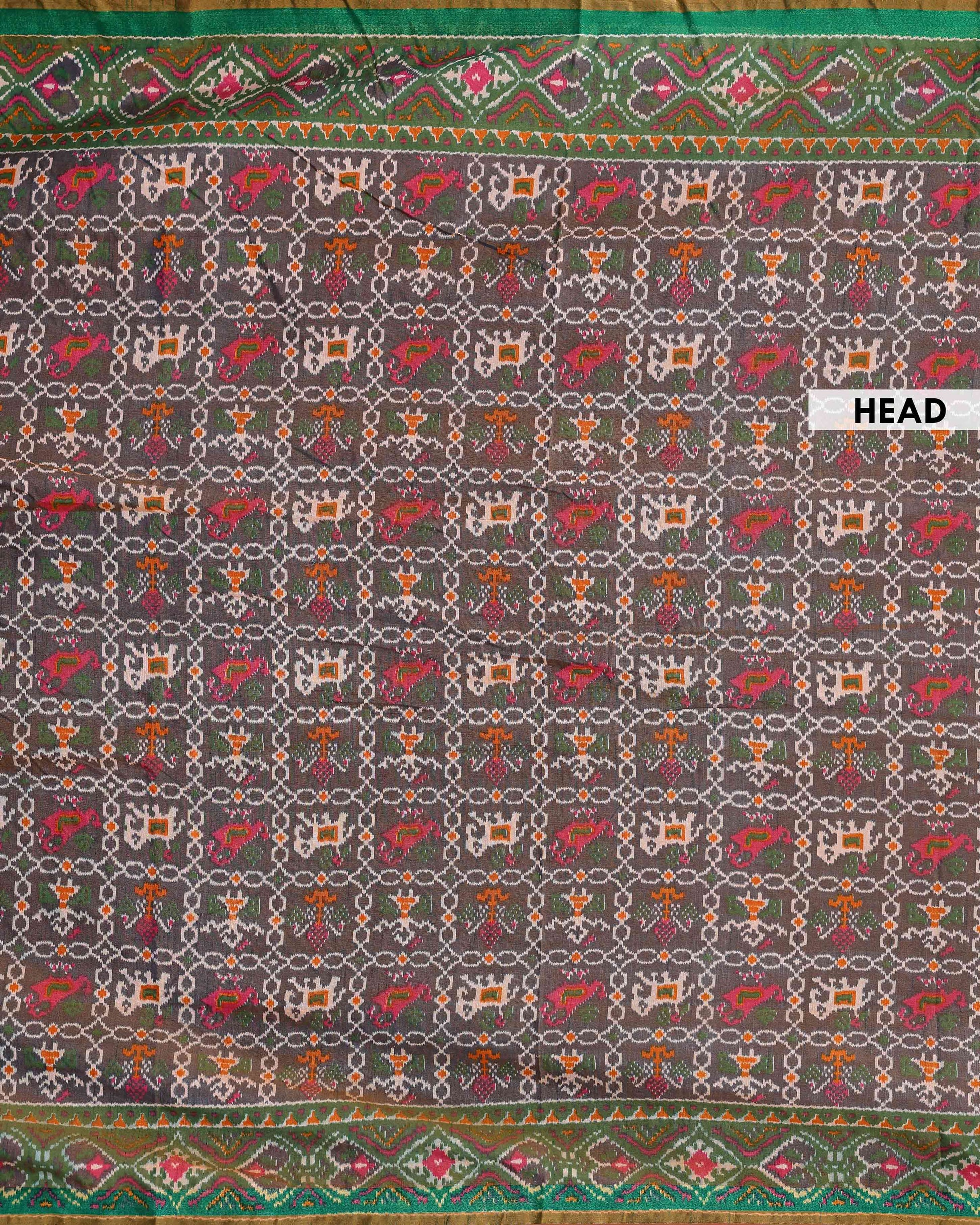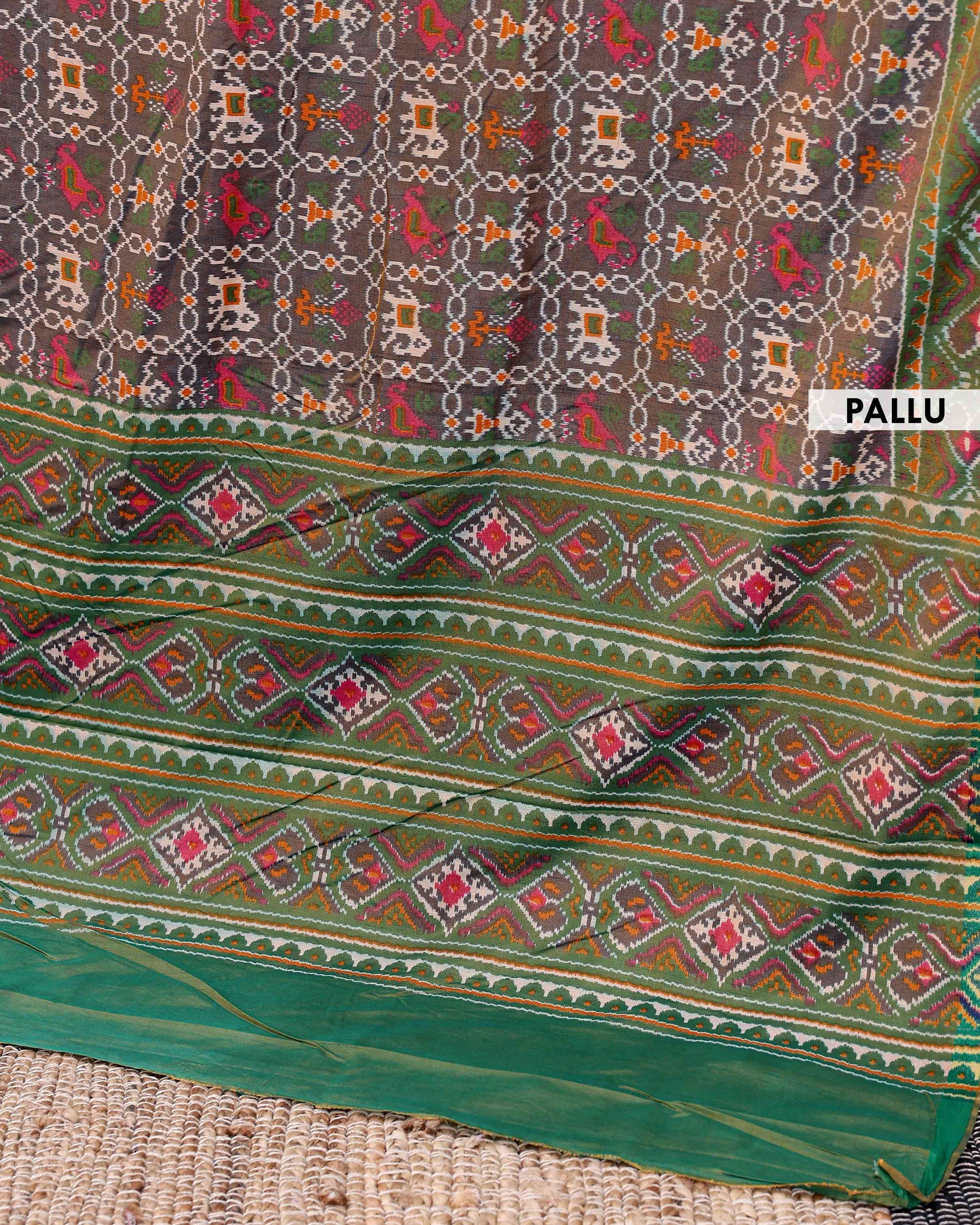 - This is a handwoven Patola silk saree intricate geometric patterns in shades of green, pink, and brown