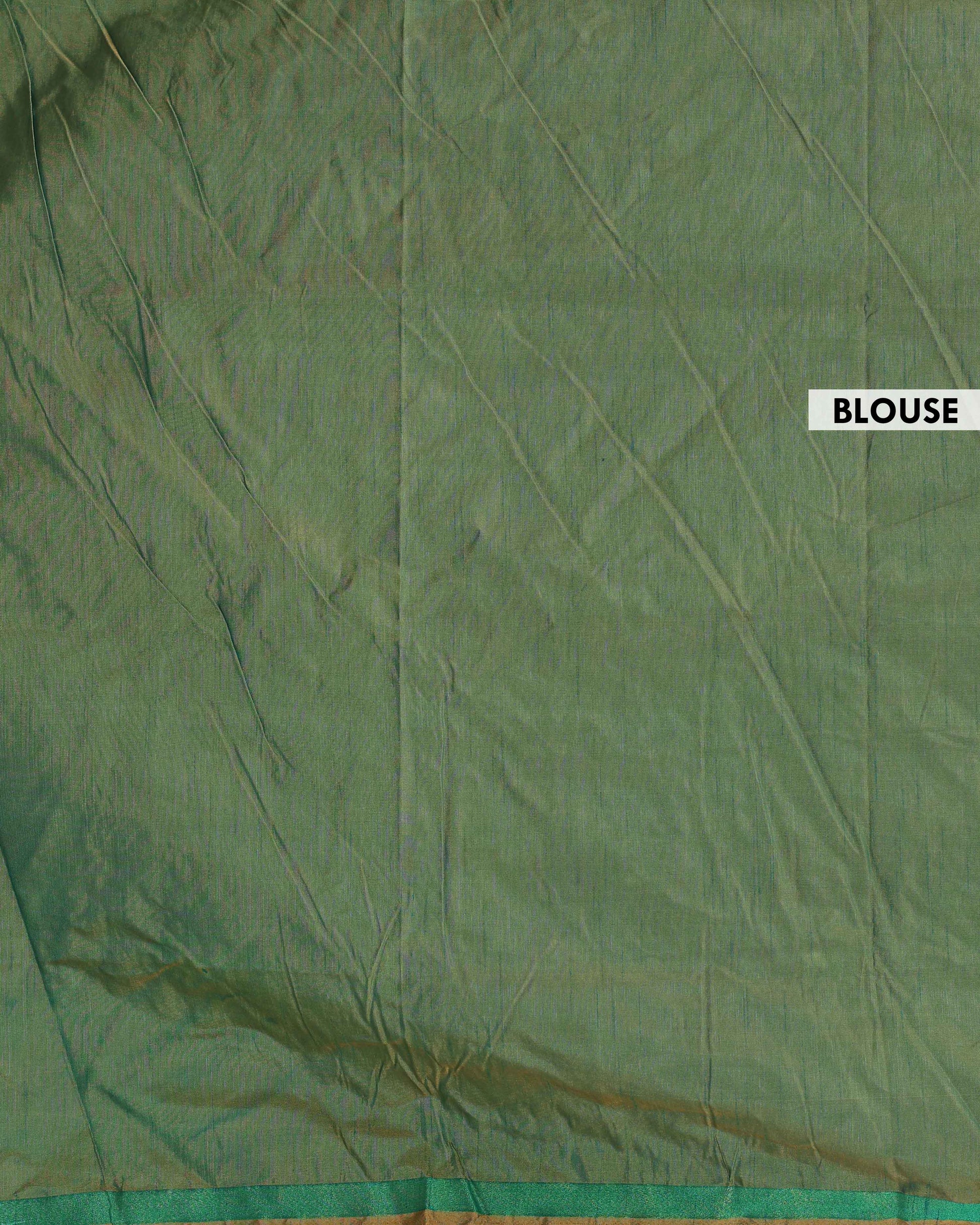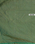 The saree is highlighted by a rich green border with a detailed geometric design, making it a perfect choice for festive occasions and celebrations.