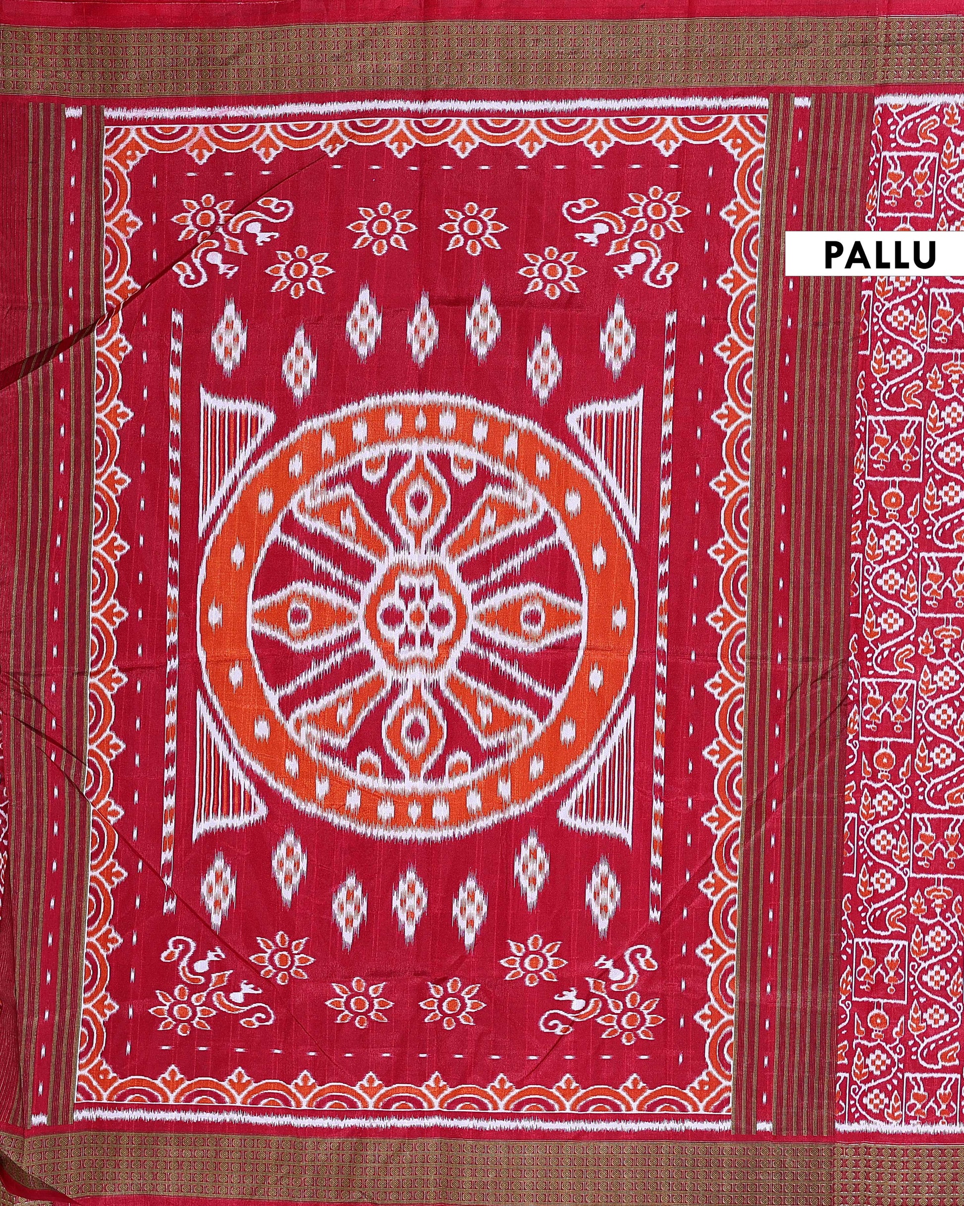 - This handwoven Pochampally Ikkat silk saree showcases the intricate geometric patterns and vibrant colors