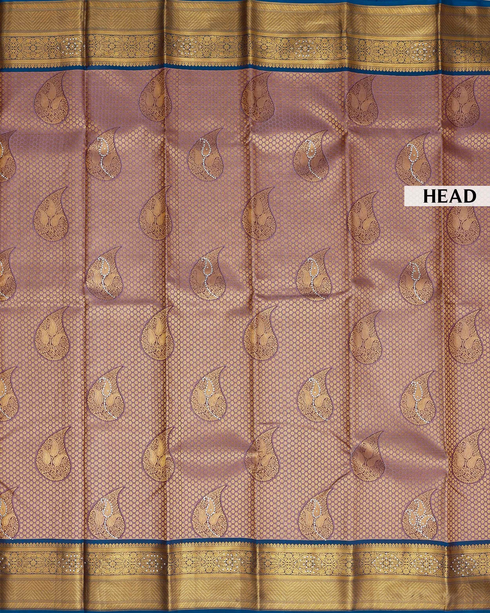 - Elevate your style with this stunning Kanchipuram pure silk saree, a luxurious lavender body with intricate gold zari work