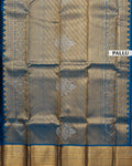 The rich, contrasting blue border and pallu, adorned with traditional motifs, make it perfect for weddings and festive occasions