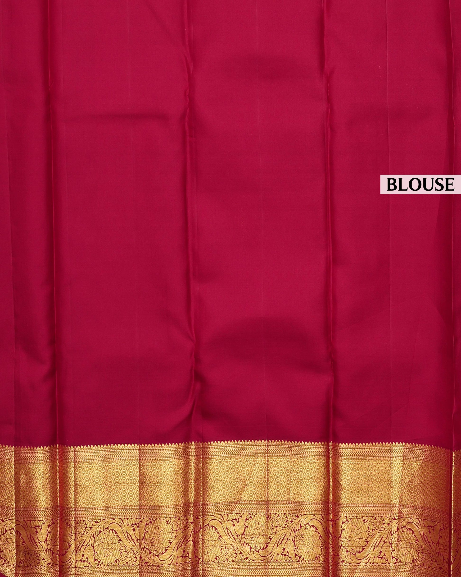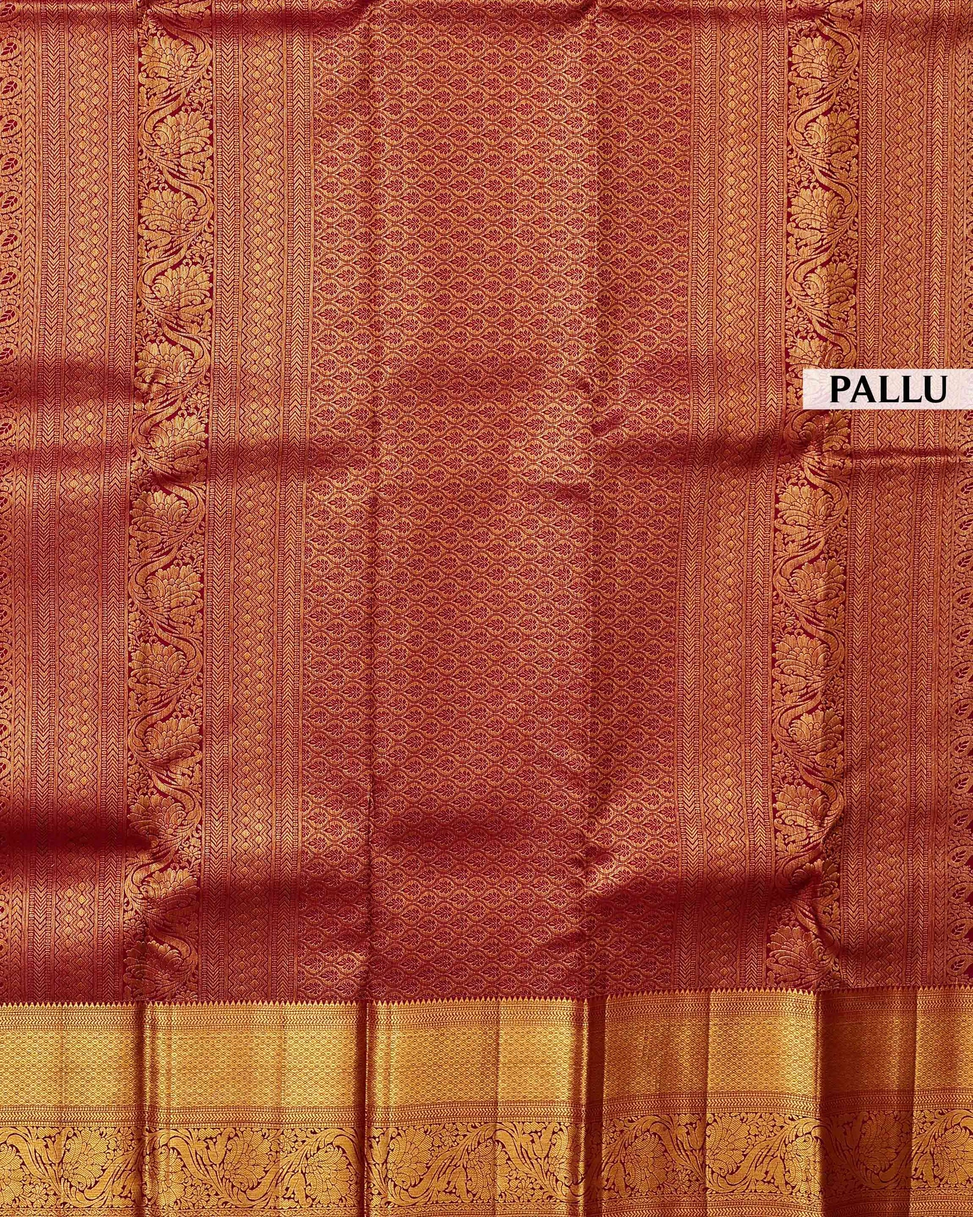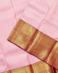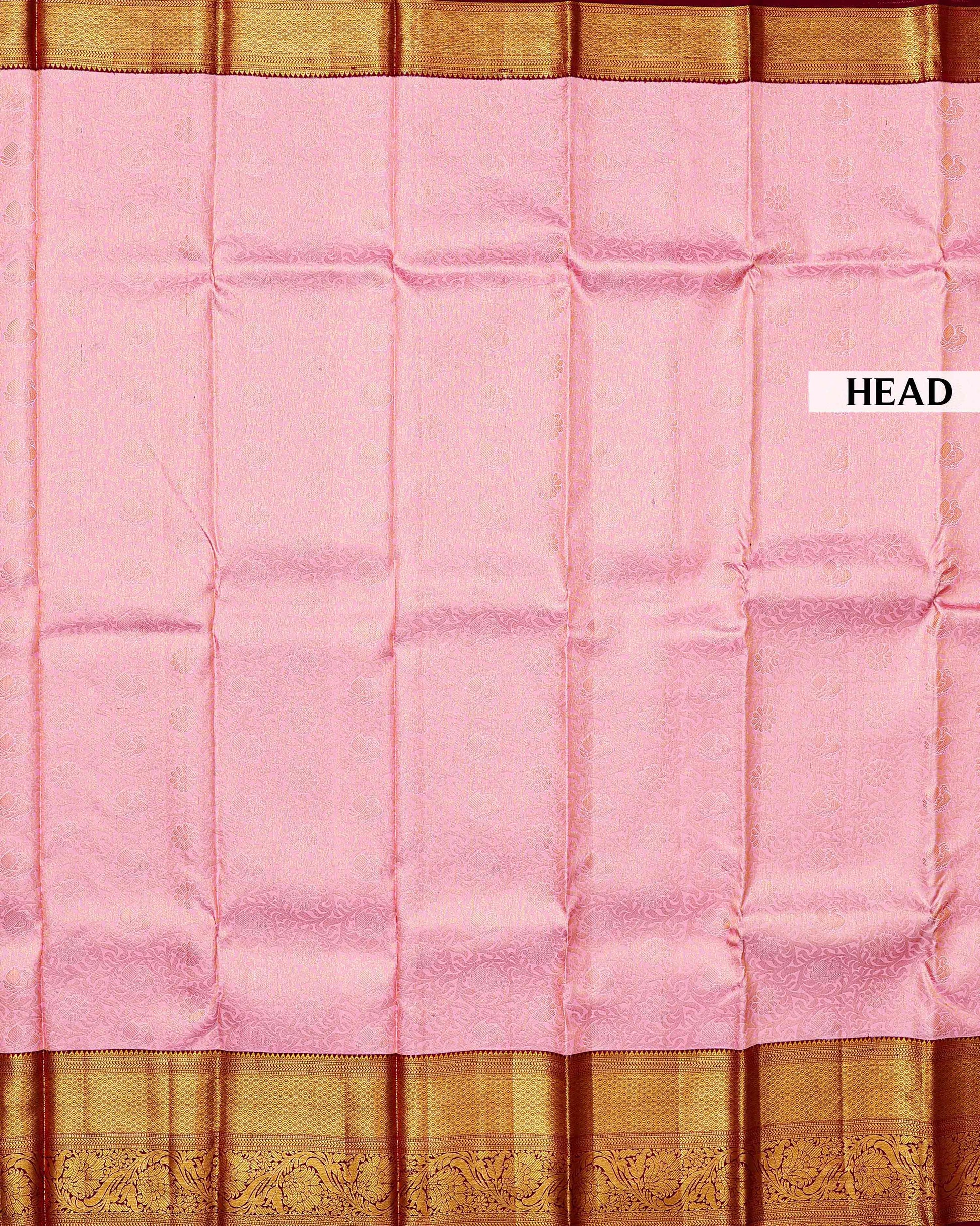 - This elegant baby pink Kanchipuram Pure silk saree a rich, intricately woven gold and maroon zari border.