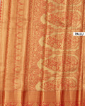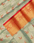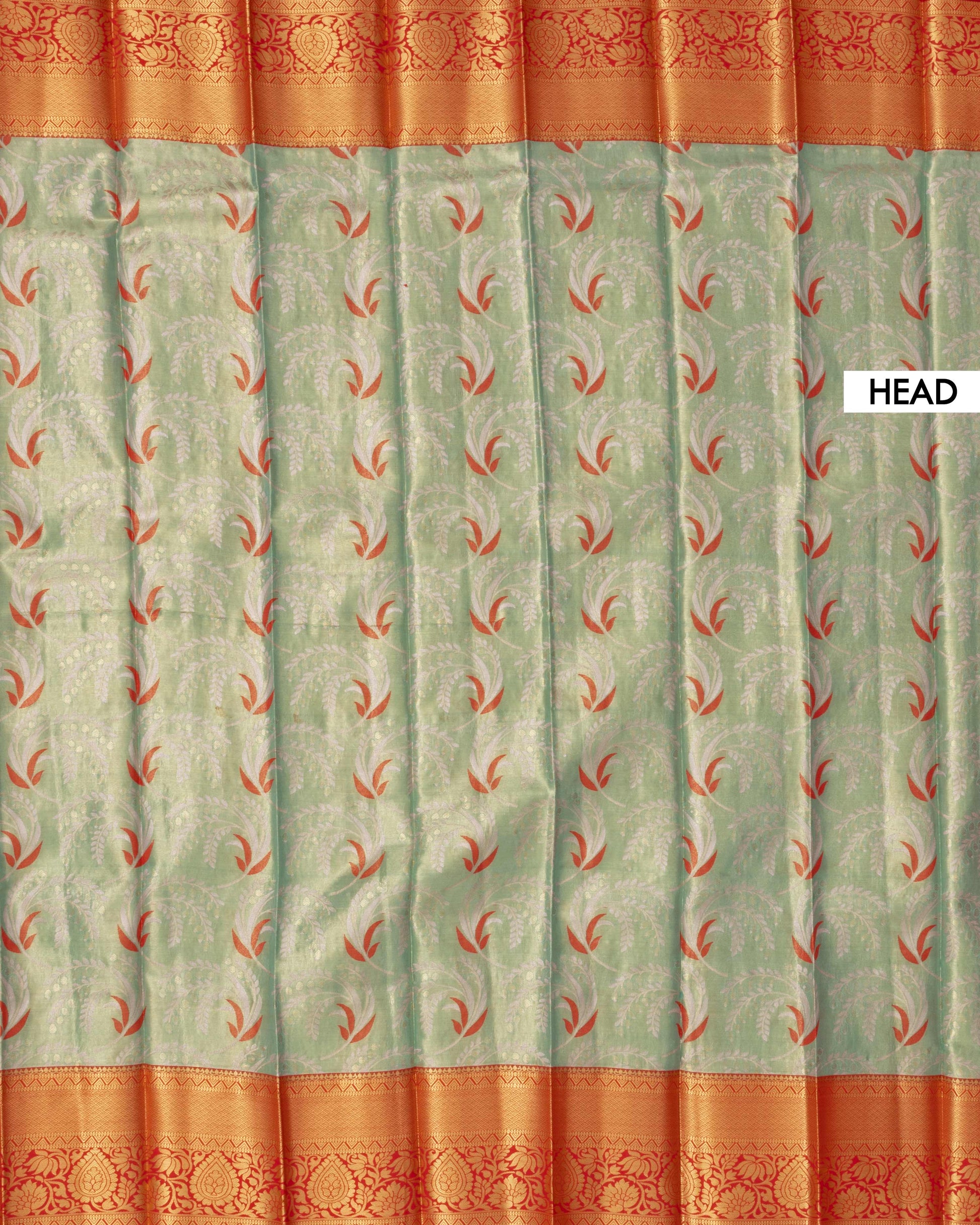 - This elegant Kanchipuram Tissue silk saree a pastel sea green body with intricate floral designs.