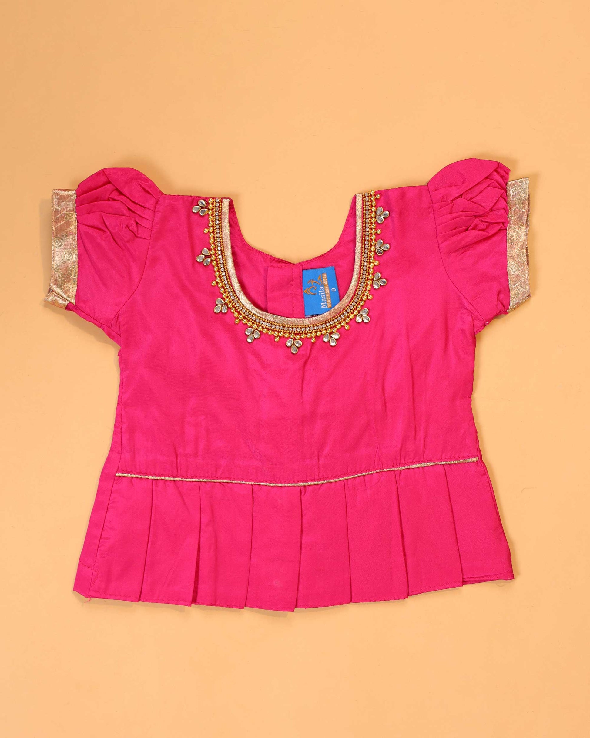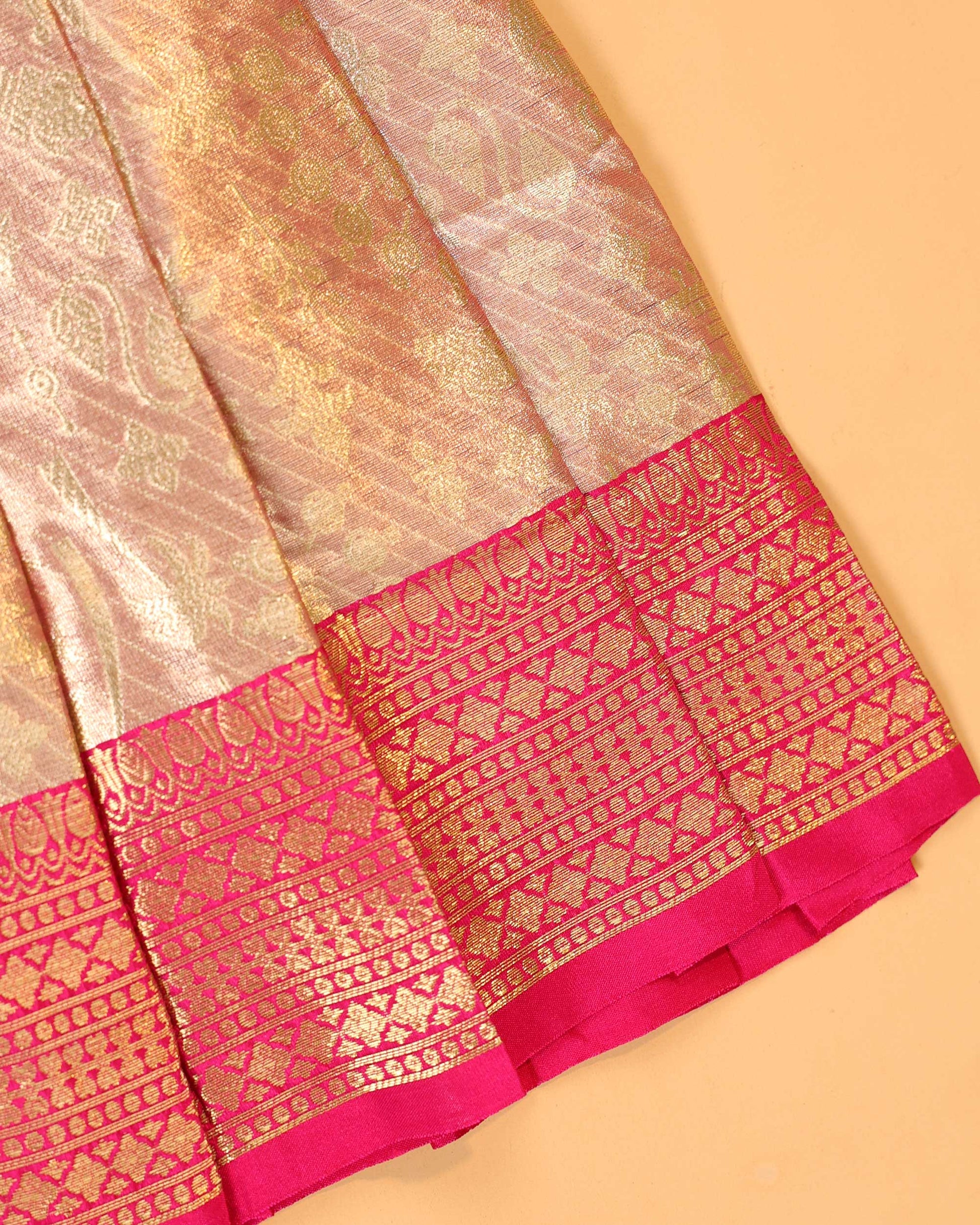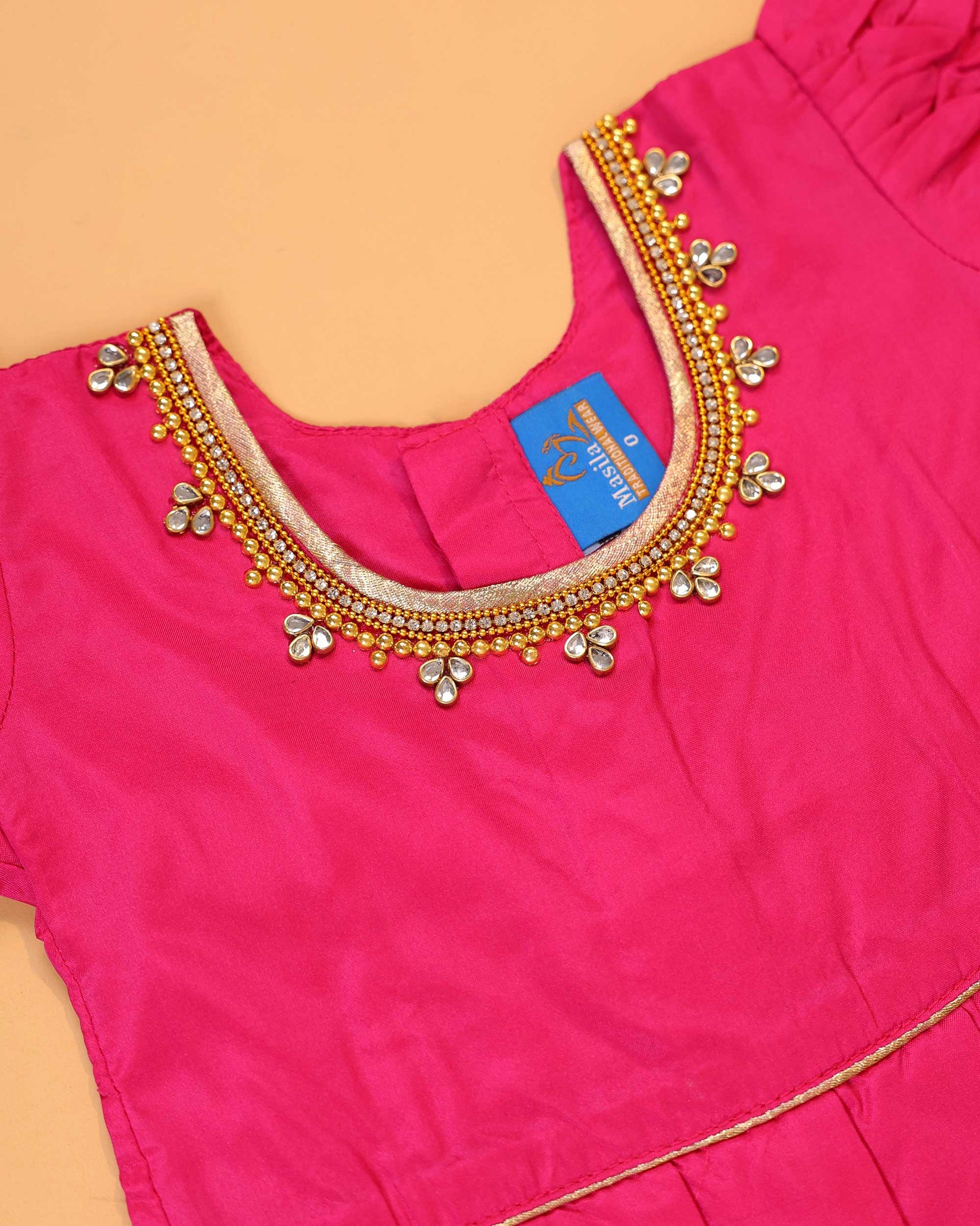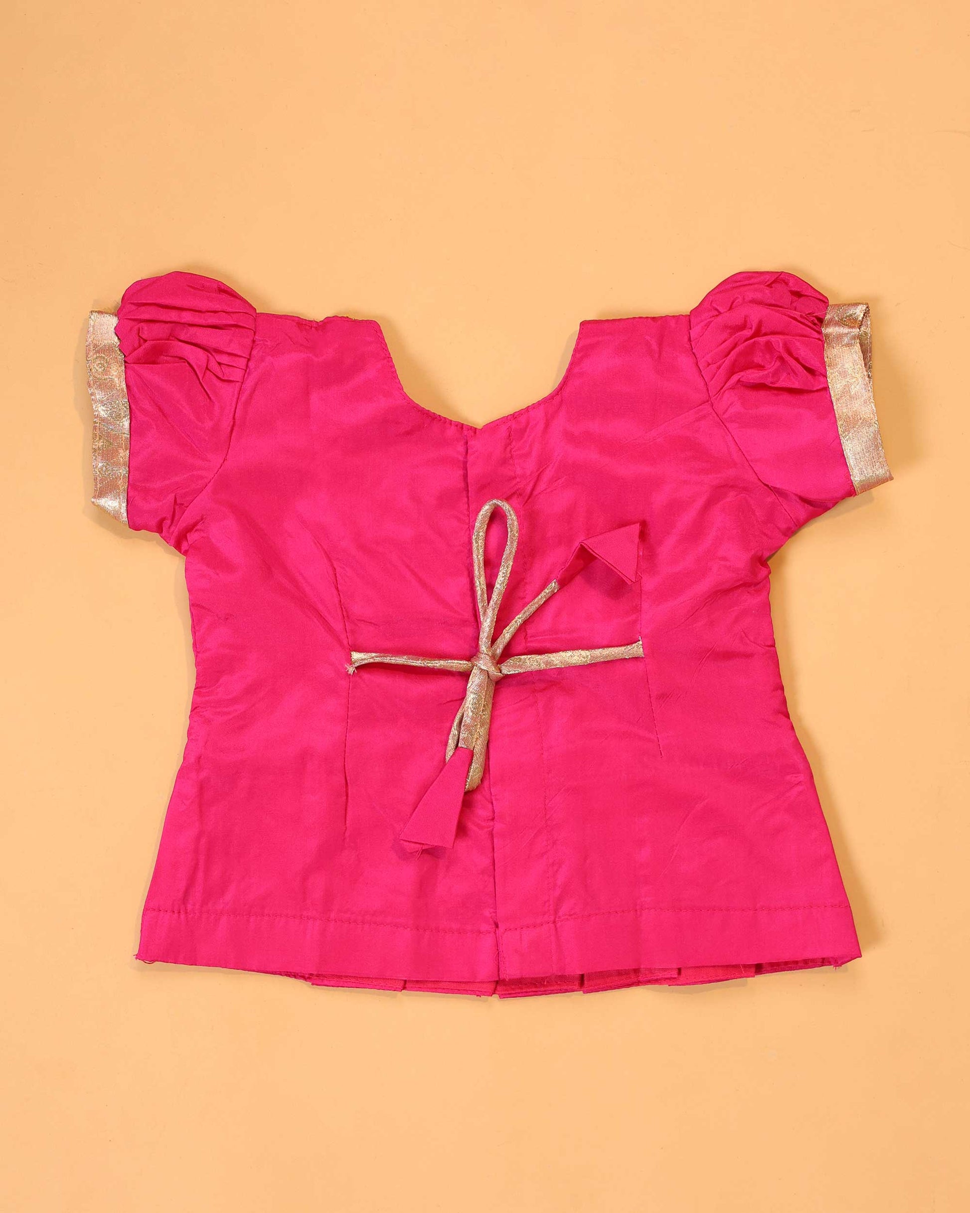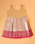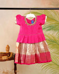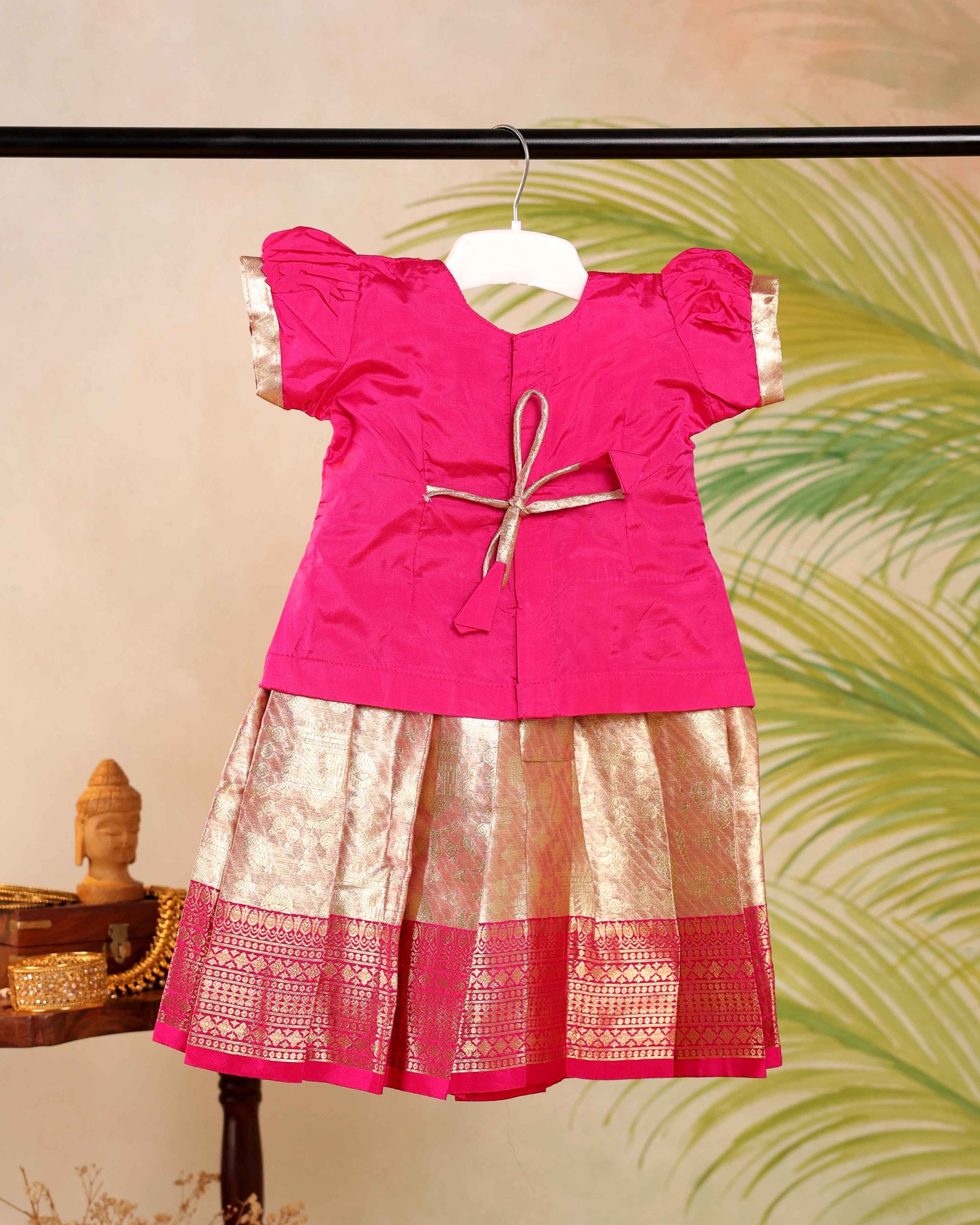 Kids Pattu Pavadai Readymade a Traditional Ethnic Gown with a Zari Border & Puff Sleeves - Pink