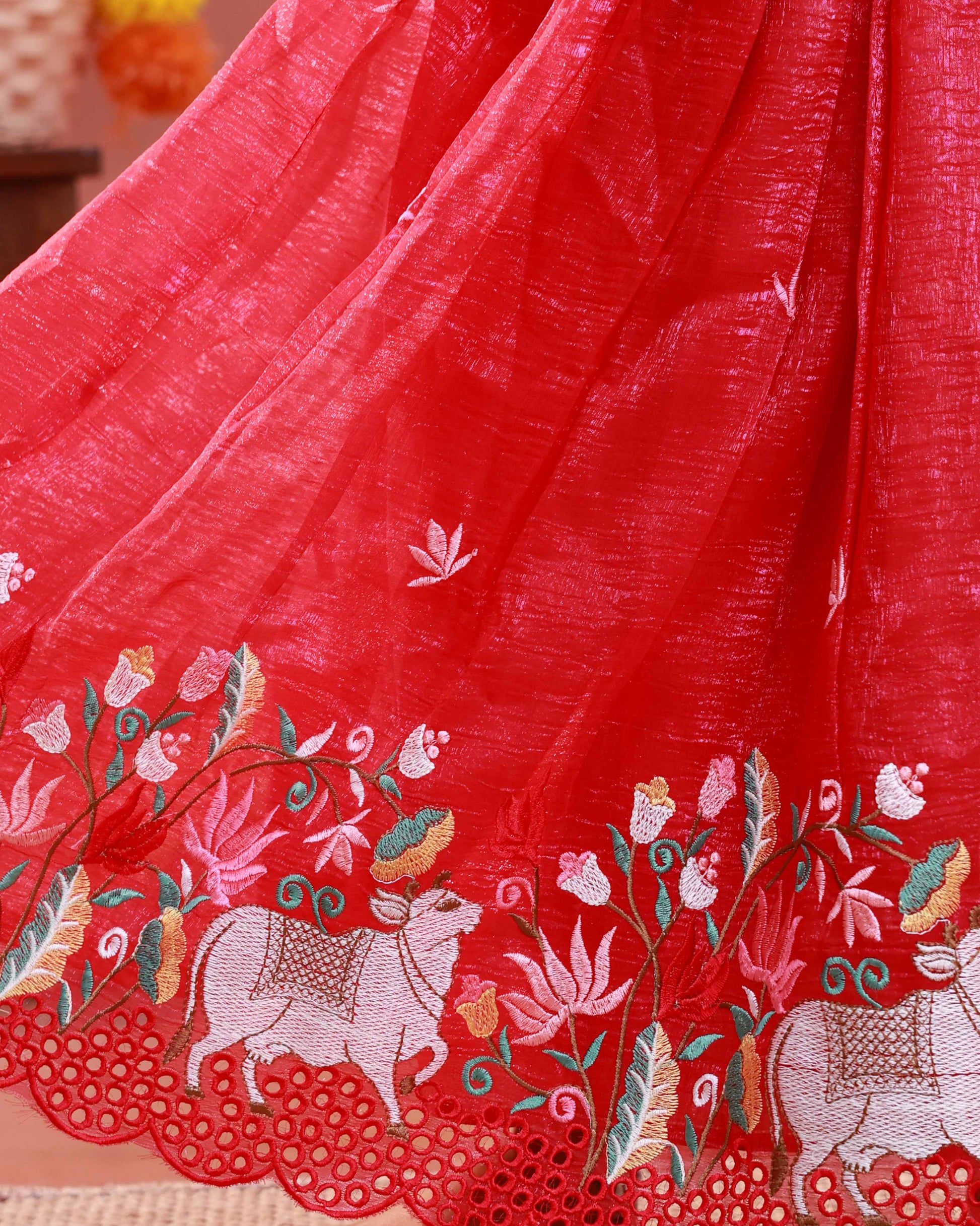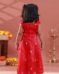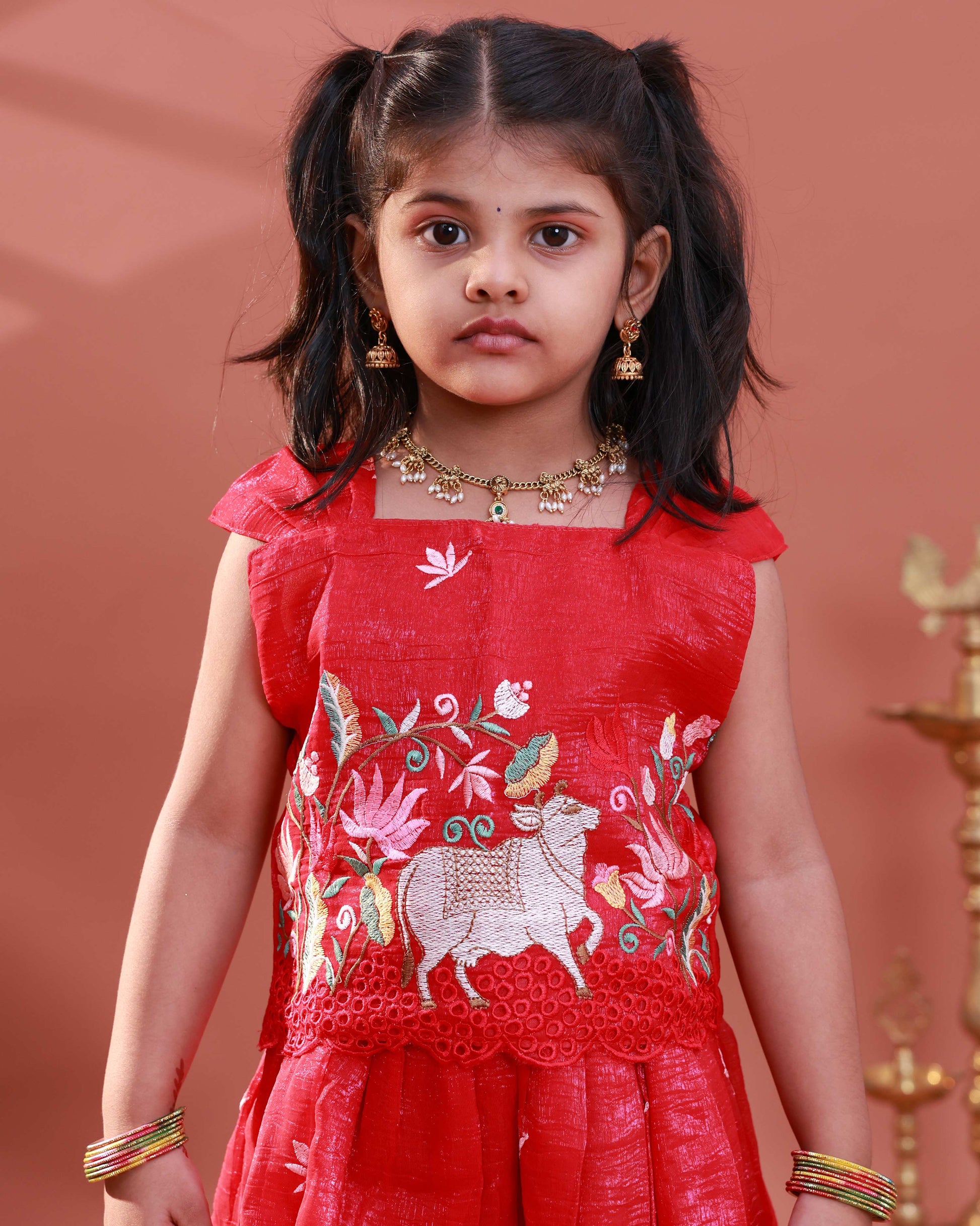Traditional Kids Pattu Pavadai Readymade for Girls with Floral Embroidery - Red