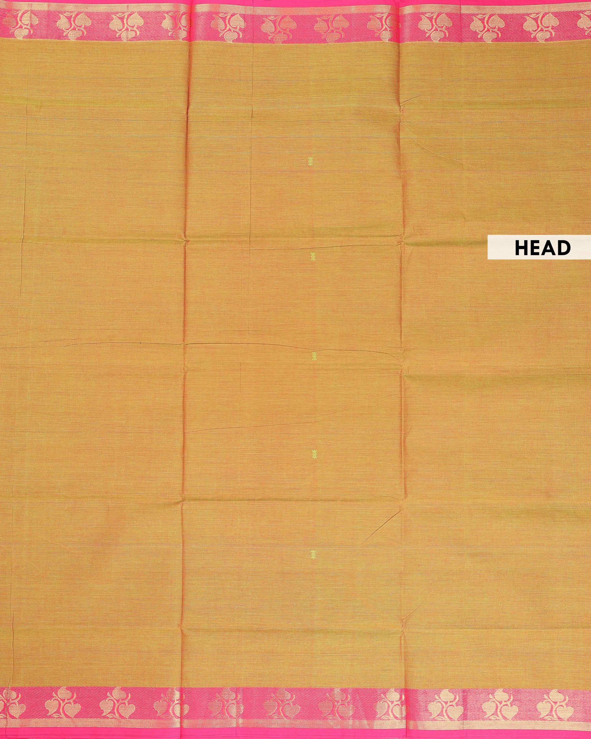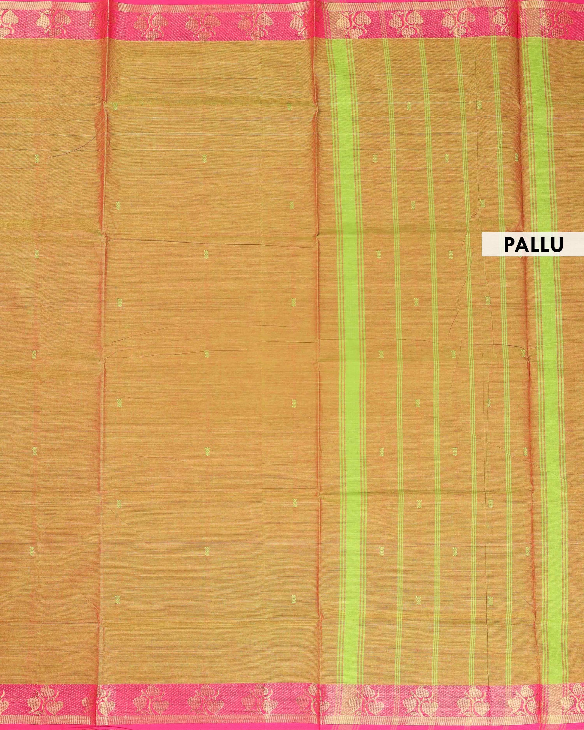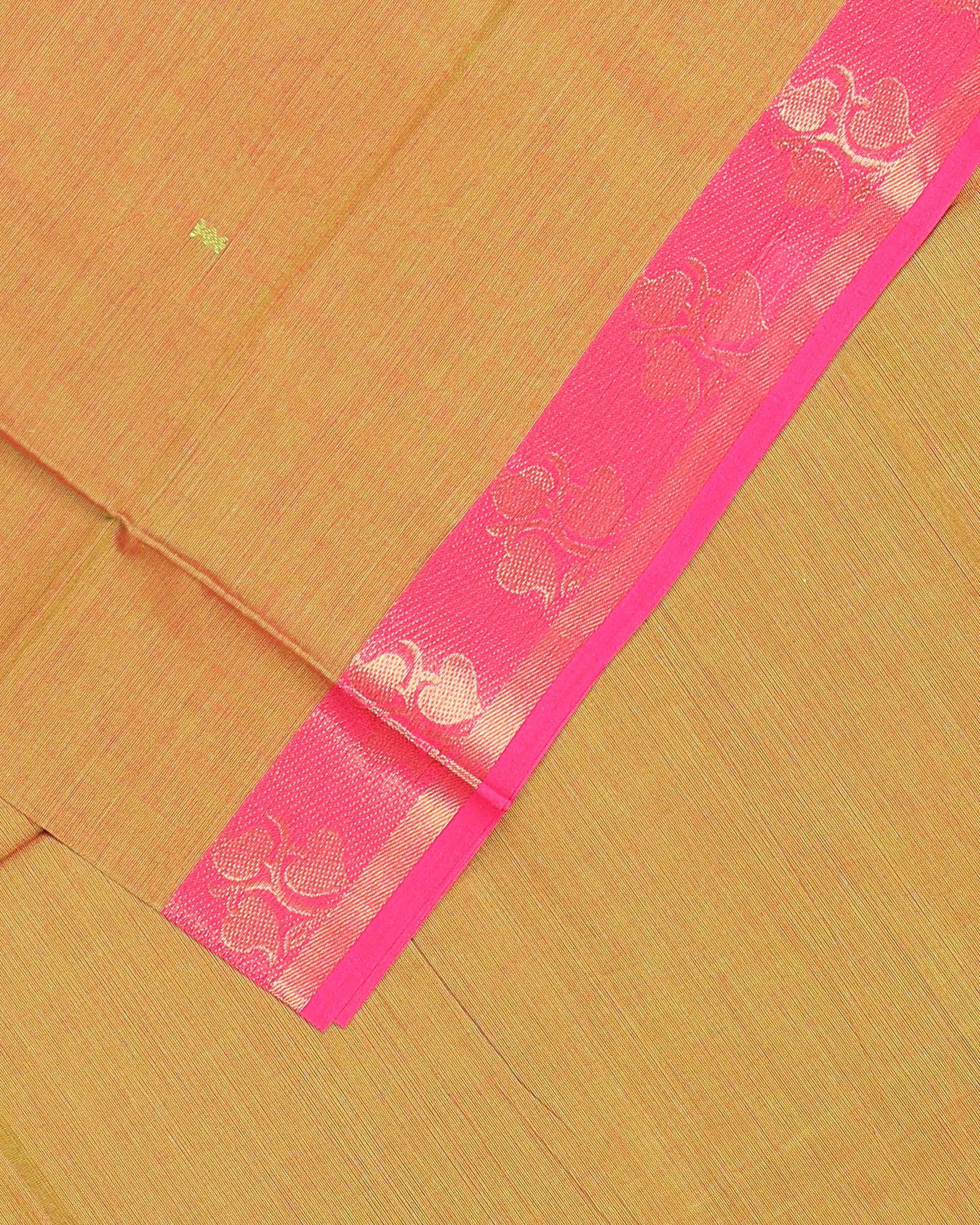 - Handloom cotton saree a subtle dual tone weave with a vibrant contrast border adorned in delicate zari motifs.