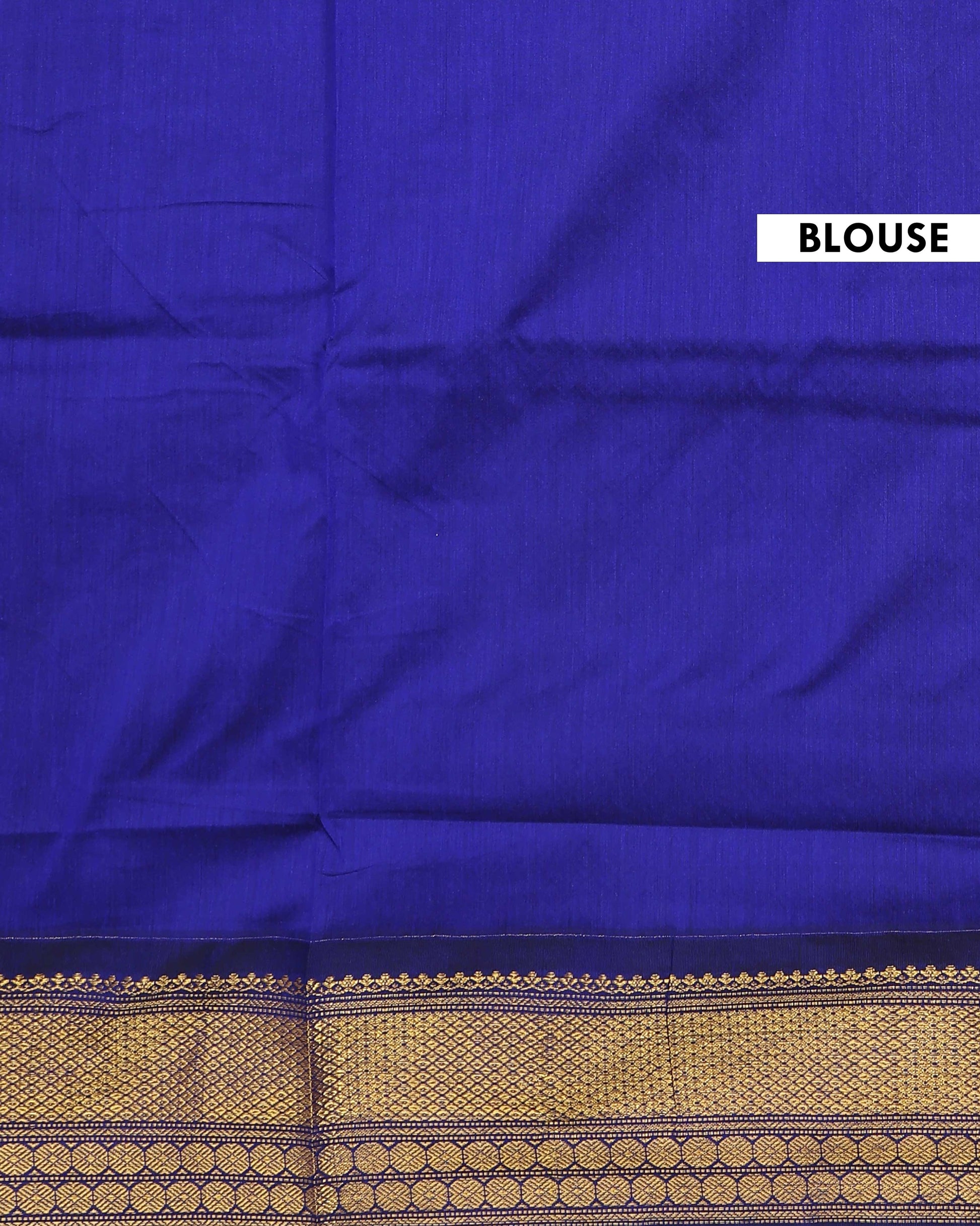 - This elegant Kalyani Cotton saree a beautiful body with a contrasting royal blue border and intricate gold zari weaving.
