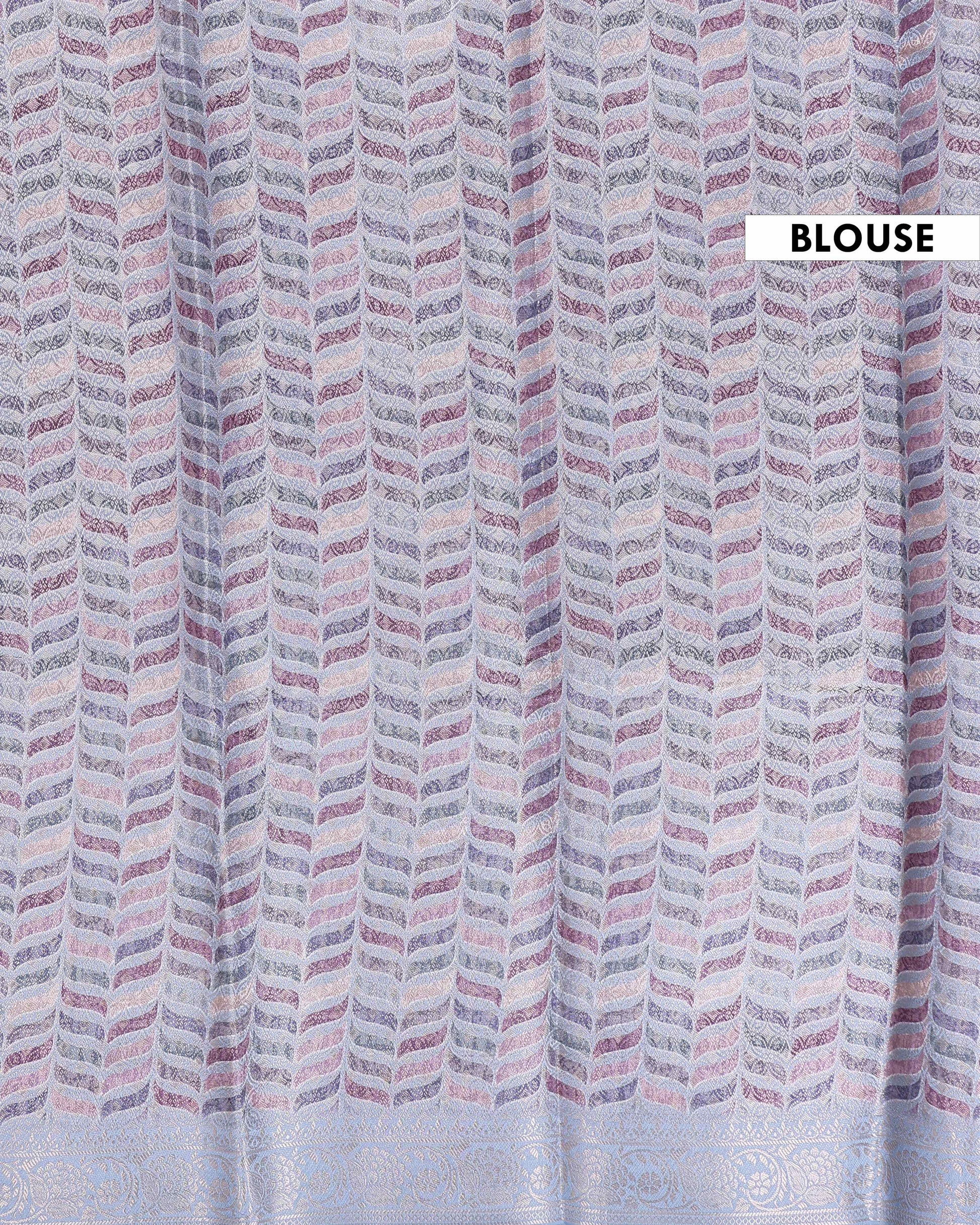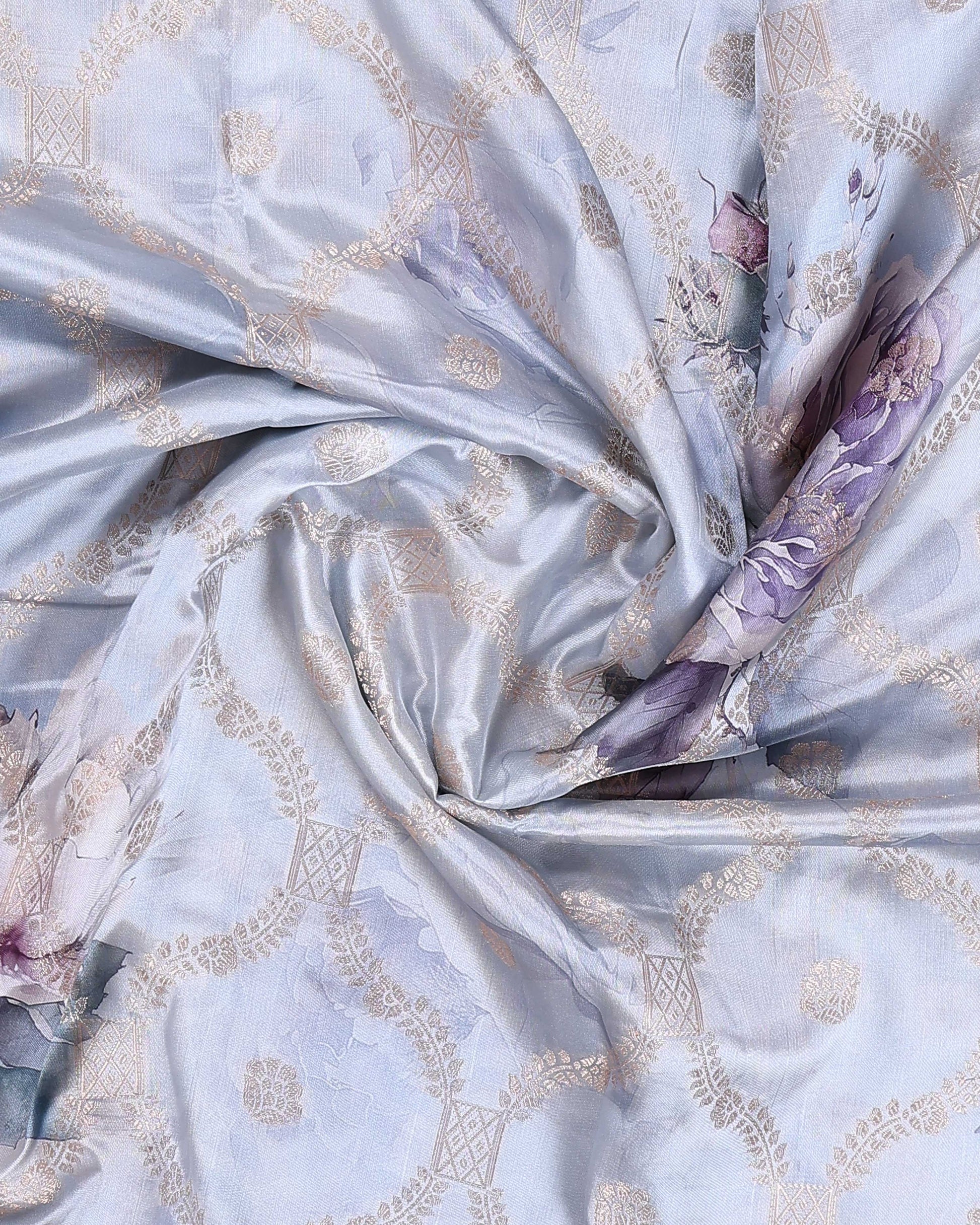 - This elegant grey Dola silk saree intricate silver zari weaving in a beautiful floral pattern making it perfect for festive occasions and celebrations.