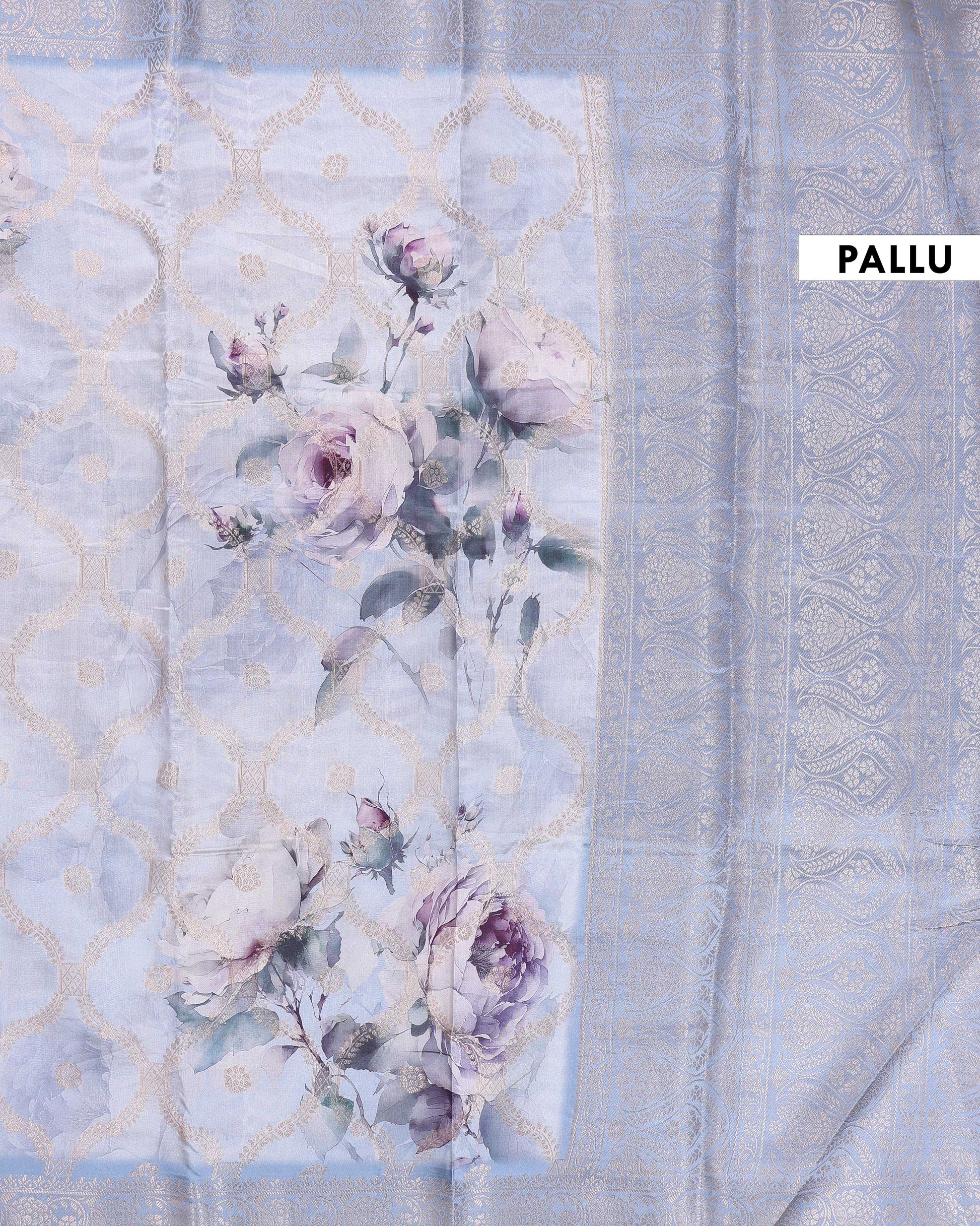 Floral Pattern Dola Silk Saree With Woven Border - Grey