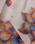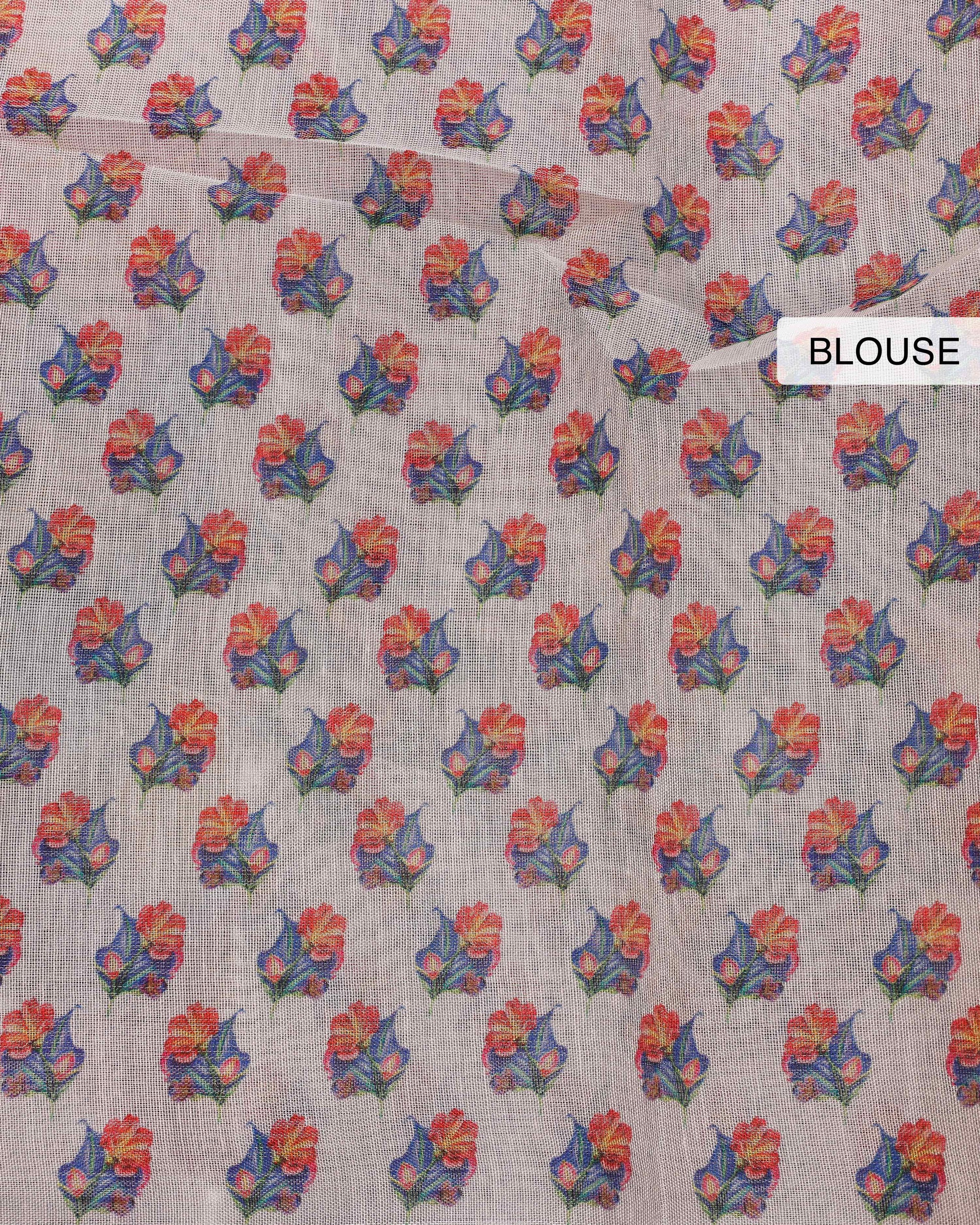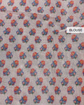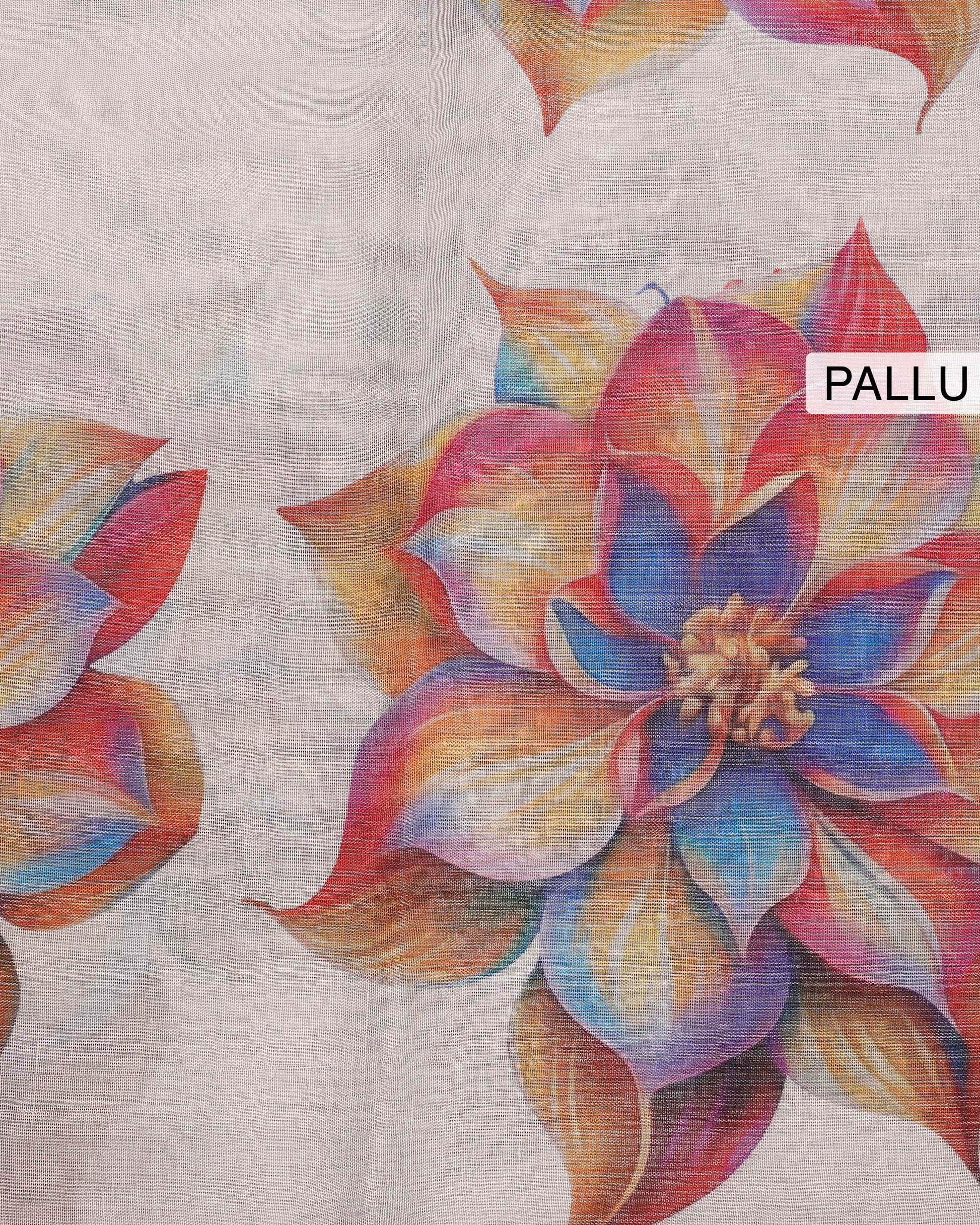 - This light grey tissue saree a vibrant, multi-colored floral print, perfect for a modern yet traditional look