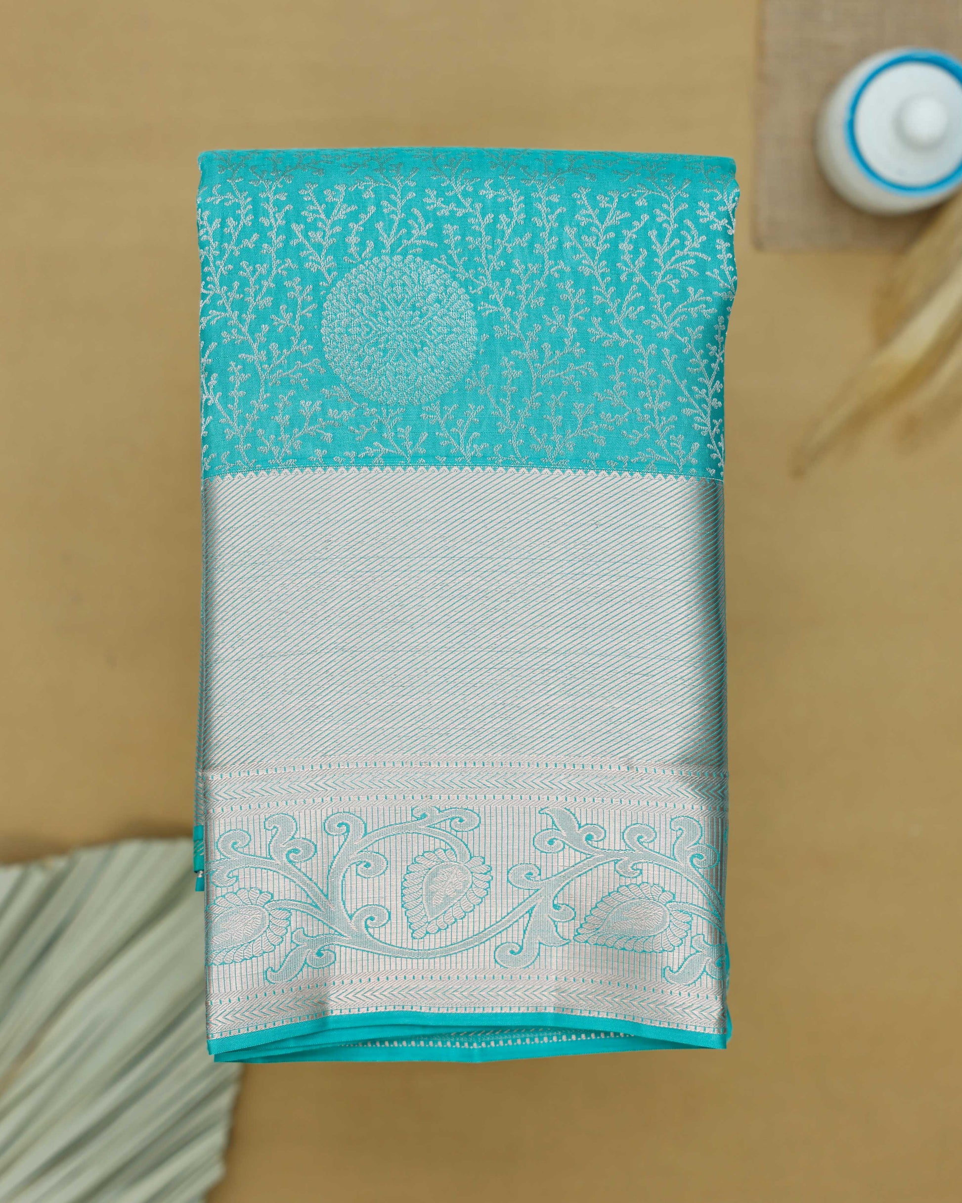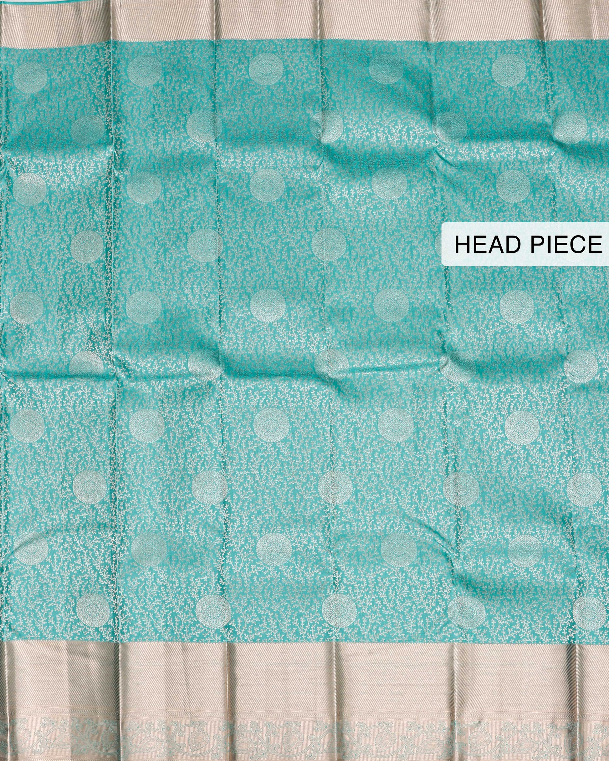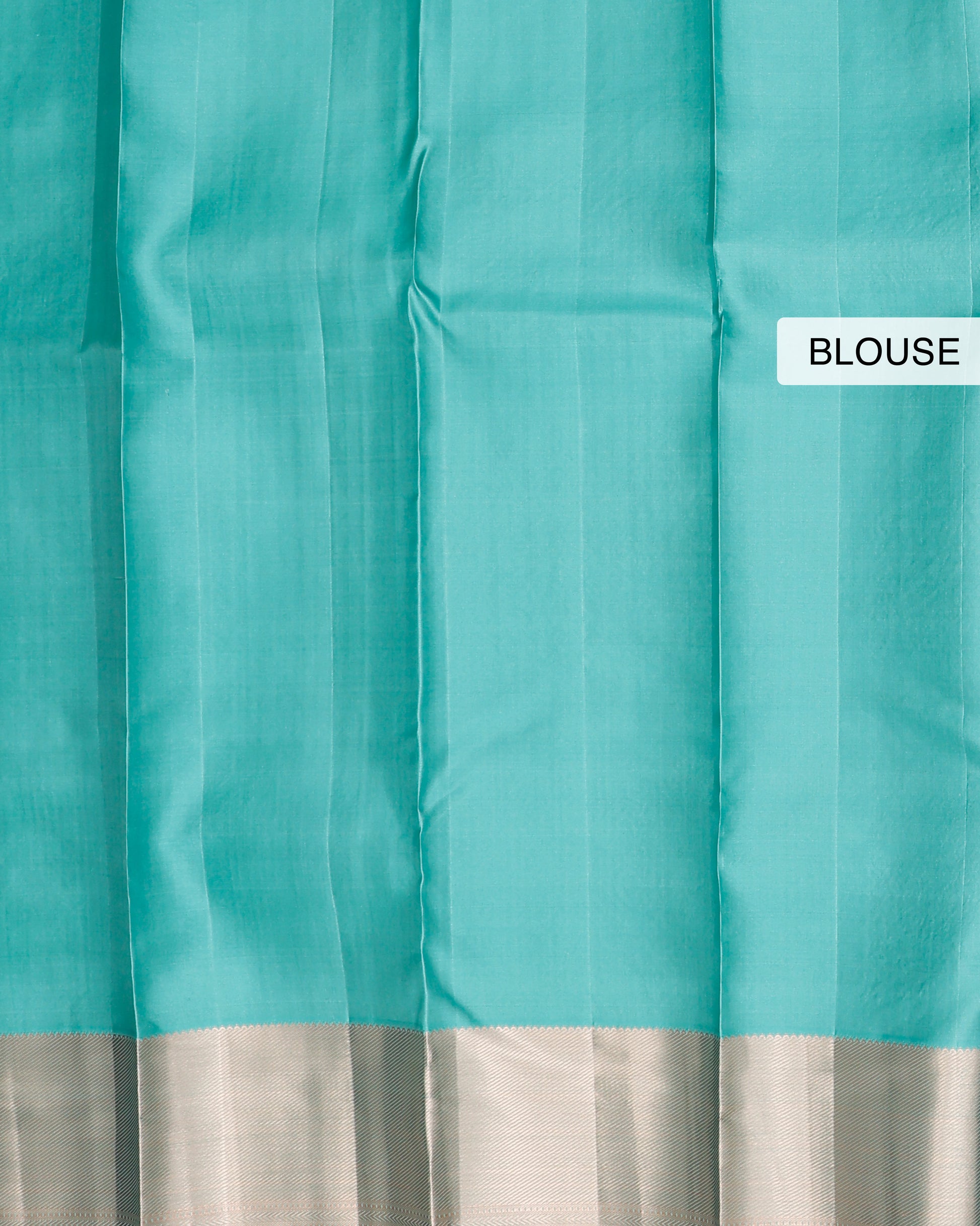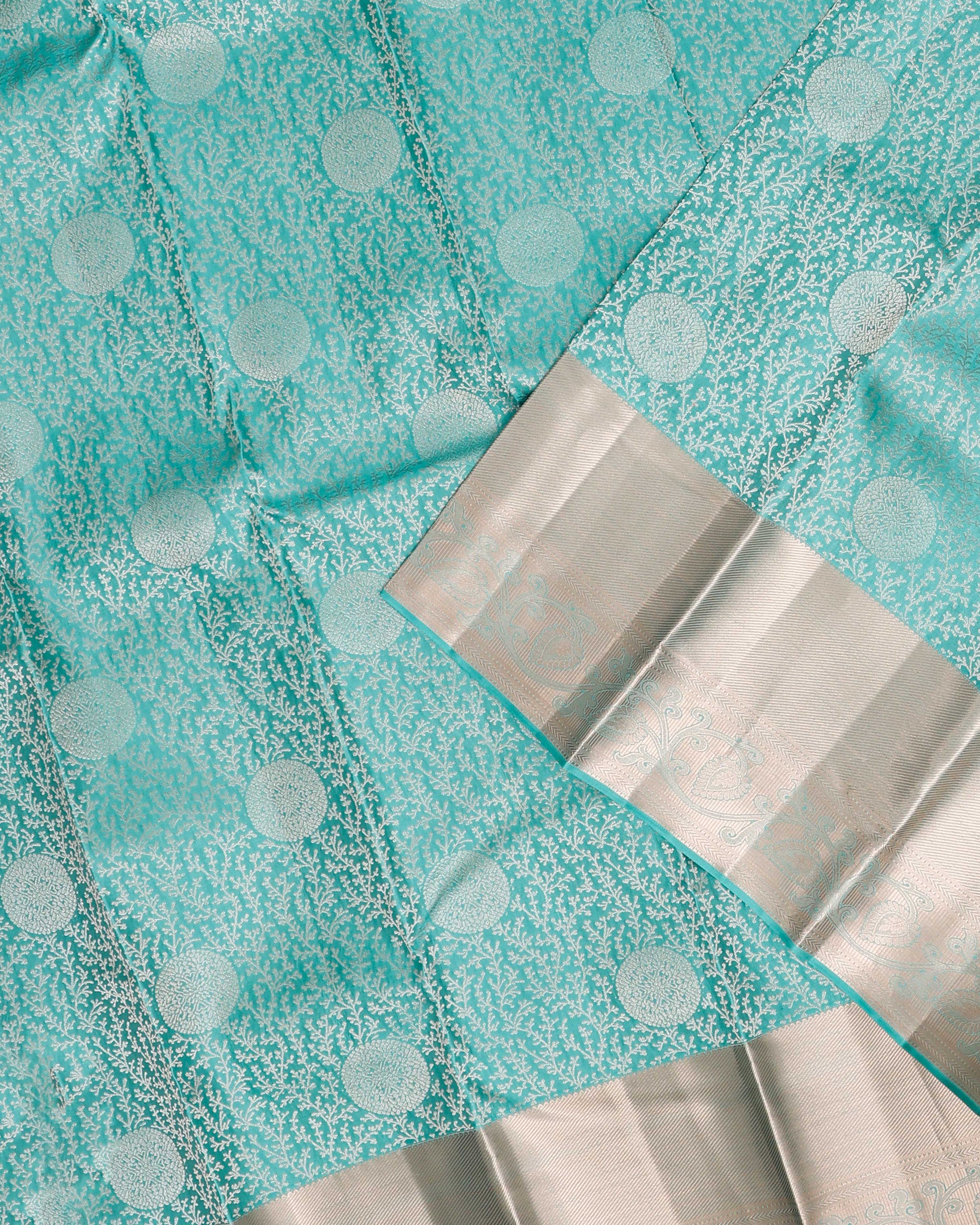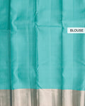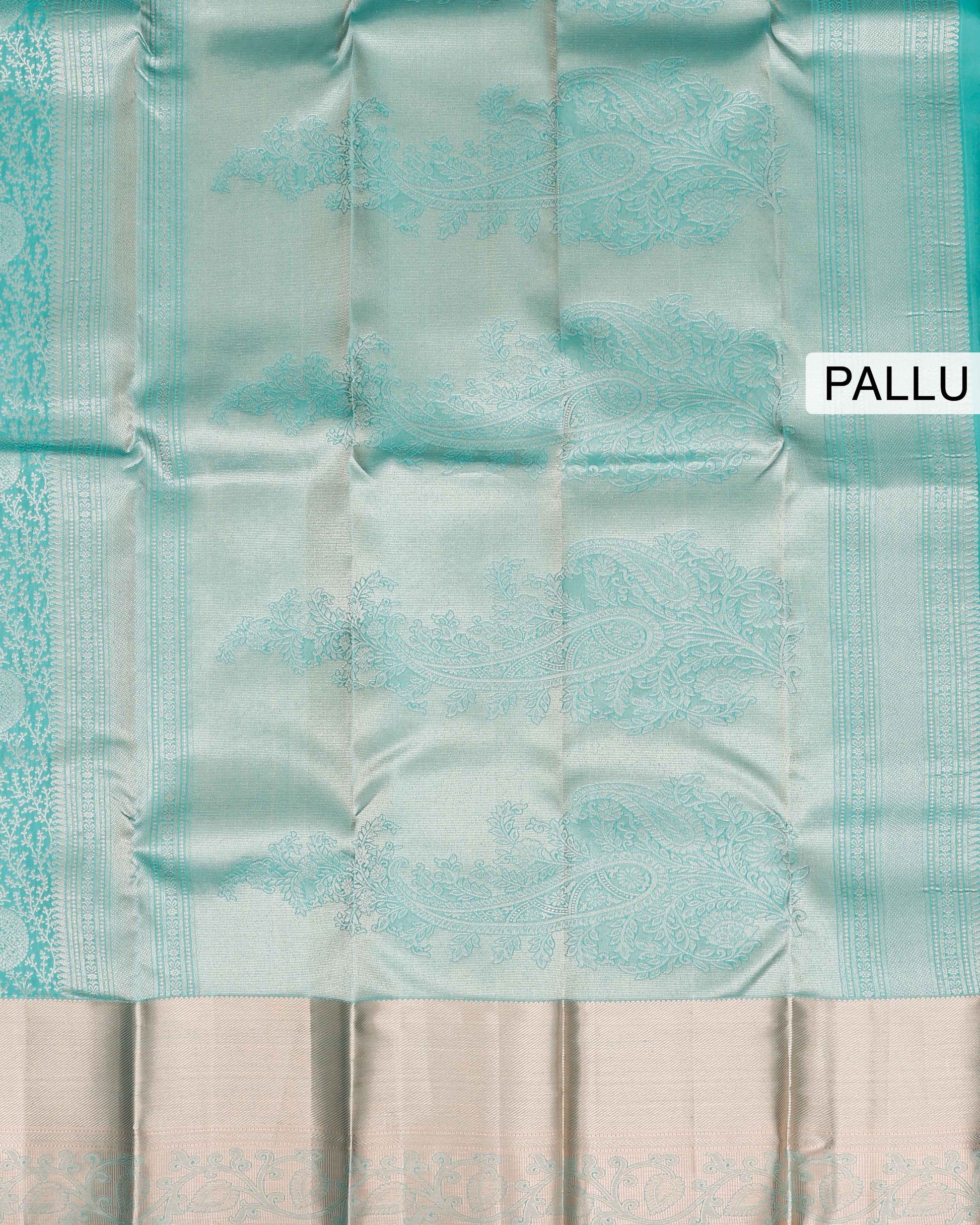 - This exquisite Niranjana Silk Saree a striking turquoise pallu with intricate silver zari weave and traditional motifs