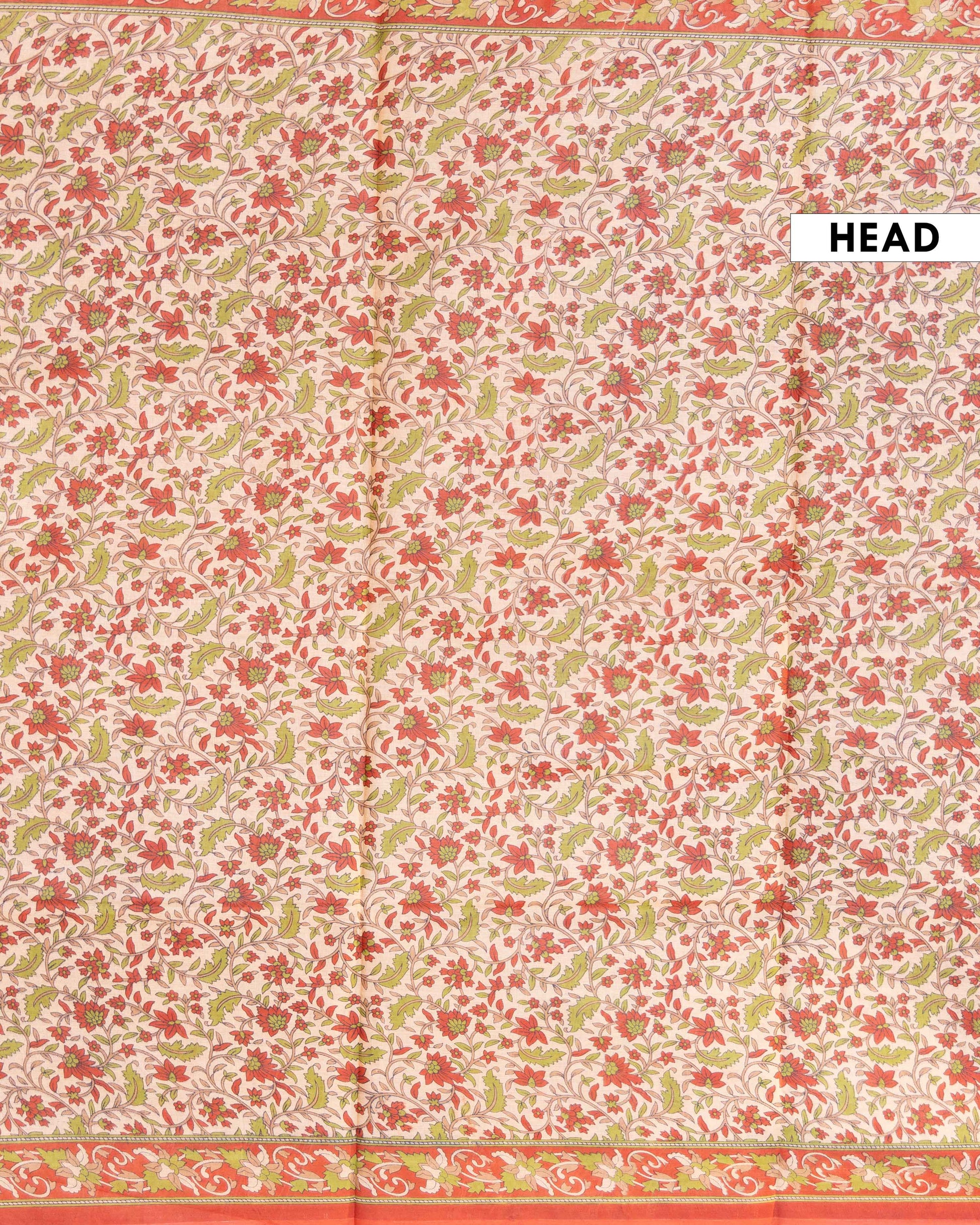 - This elegant voile cotton saree a timeless floral block print in red and green on a soft beige base.