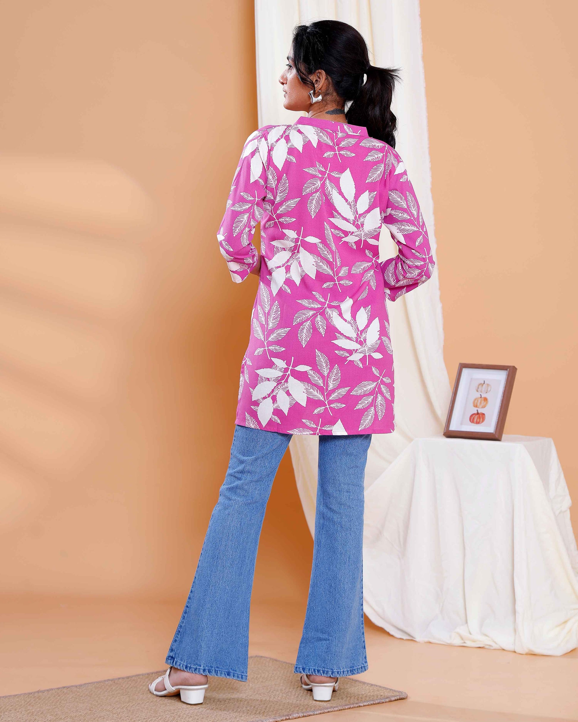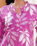 - Elevate your casual style with this vibrant magenta kurta a striking all over white leaf print.