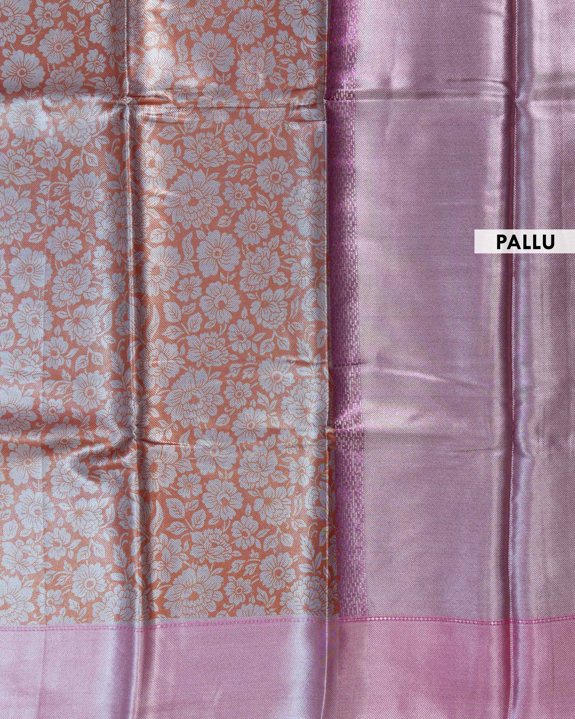 - This is a beautiful tissue silk saree a shimmering-orange body with a floral brocade pattern and a contrasting solid pink border