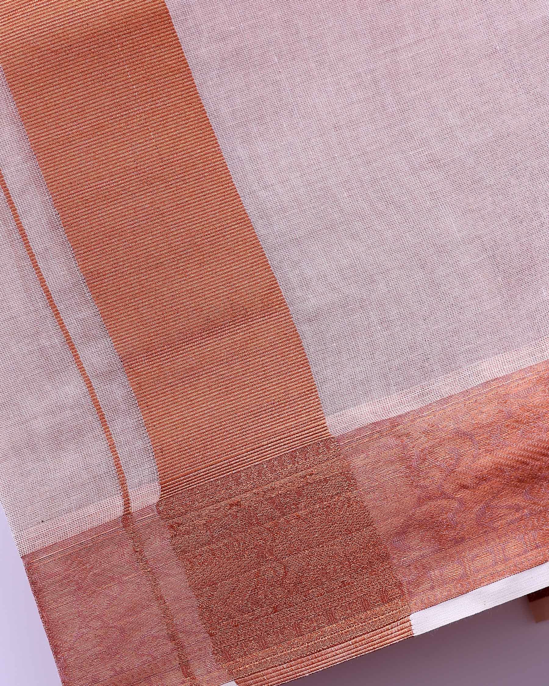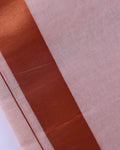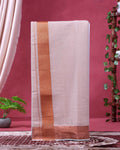 - Elevate your traditional attire with this elegant off white dhoti featuring a rich, shimmering Copper zari border.
