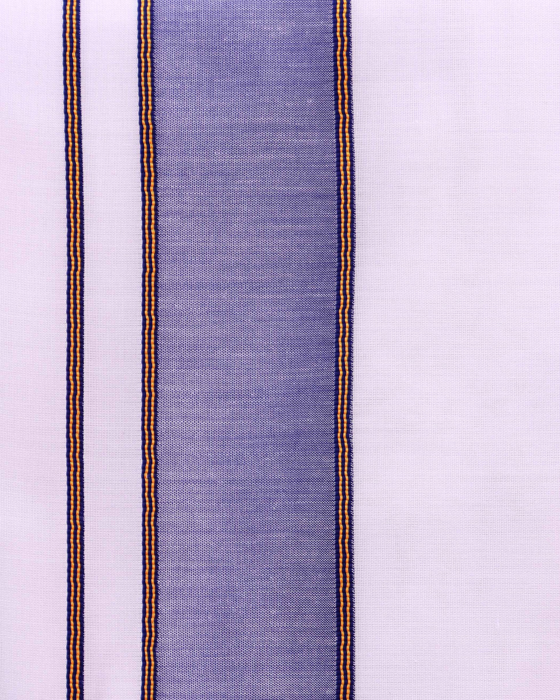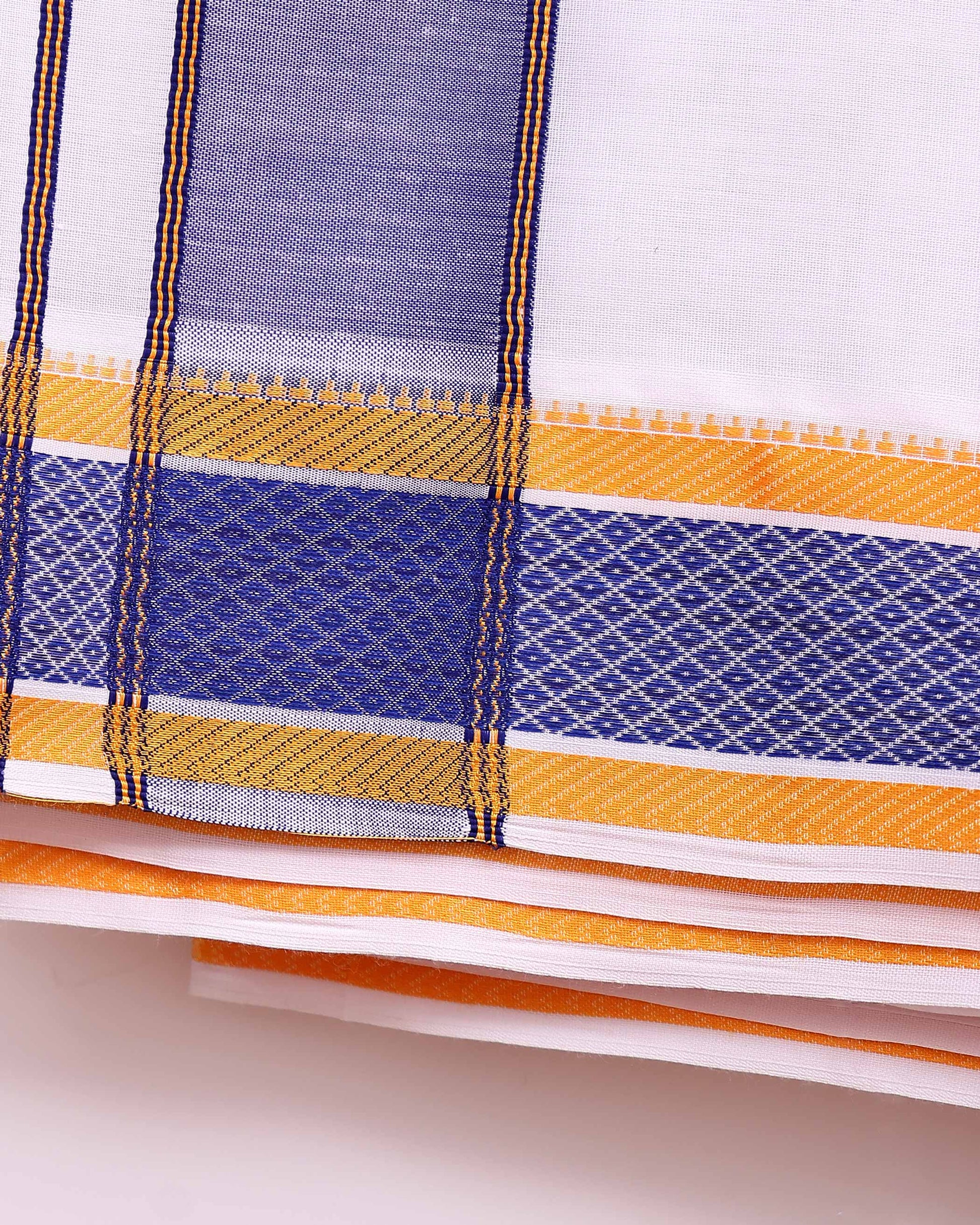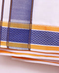Elevate your ethnic style with this premium men's white cotton dhoti an elegant blue and orange striped border.