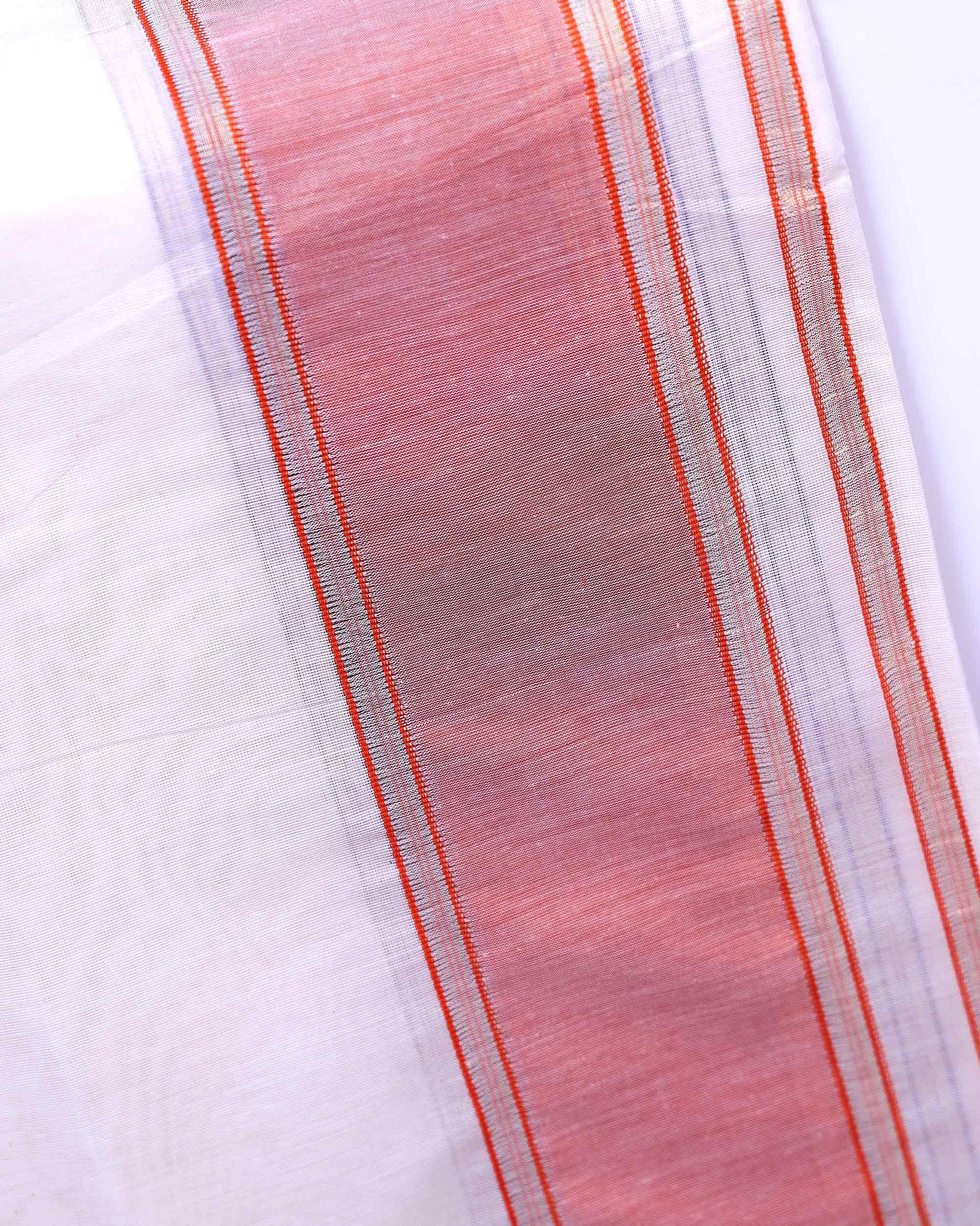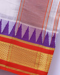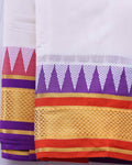 - Elevate your traditional wardrobe with this premium white cotton dhoti, featuring a stylish pink and purple border.