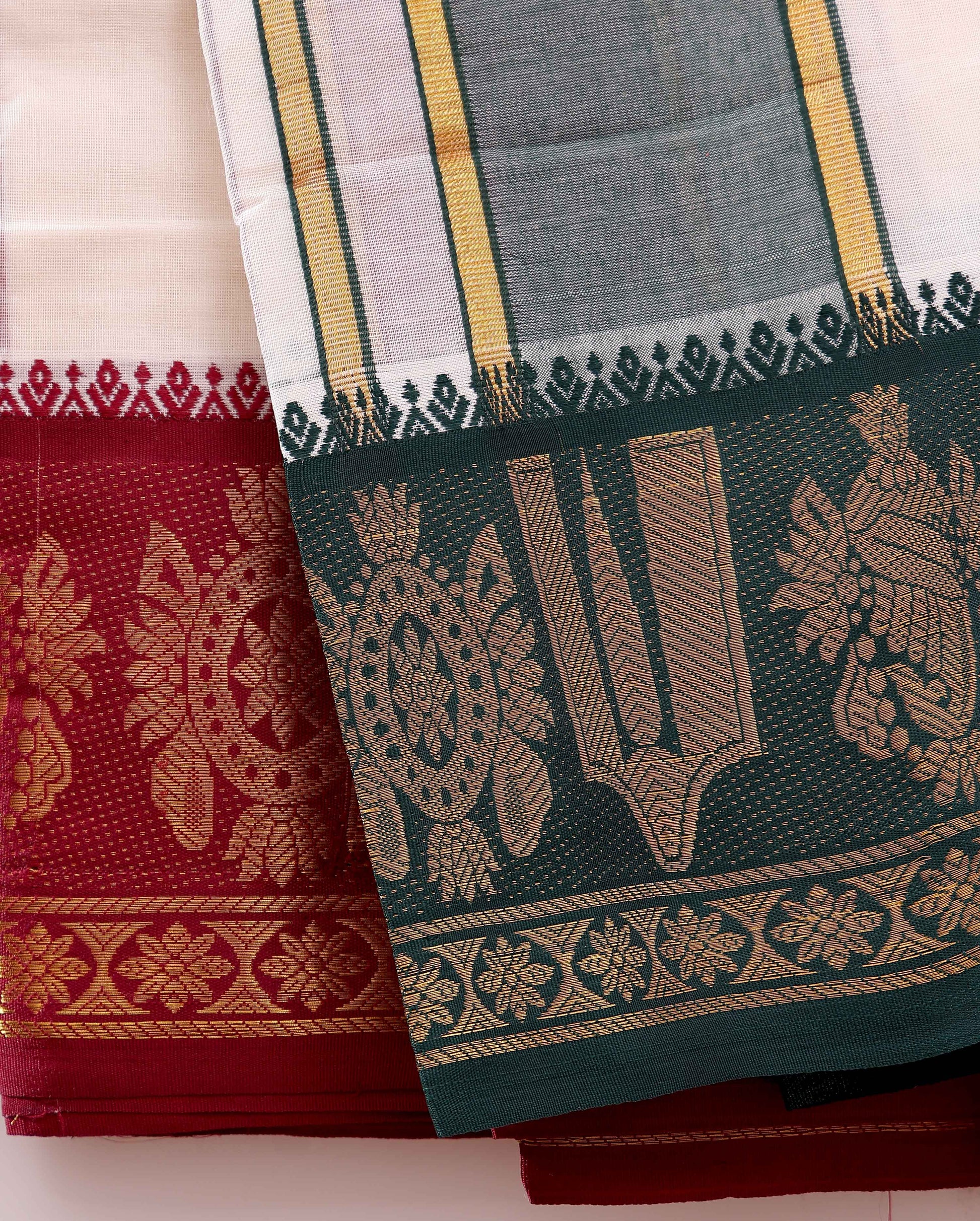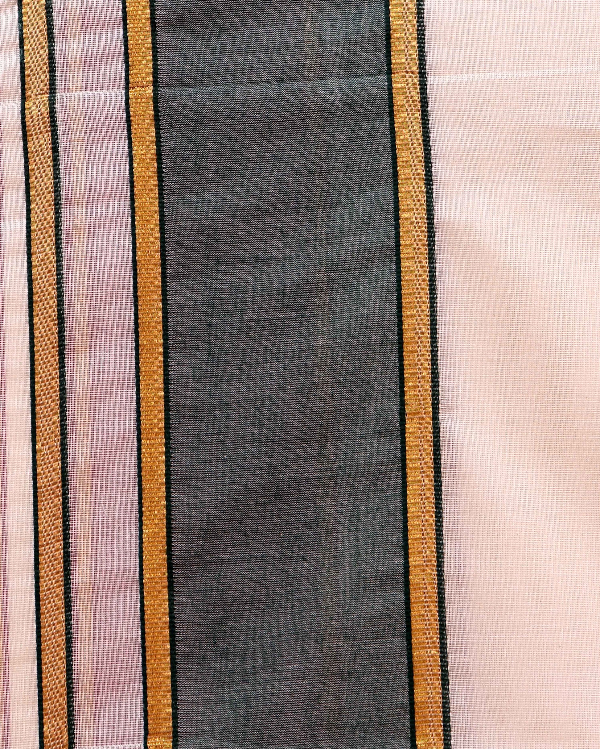 - Elevate traditional style with this pure white men's cotton dhoti an elegant Green and gold temple design border
