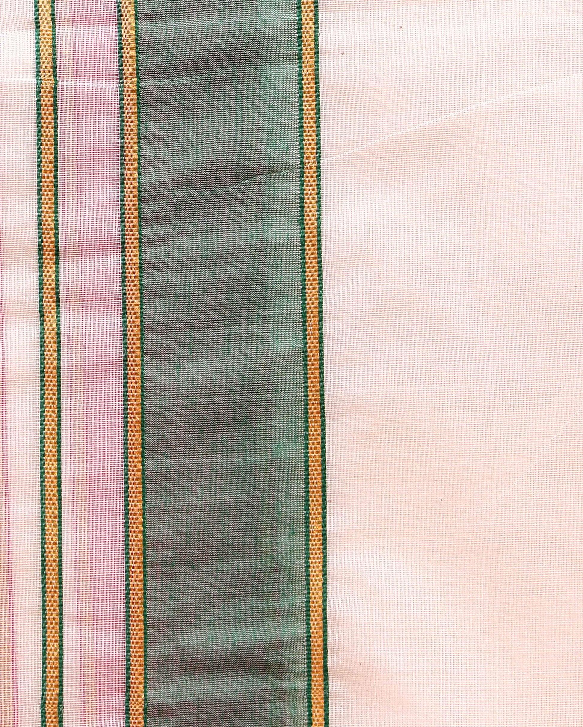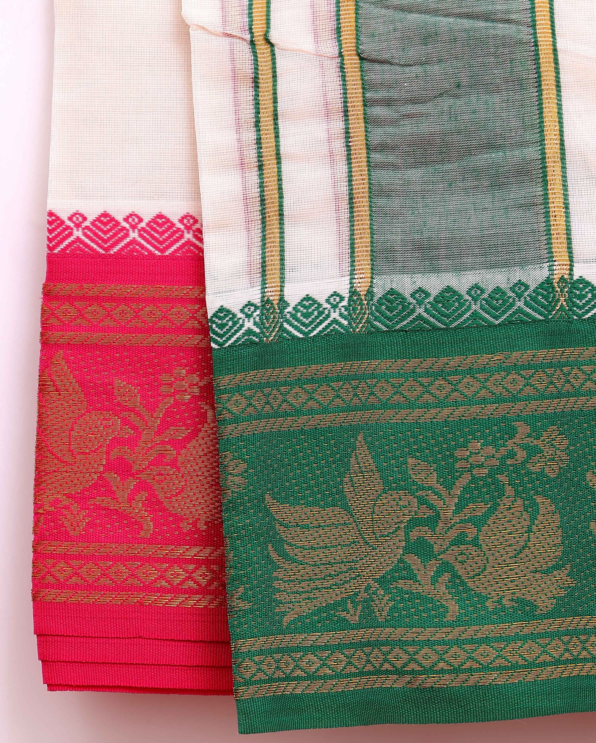 Men’s Traditional Handloom 4 Meter Cotton Dhoti with Green Border - Off White