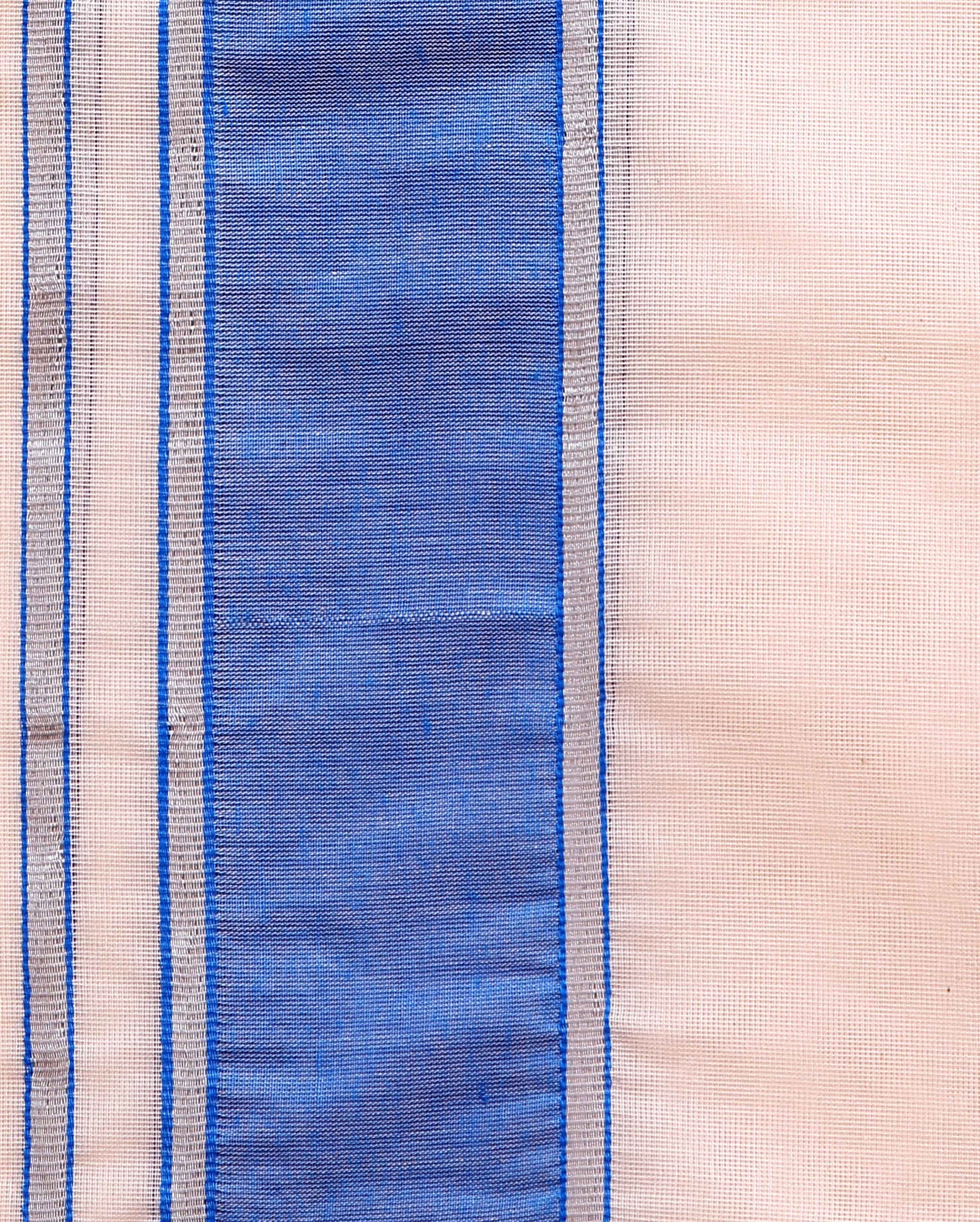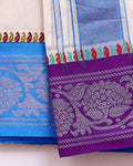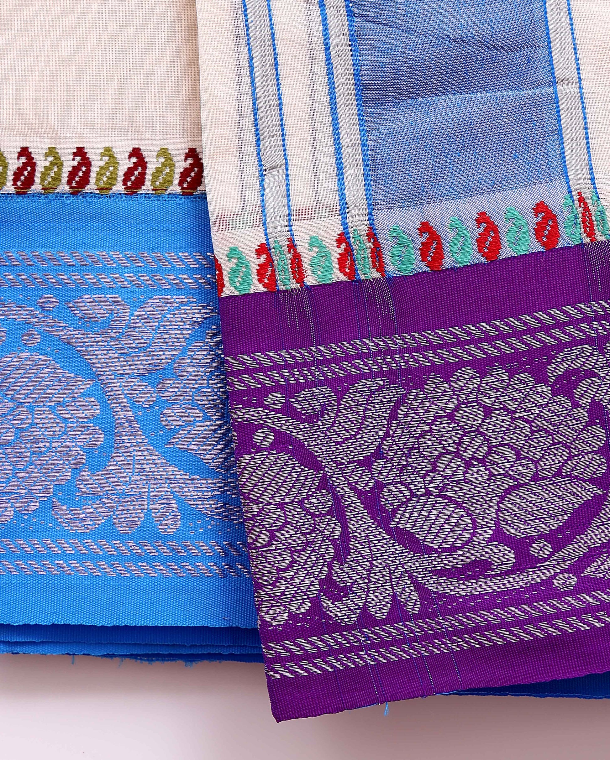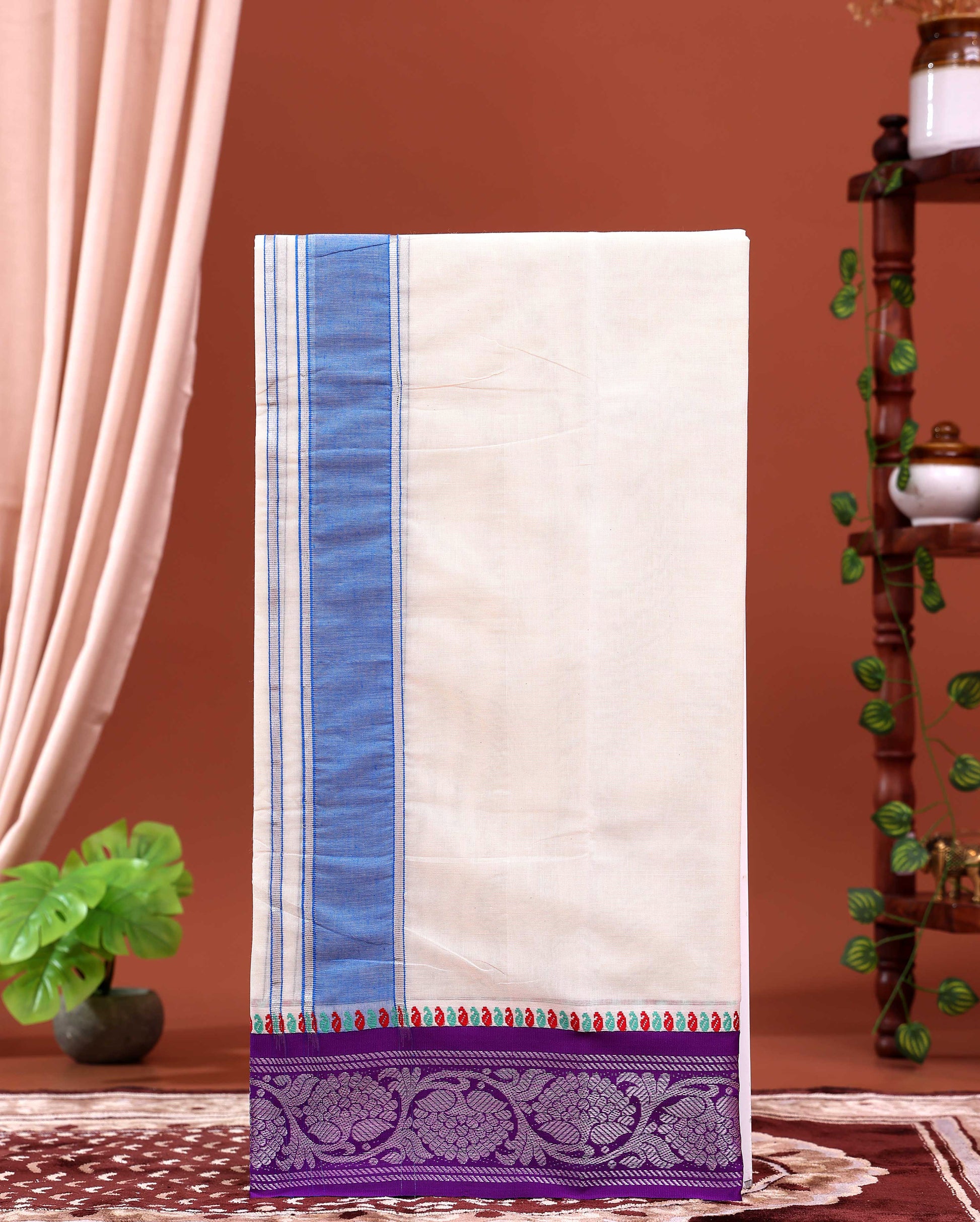 - Step into timeless elegance with this pure cotton men's dhoti a striking blue and purple jacquard border for a traditional yet stylish look,.