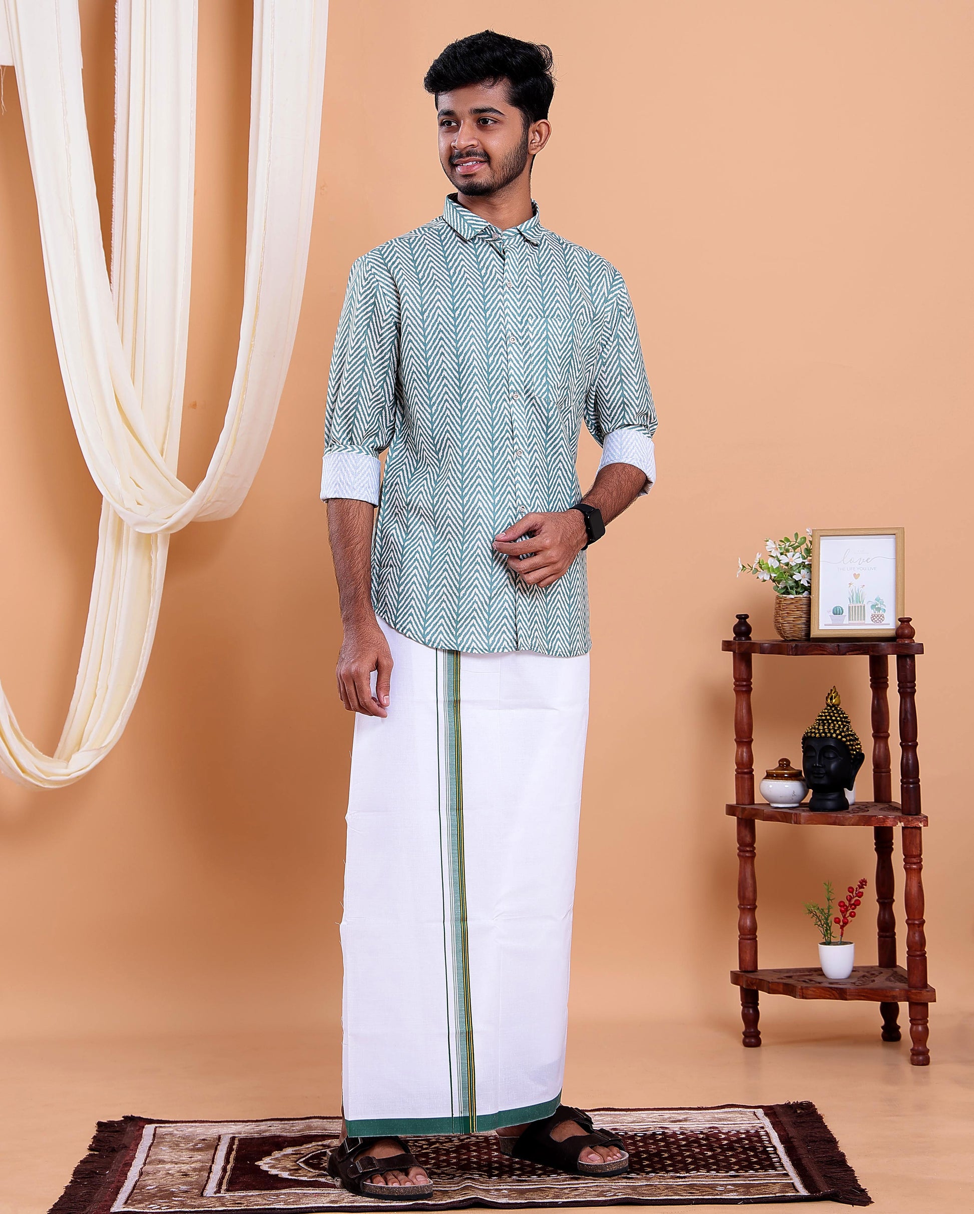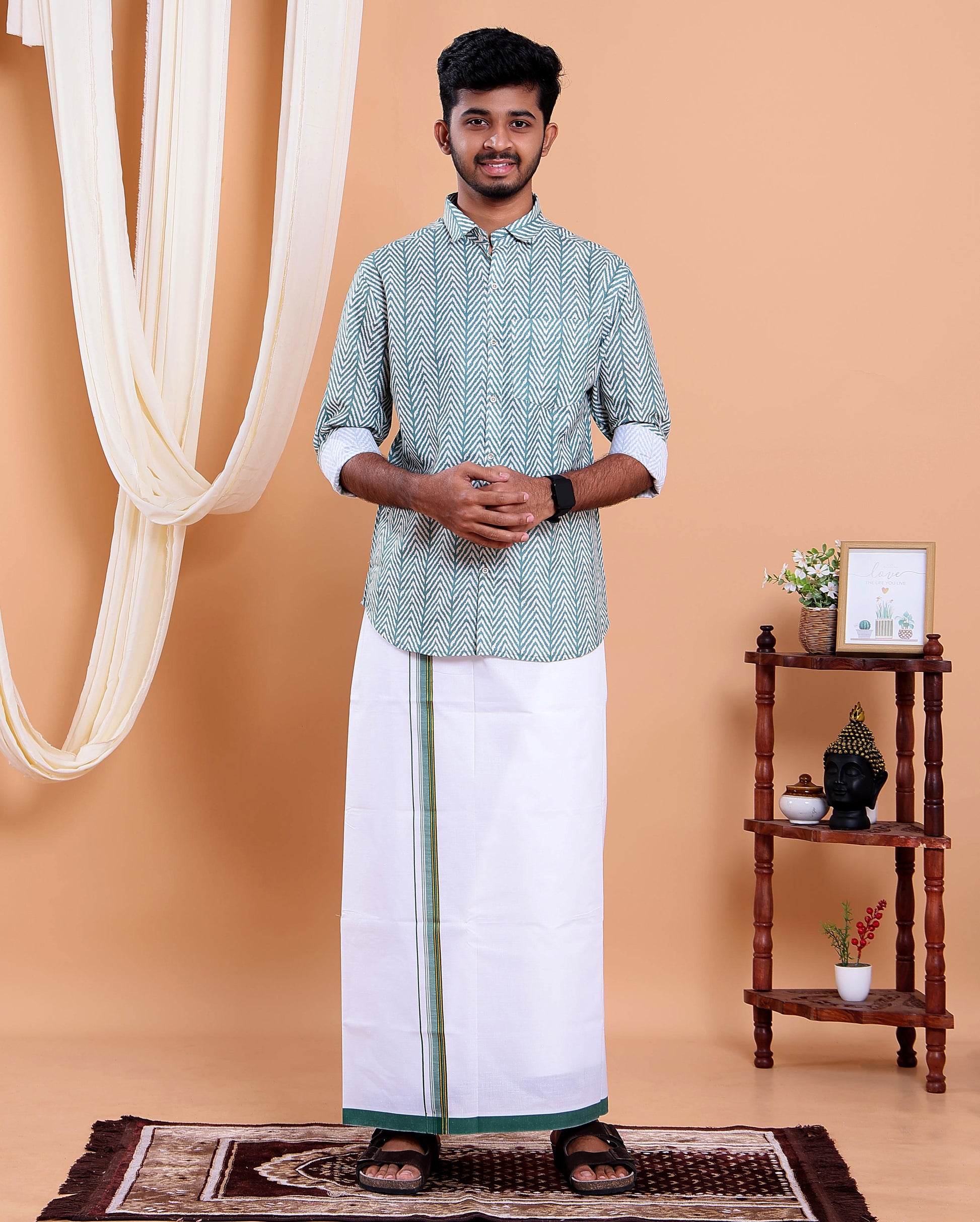 - This elegant men's ethnic set a stylish Green printed shirt crafted from a comfortable cotton blend, perfectly paired with a traditional white dhoti that has a matching border.