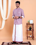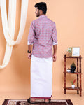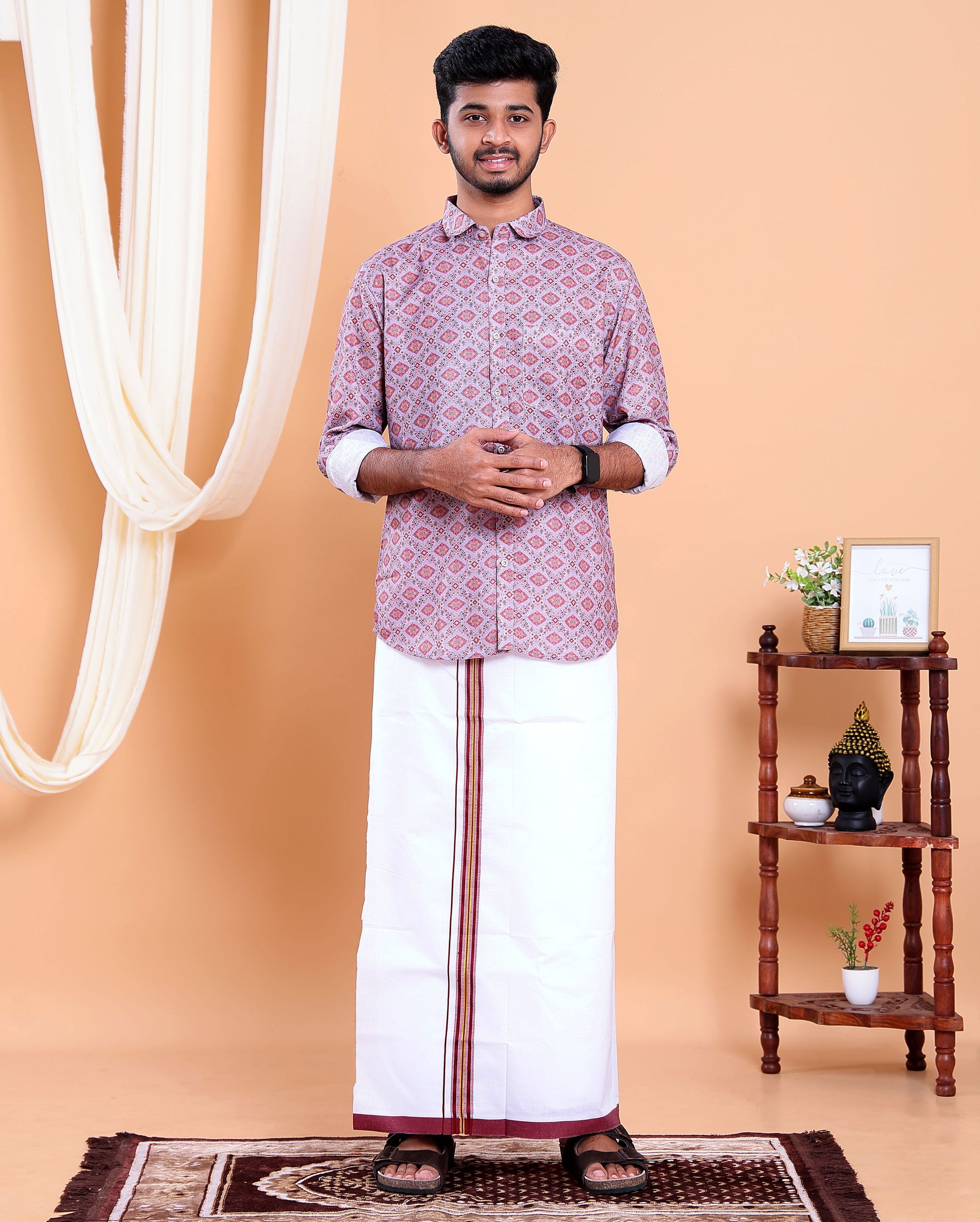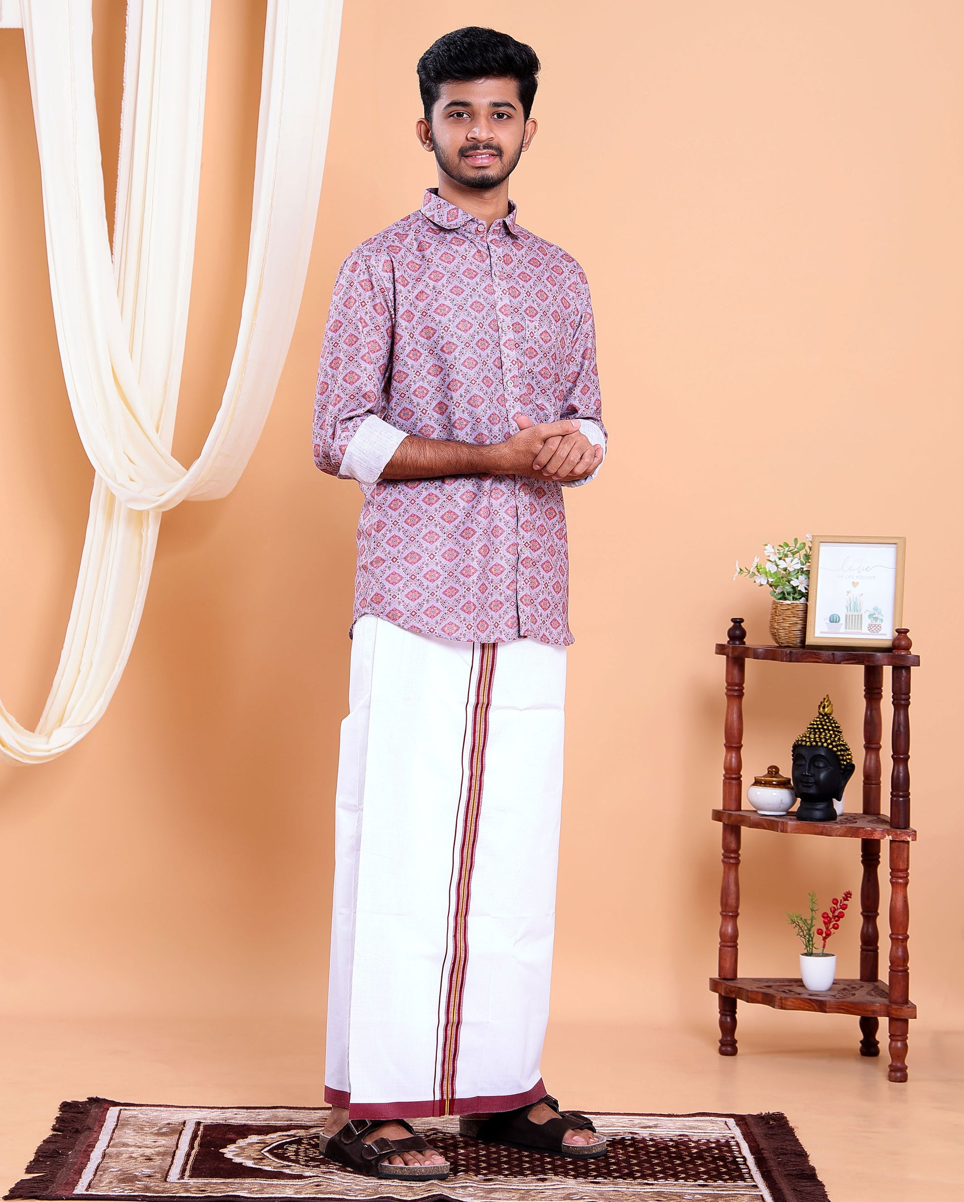 - Elevate any festive occasion with this elegant men's pink printed full sleeve shirt and traditional white dhoti set.