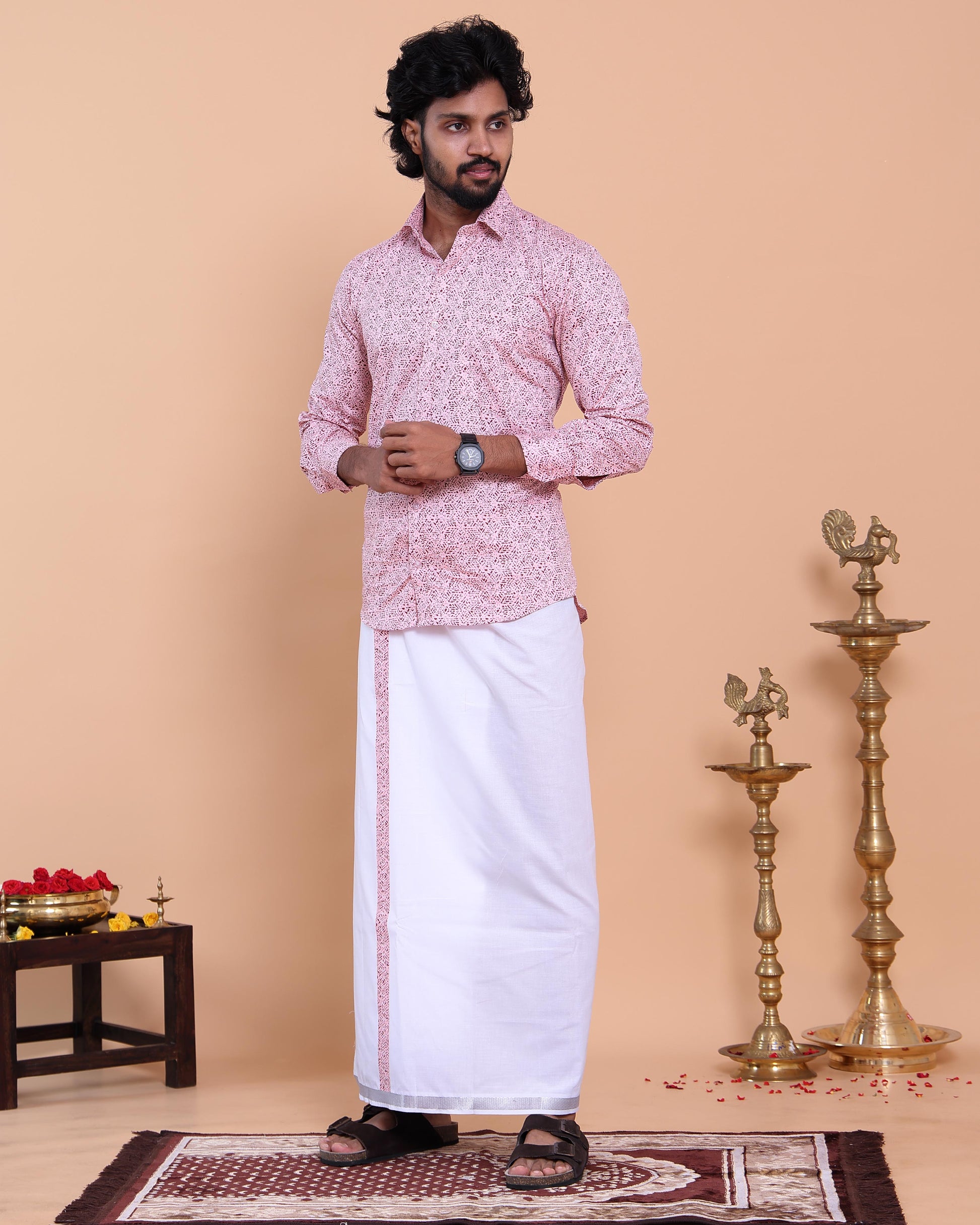 - This men's ethnic set a stylish full sleeved shirt paired with a traditional white dhoti complete with a matching fancy border