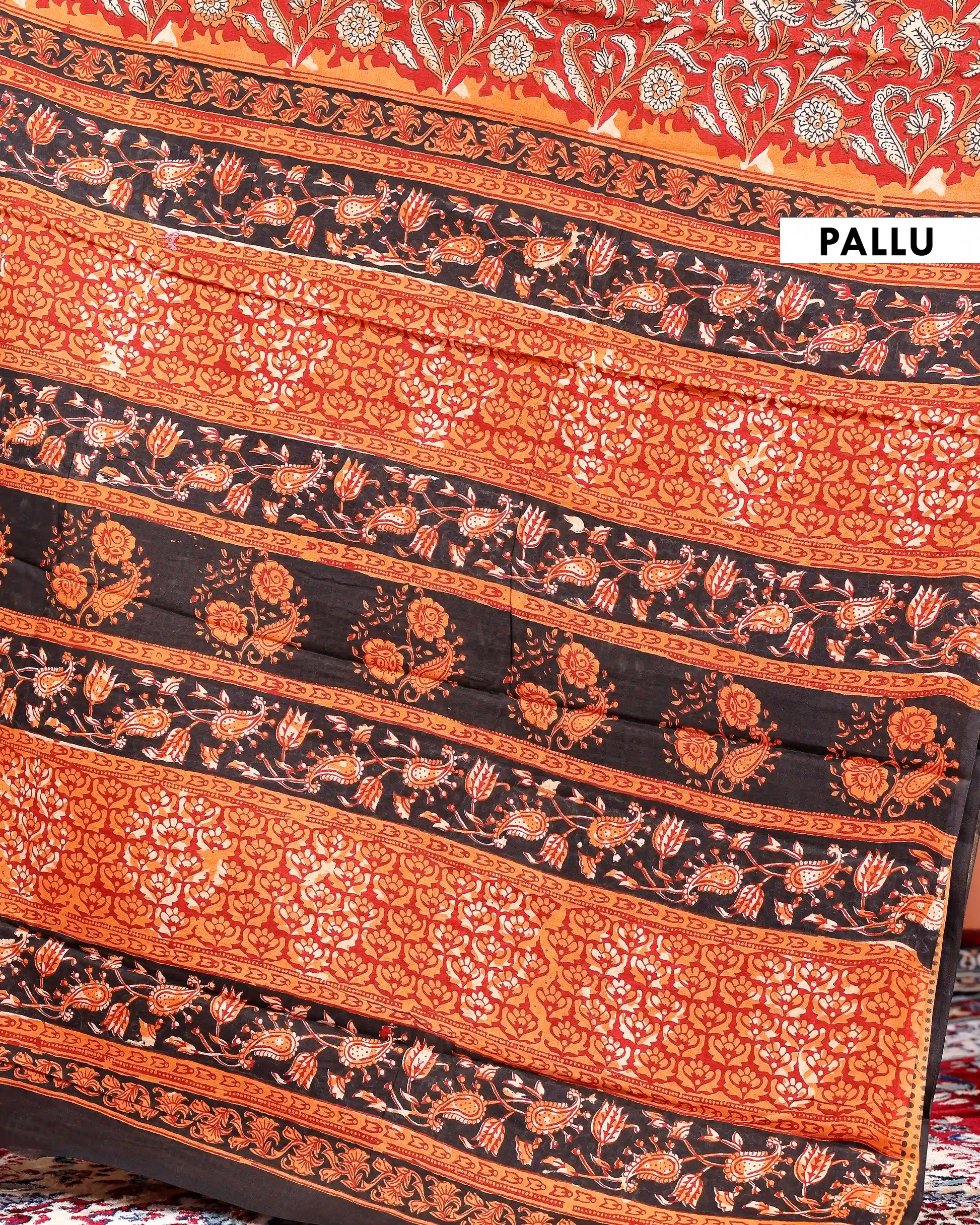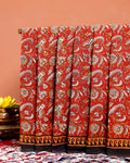 Hand Block Printed Mul Mul Cotton Saree with Floral Motifs & Border - Red