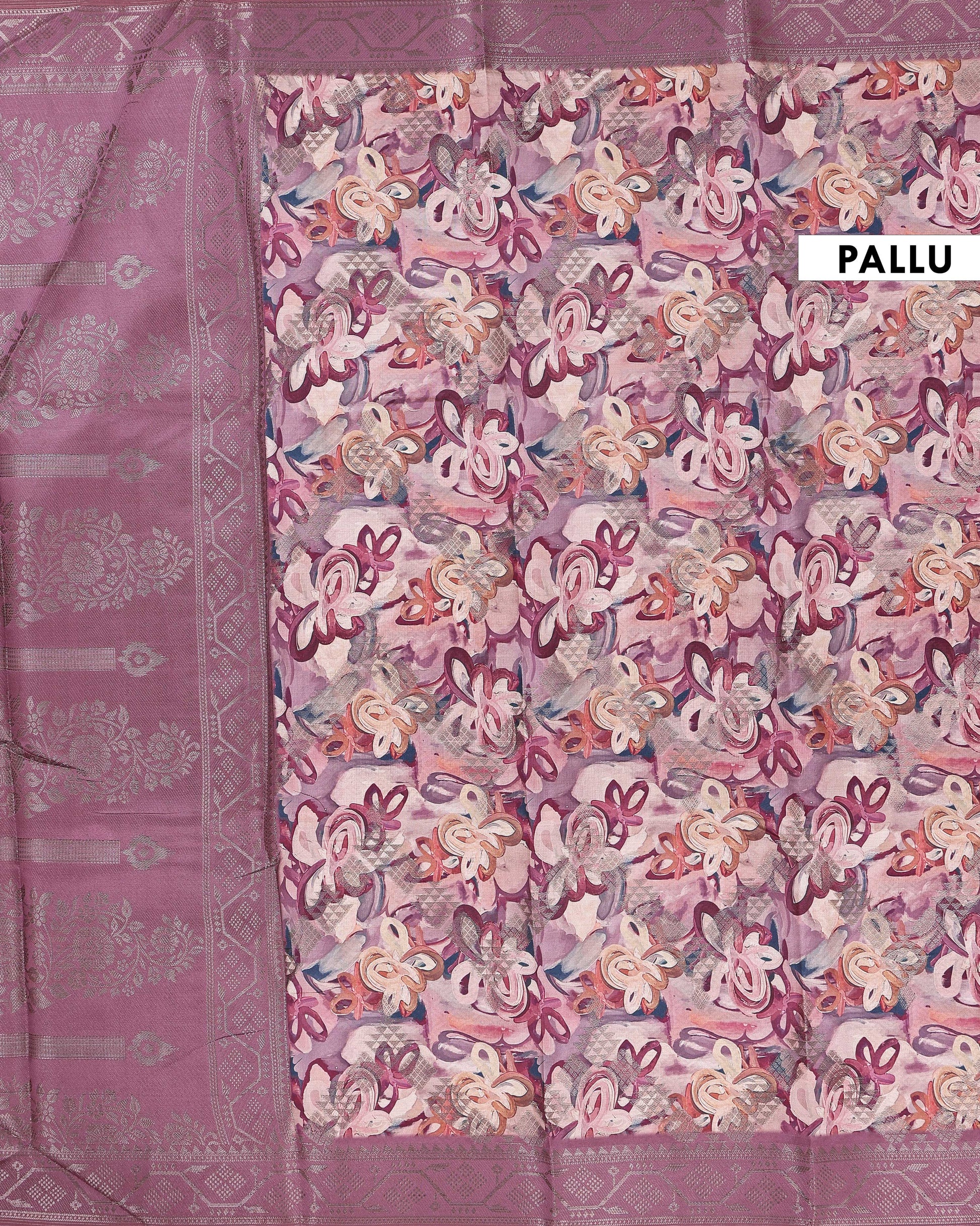 - This Dola silk saree a vibrant floral print and a detailed woven zari border blending traditional artistry with a modern aesthetic.