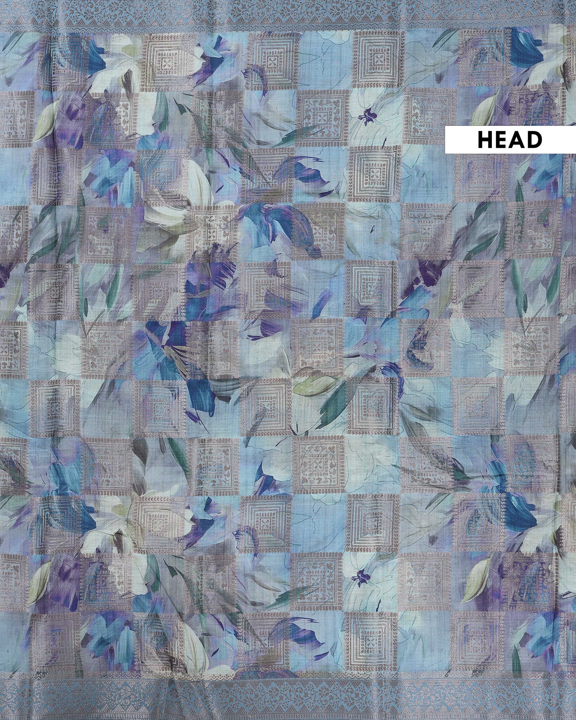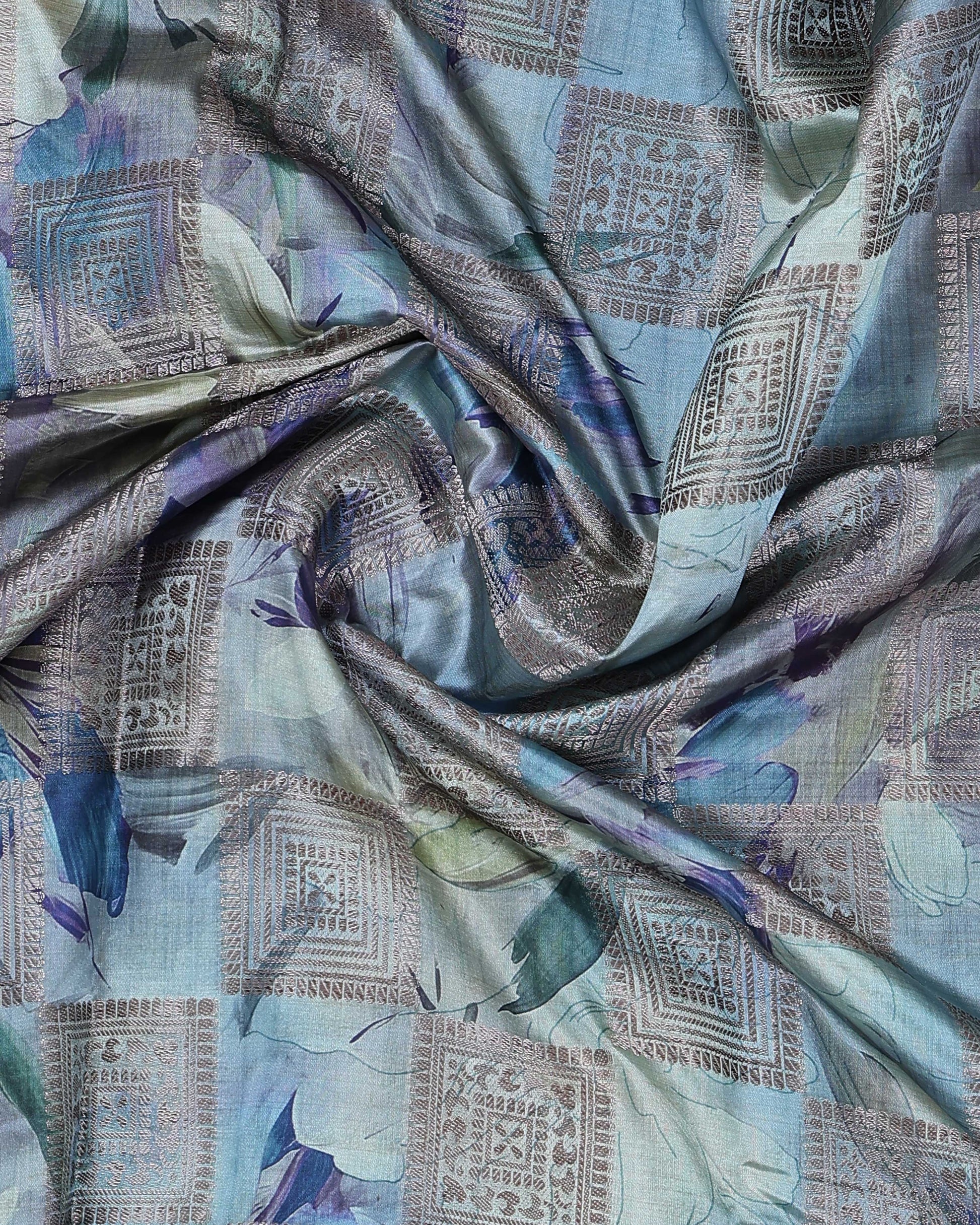 - This multi colored dola silk saree a beautiful patchwork design with floral prints and a contrasting woven border