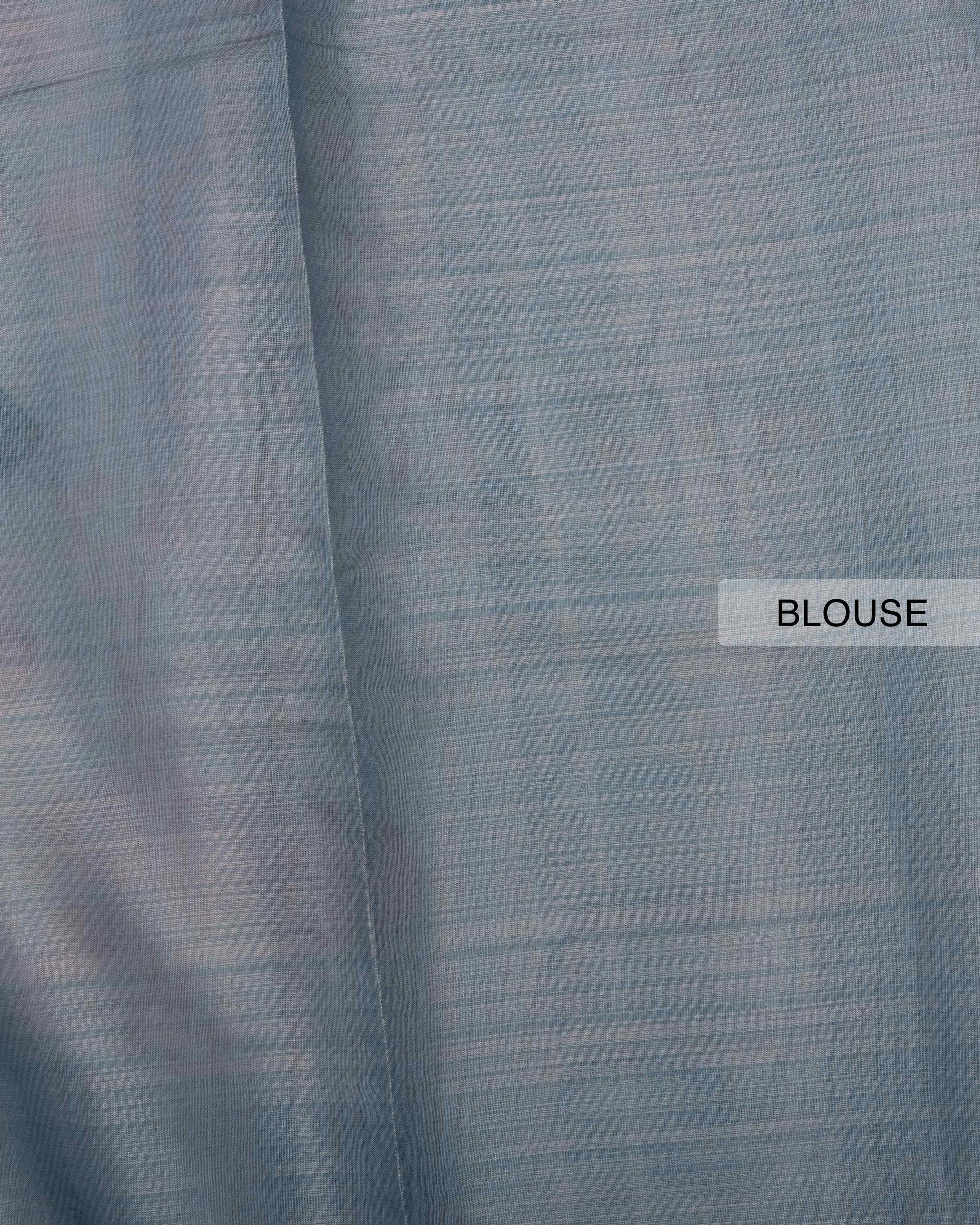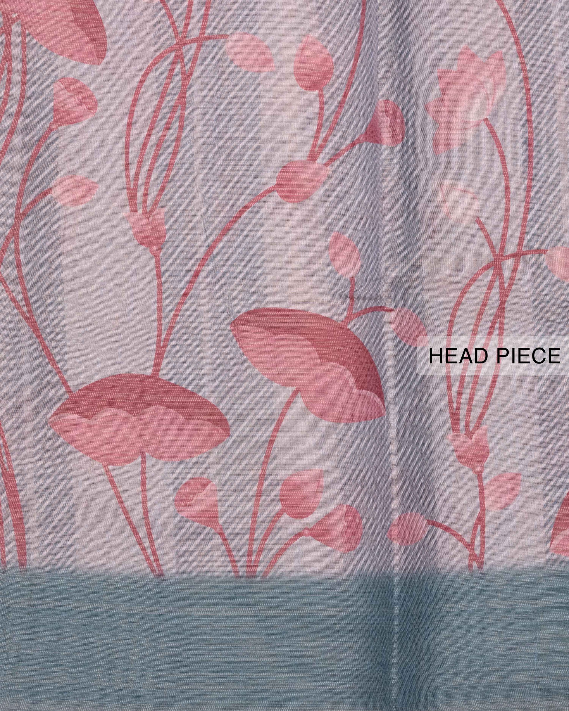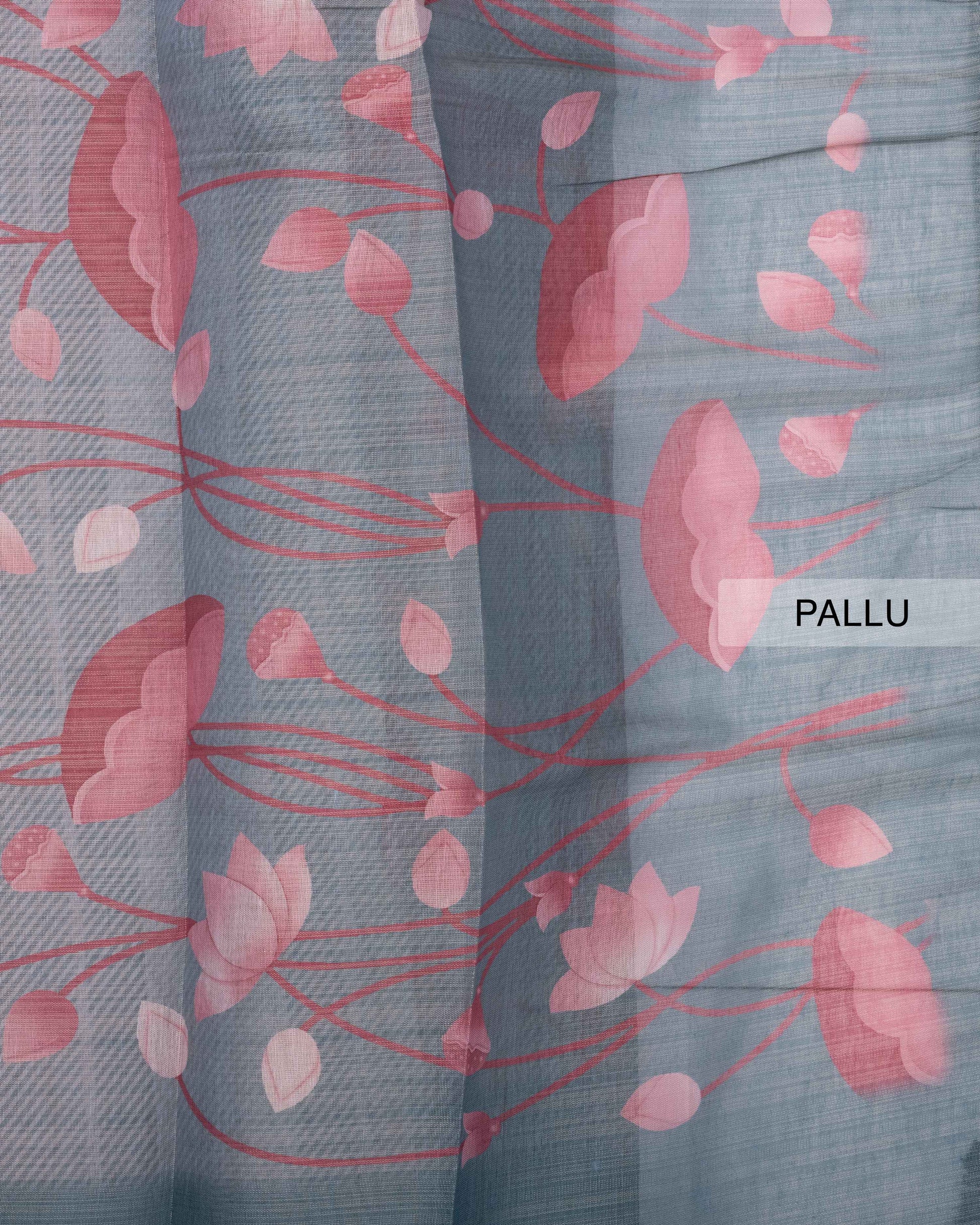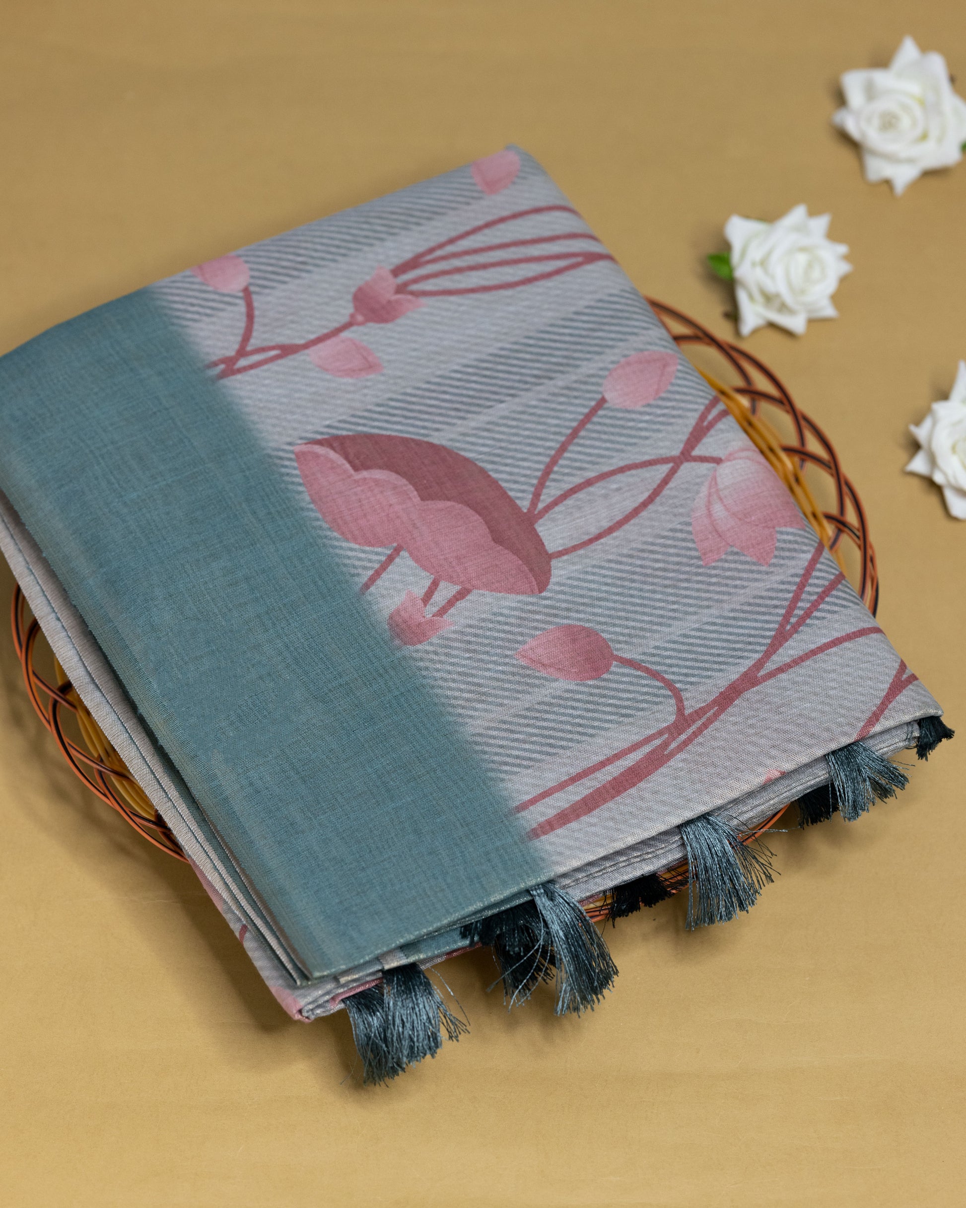 - This elegant tissue saree a soft, subtle floral print on a light gray base, complemented by a contrasting teal-blue pallu and delicate tassels