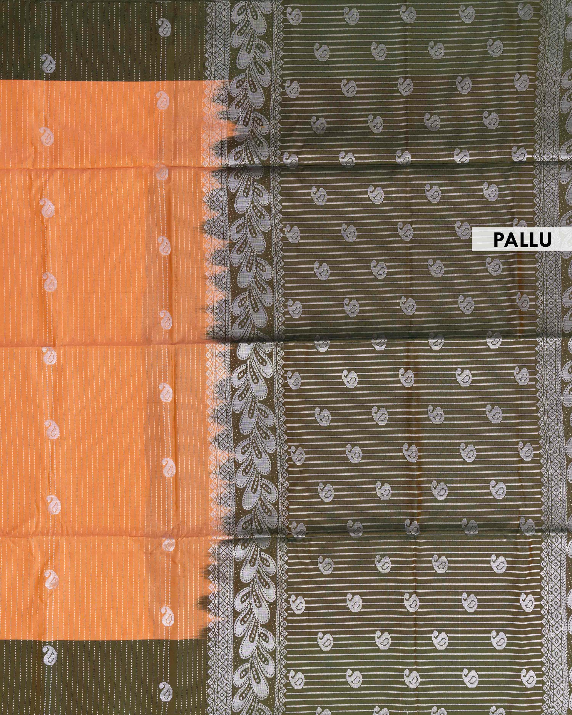 - This Semi Silk Saree a dual tone body with subtle zari paisley motifs for a refined traditional look.
