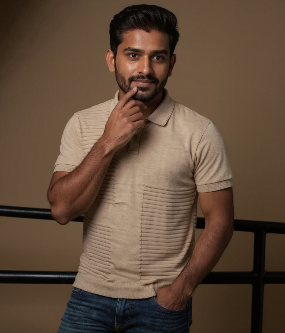 - This men's beige Nativebull t-shirt a stylish self design texture and a classic polo collar.