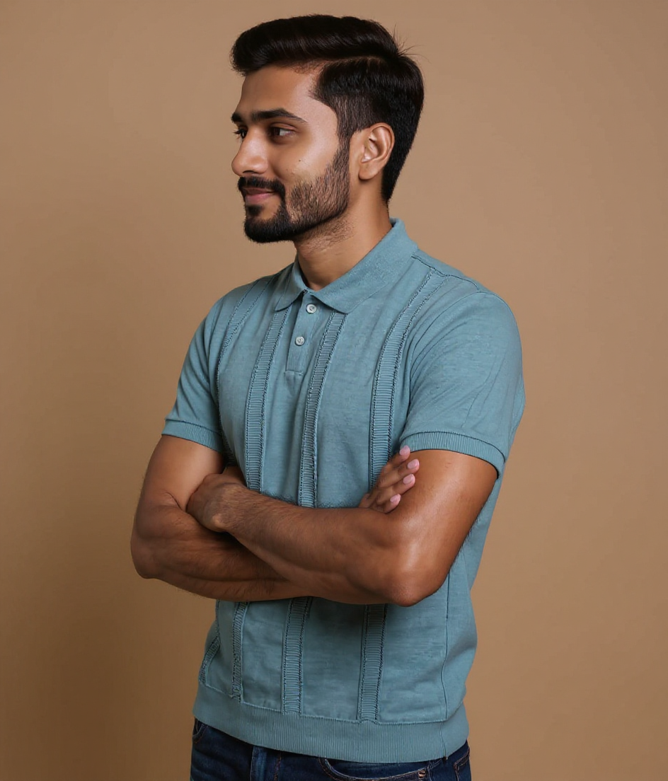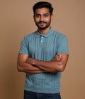 Men's Textured Knit Nativebull T-shirt with Ribbed Collar & Half Sleeves - Green