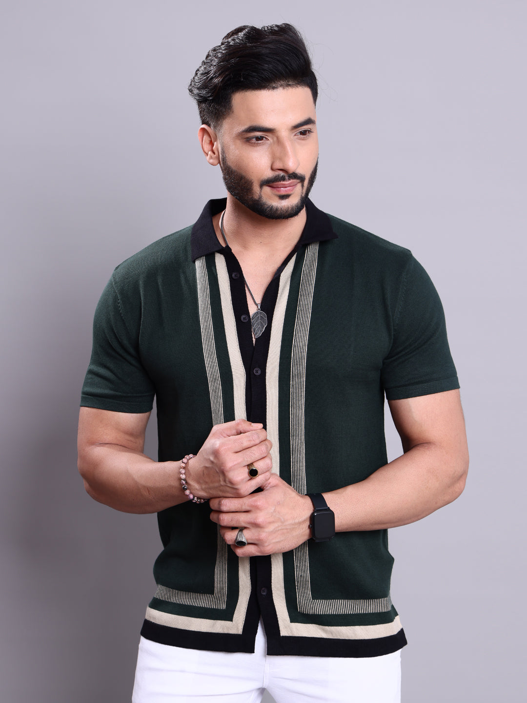 - Experience all day comfort and effortless style with this premium cotton knitted polo, a unique colorblock design in green, black and beige stripes for a modern relaxed look