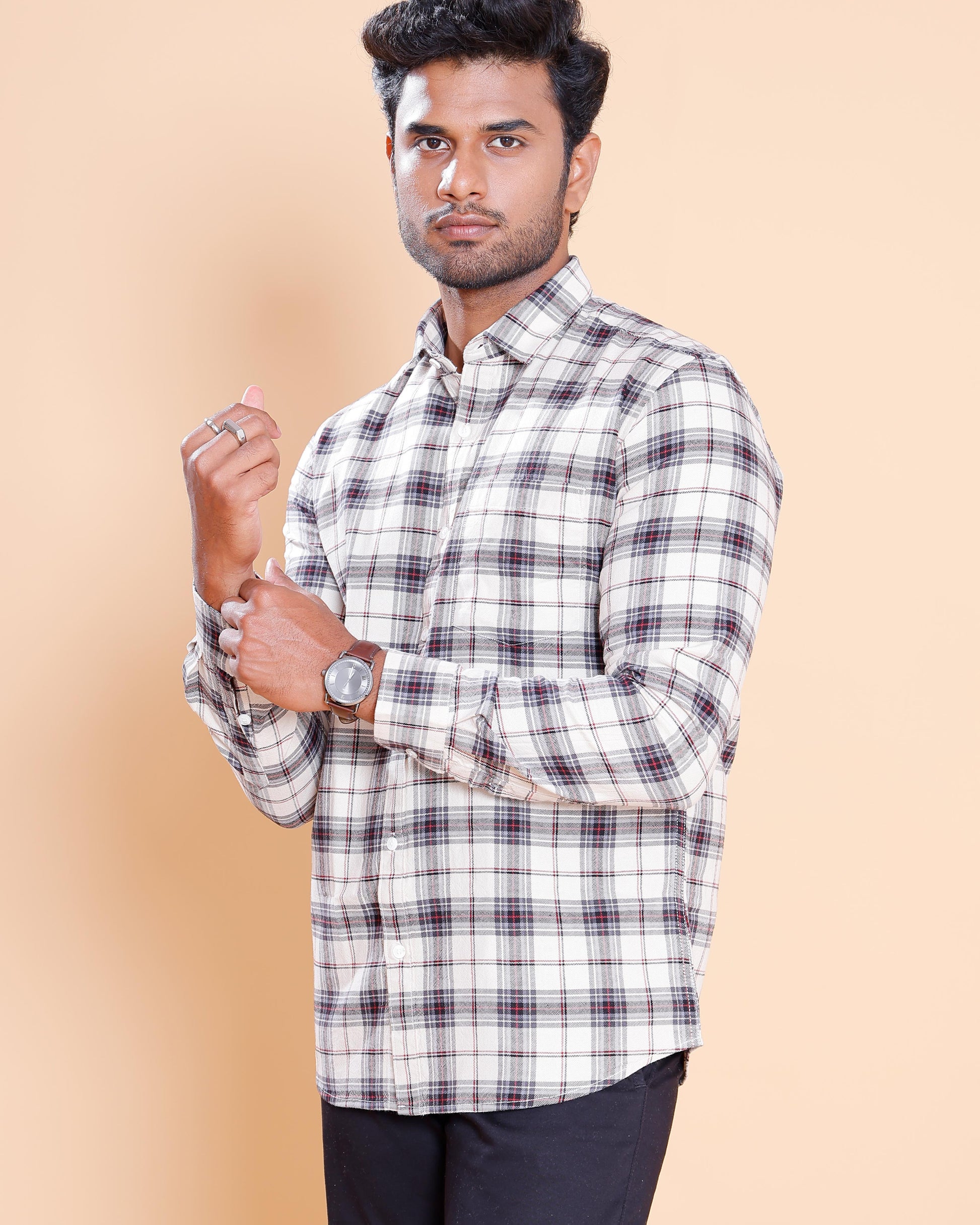 - This versatile shirt, in a sophisticated white, red and black pattern offers effortless style and comfort for any casual occasion.