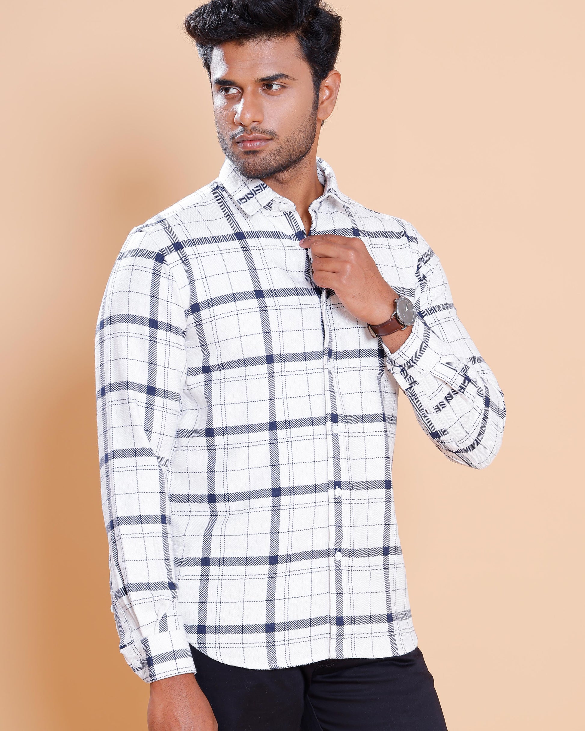 - Elevate your casual style with this men's slim fit white and navy blue windowpane checked cotton shirt