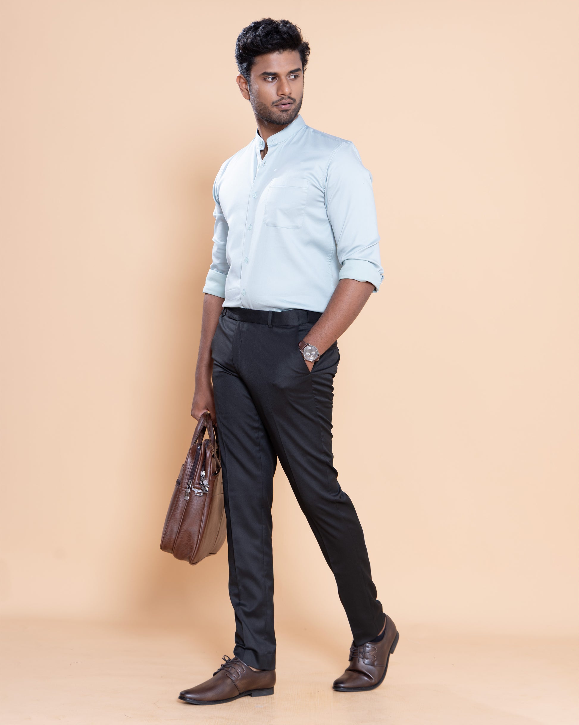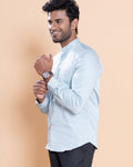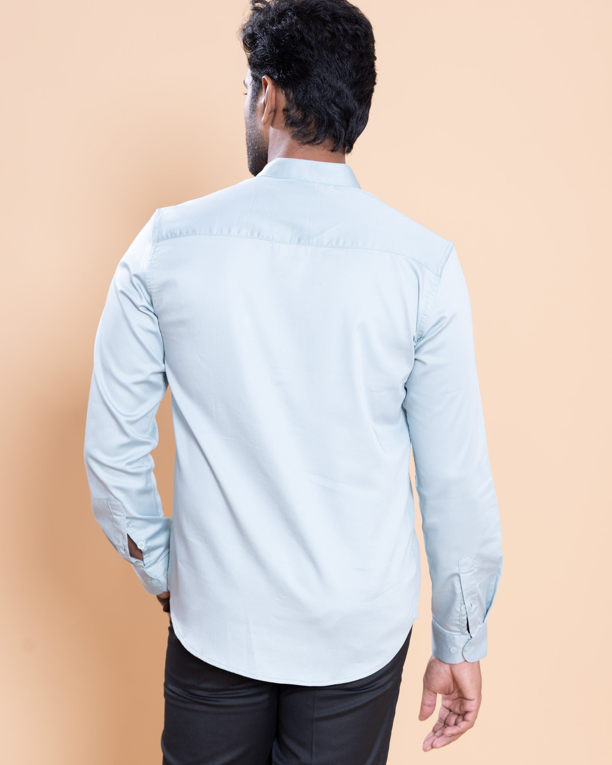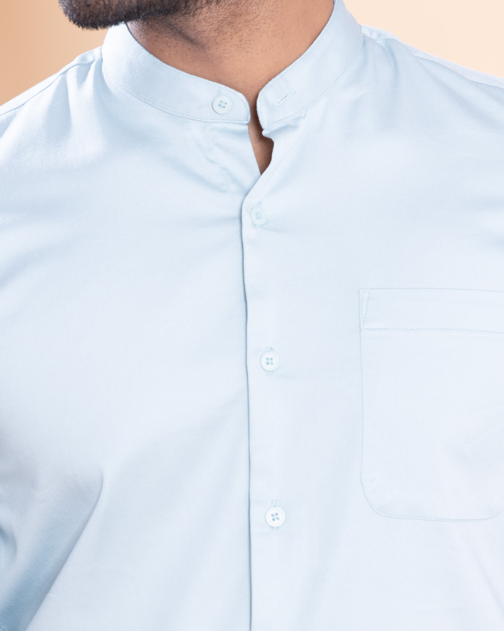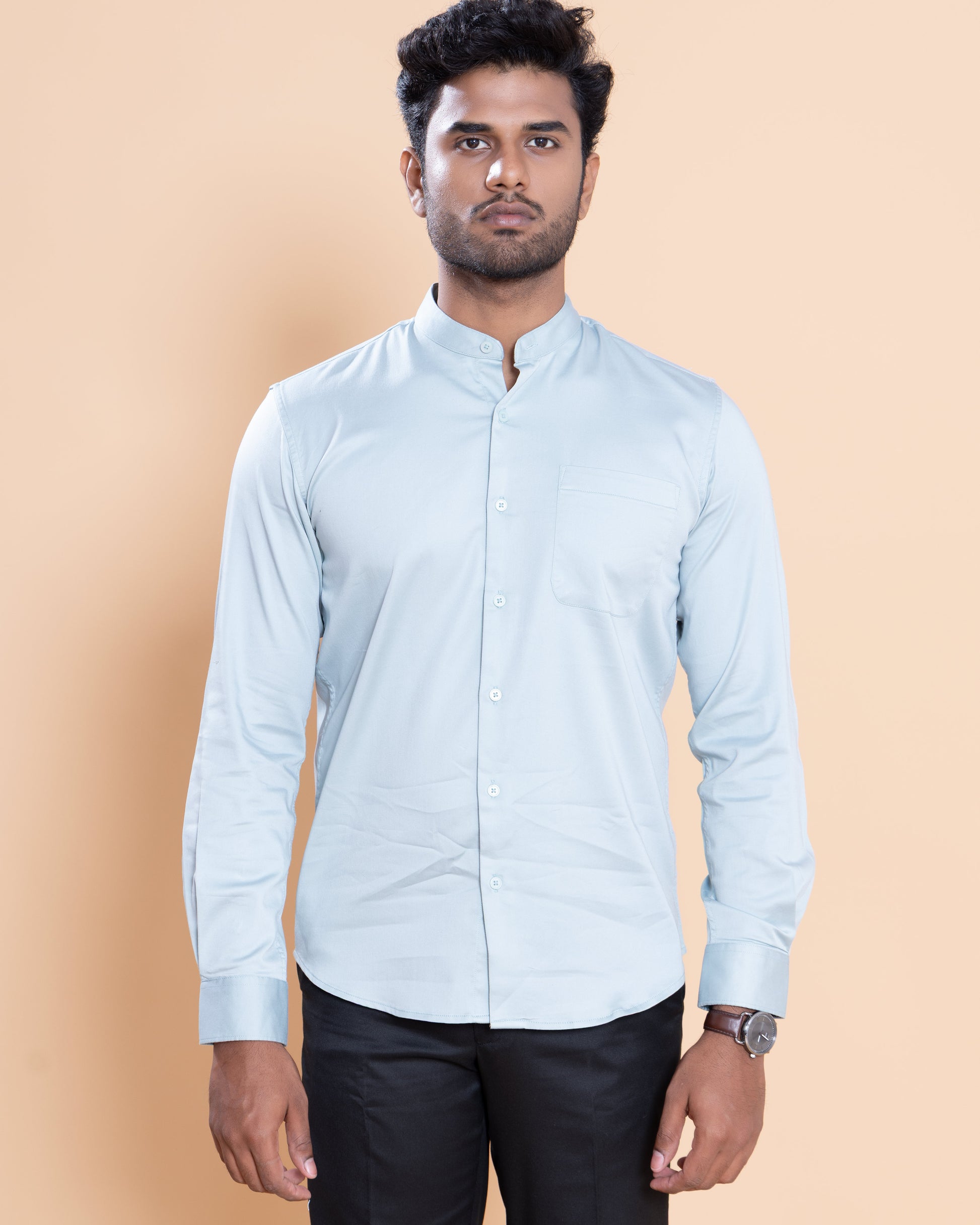 - Elevate any outfit with this stylish men's light blue solid shirt a modern mandarin collar and full sleeves.