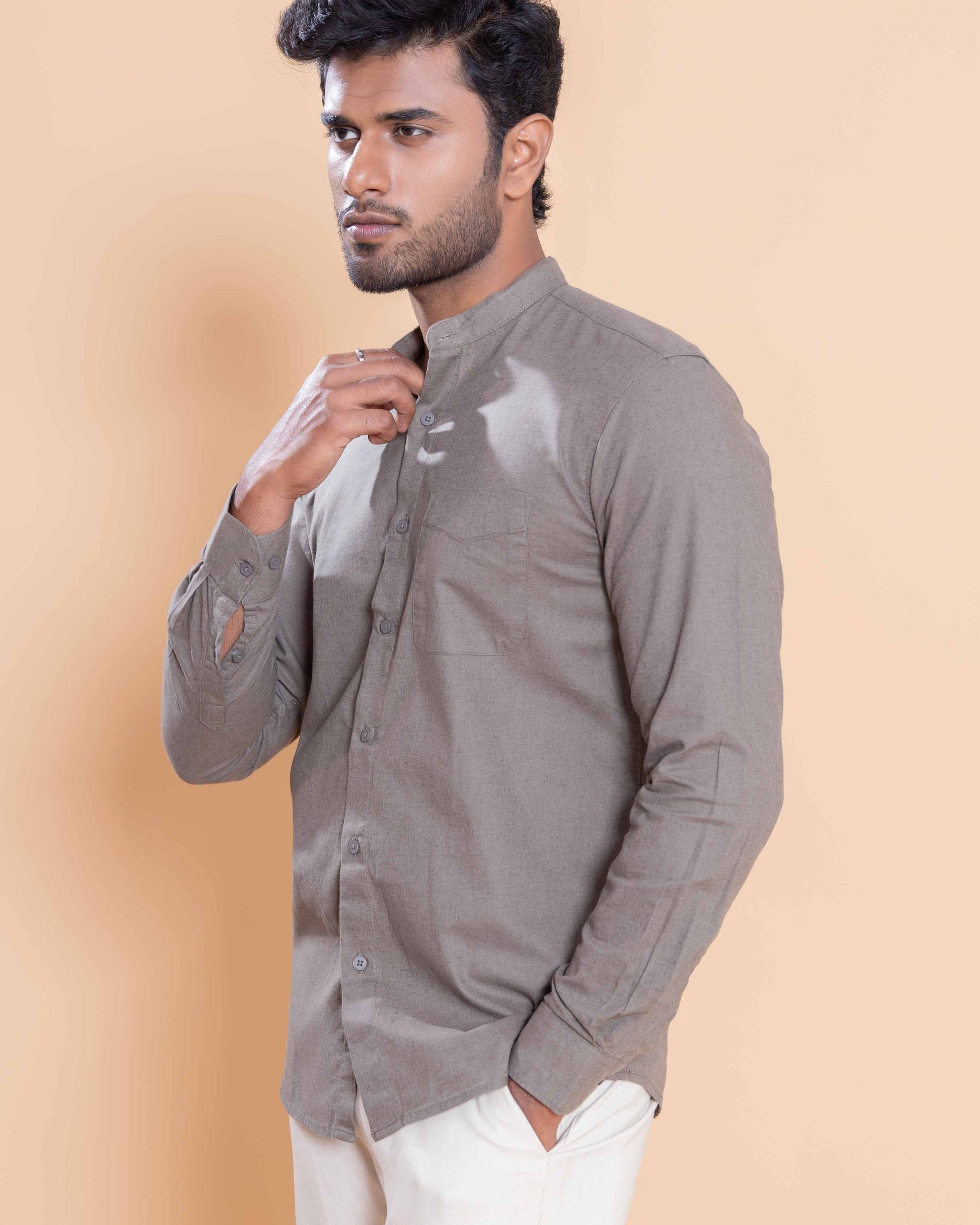 - Effortlessly stylish, this men's light brown grey cotton shirt features a modern mandarin collar and a single patch pocket.