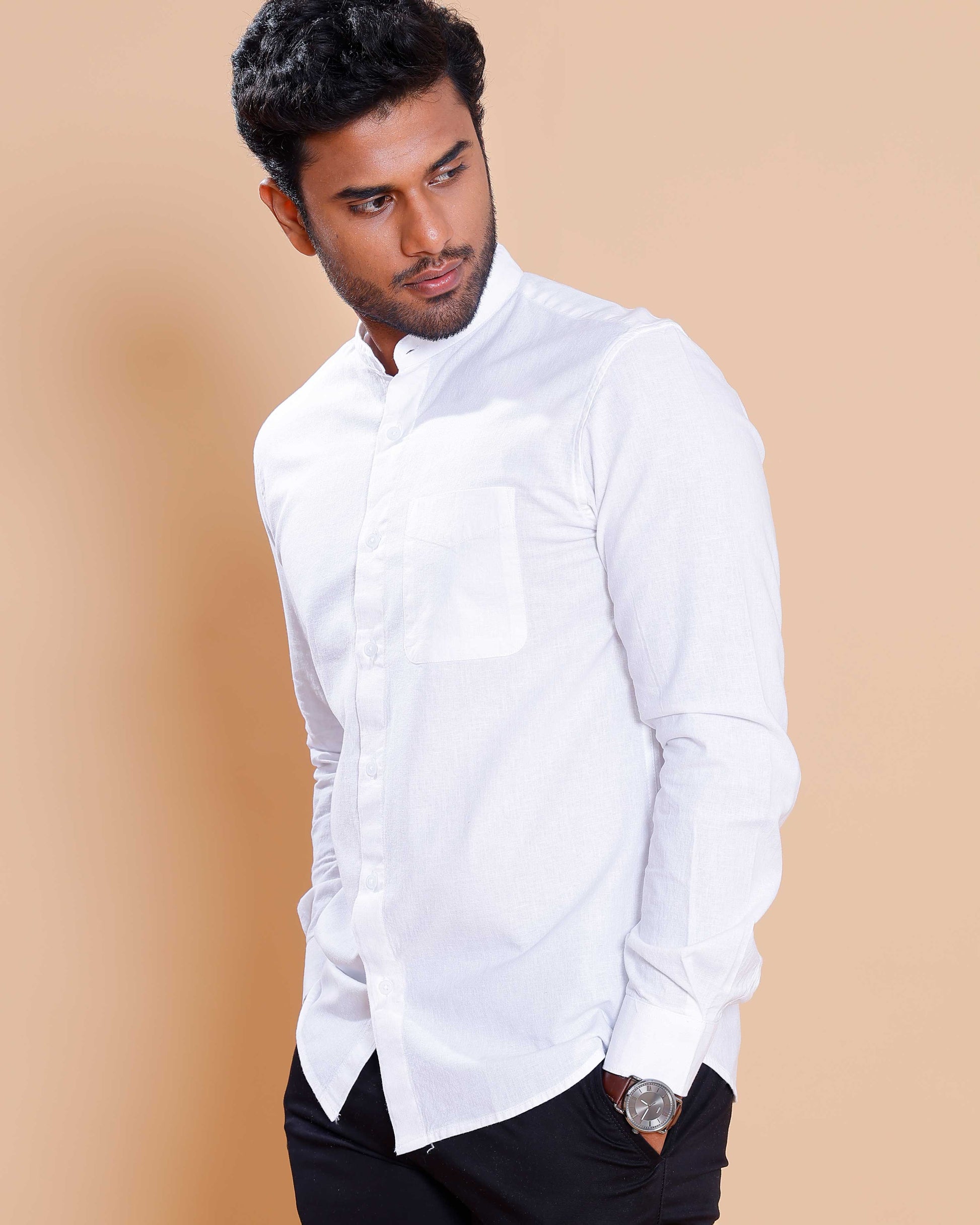 - This men's white shirt a stylish mandarin band collar and a slim fit design.