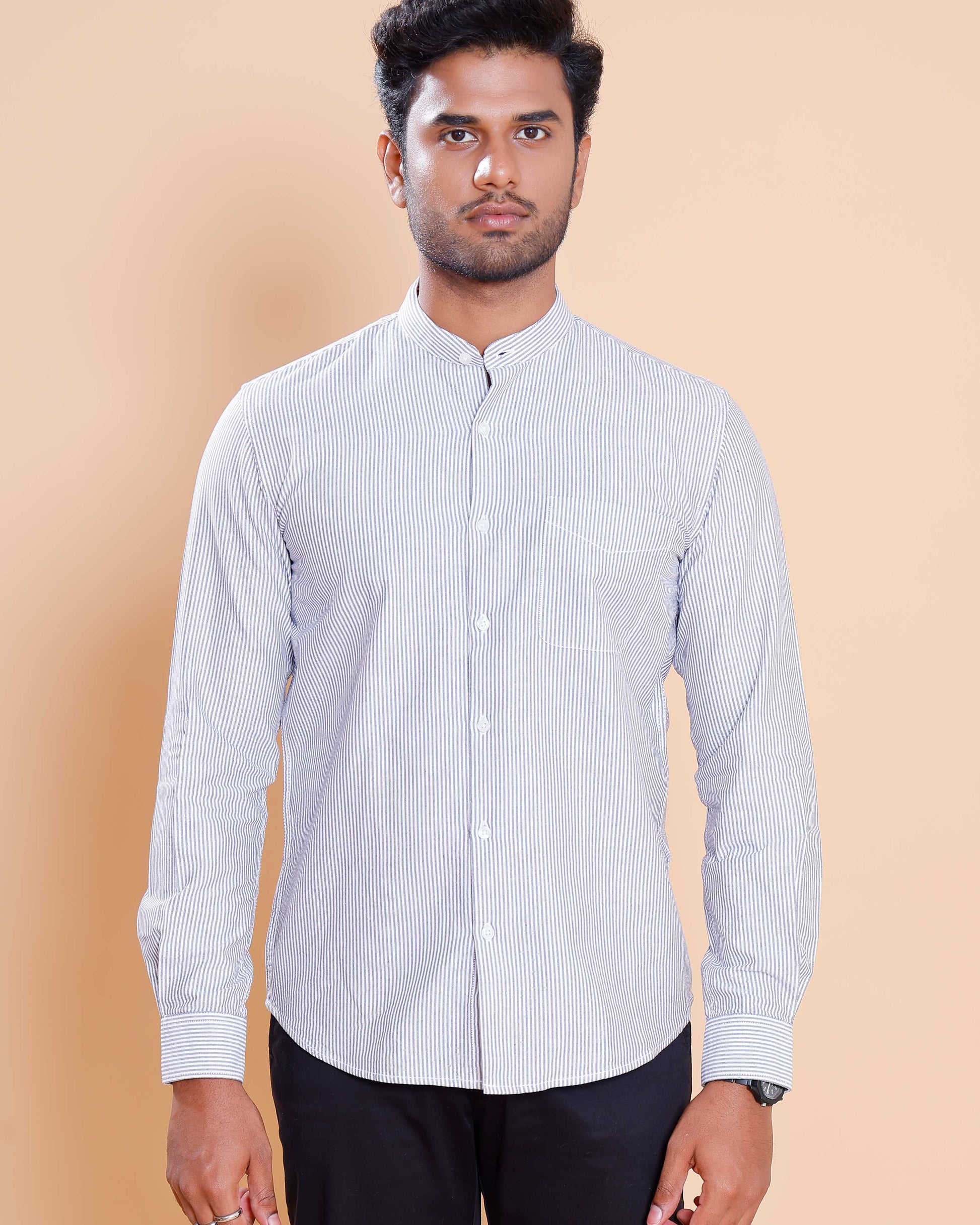 - Elevate a casual wardrobe with this stylish men's white and blue vertical striped shirt a modern band collar and a slim fit crafted from soft breathable cotton