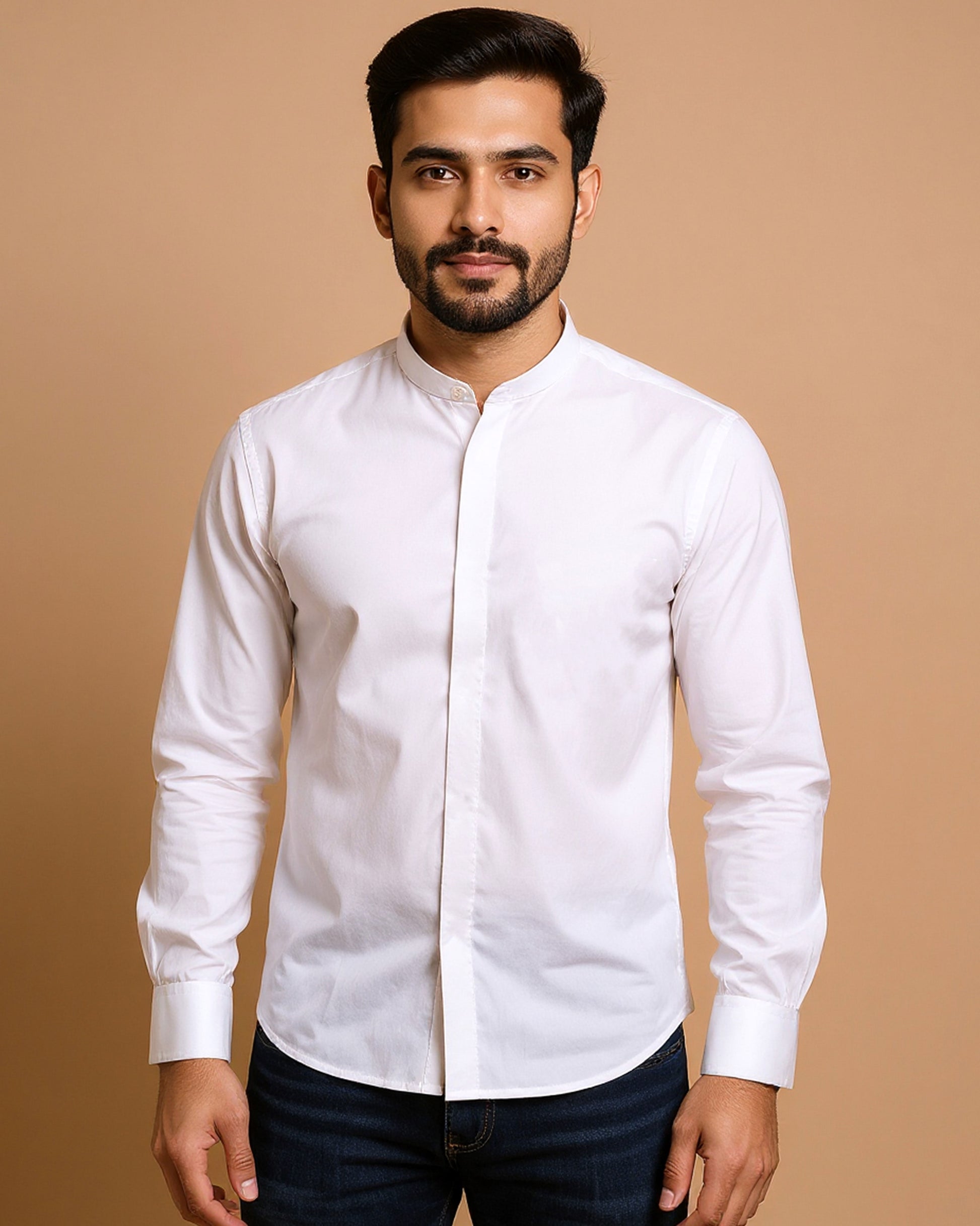 Native Bull Men's Solid Mandarin Collar Casual Shirt and Full Sleeves - White