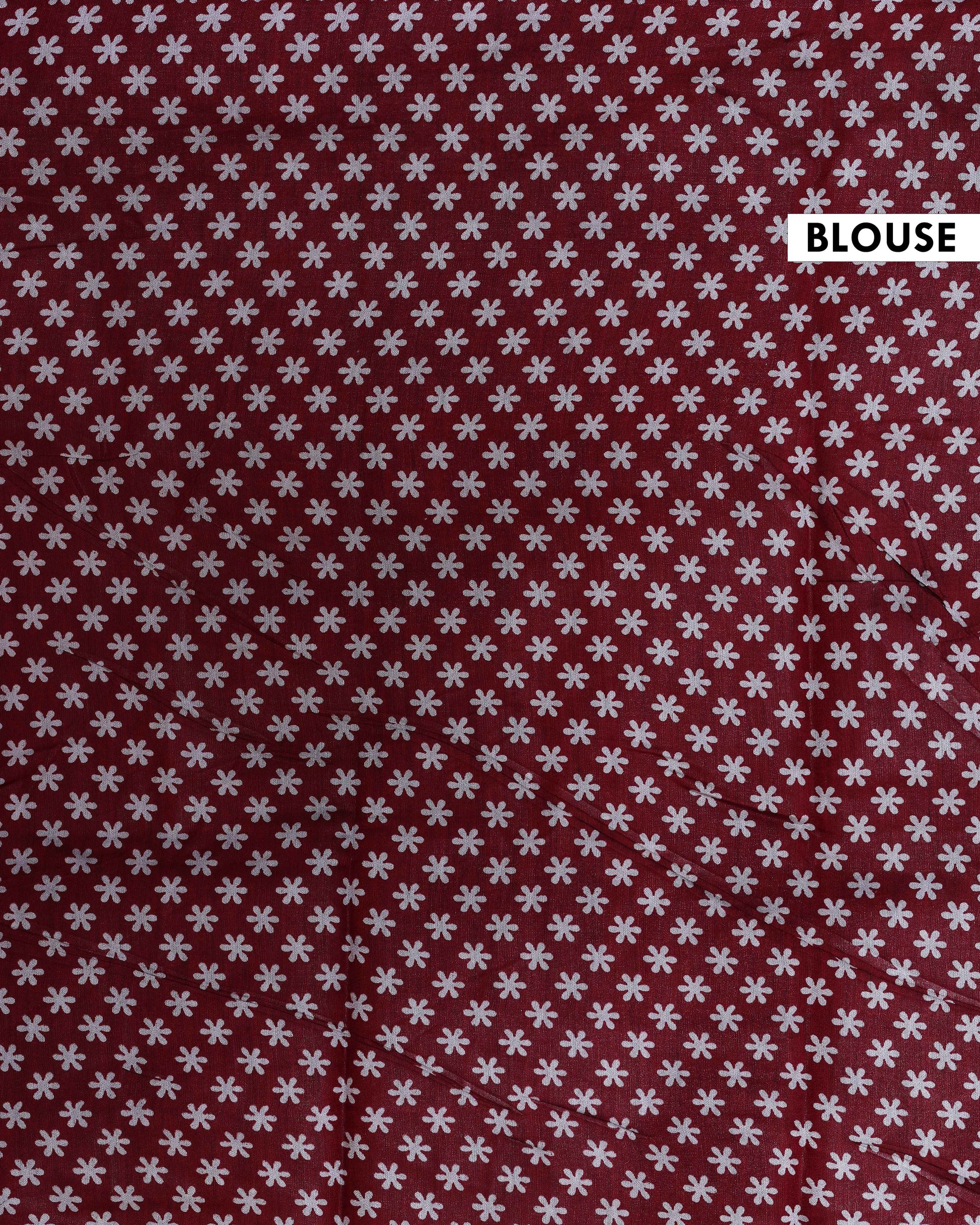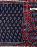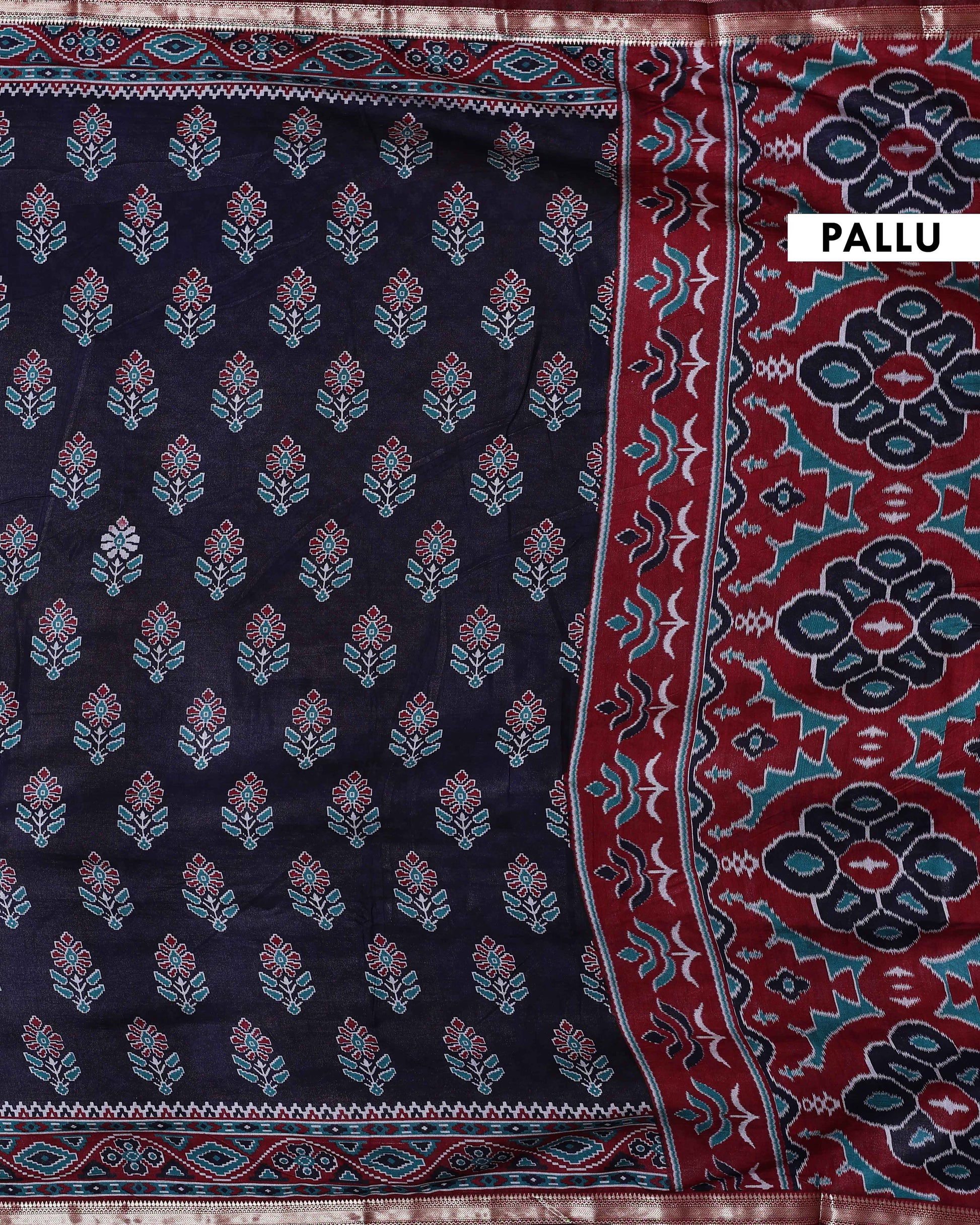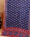 - This elegant Patola silk saree features a deep navy blue body adorned with intricate floral motifs and a vibrant, broad red border with traditional Ajrakh-inspired patterns.