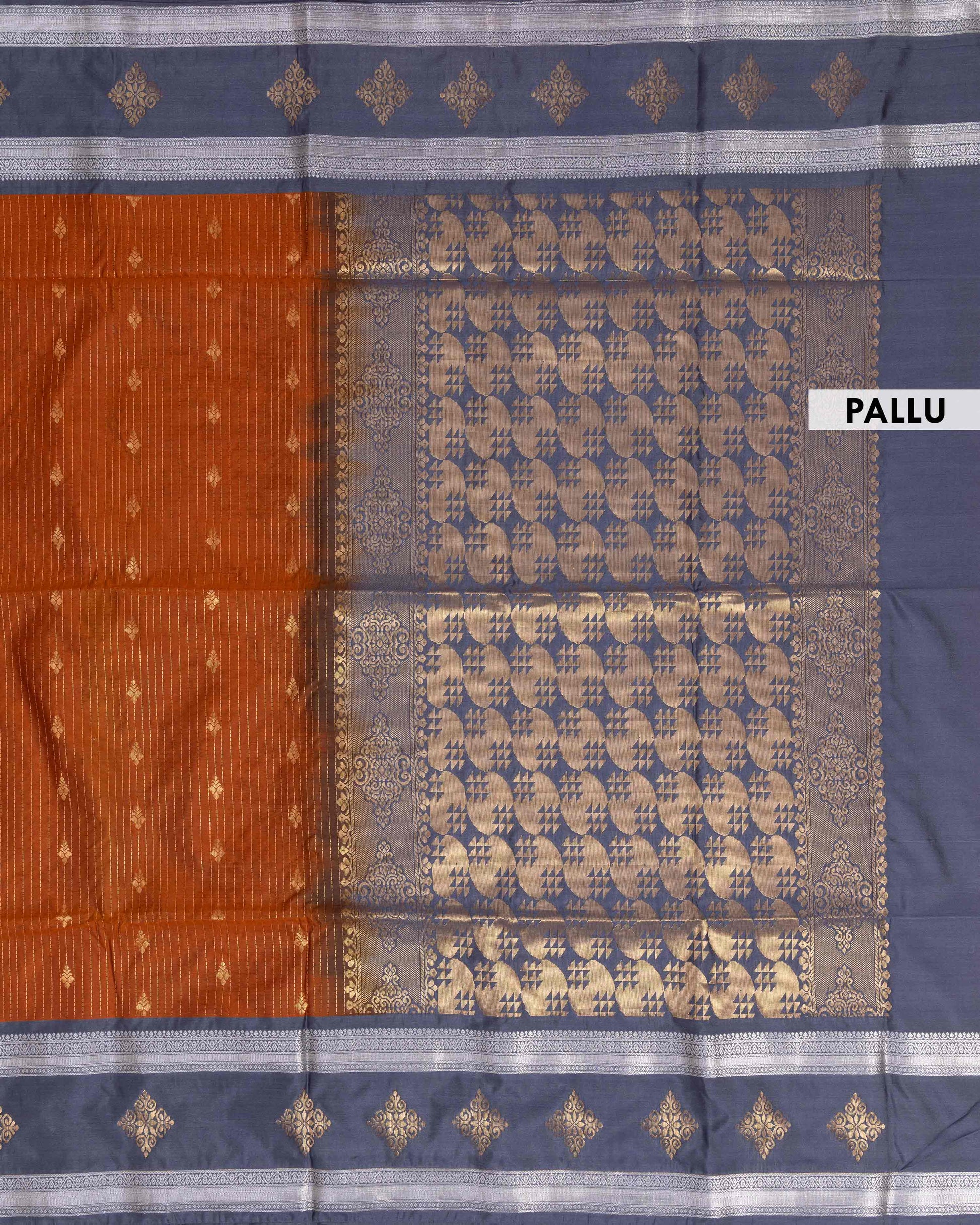 - This Semi Silk Saree delicate golden zari stripes with small woven butta motifs for an elegant traditional finish.