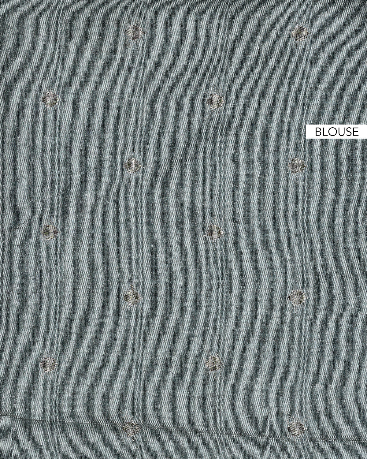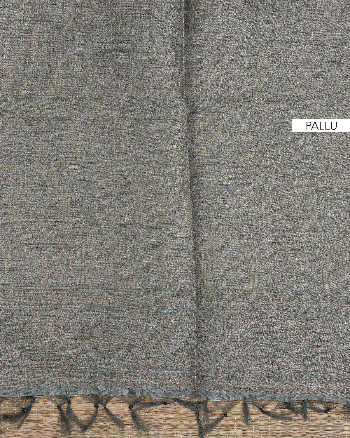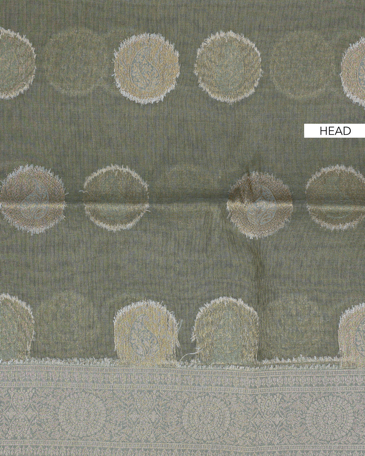 - This exquisite tissue silk saree in a sophisticated olive green traditional circular motifs and a detailed woven border