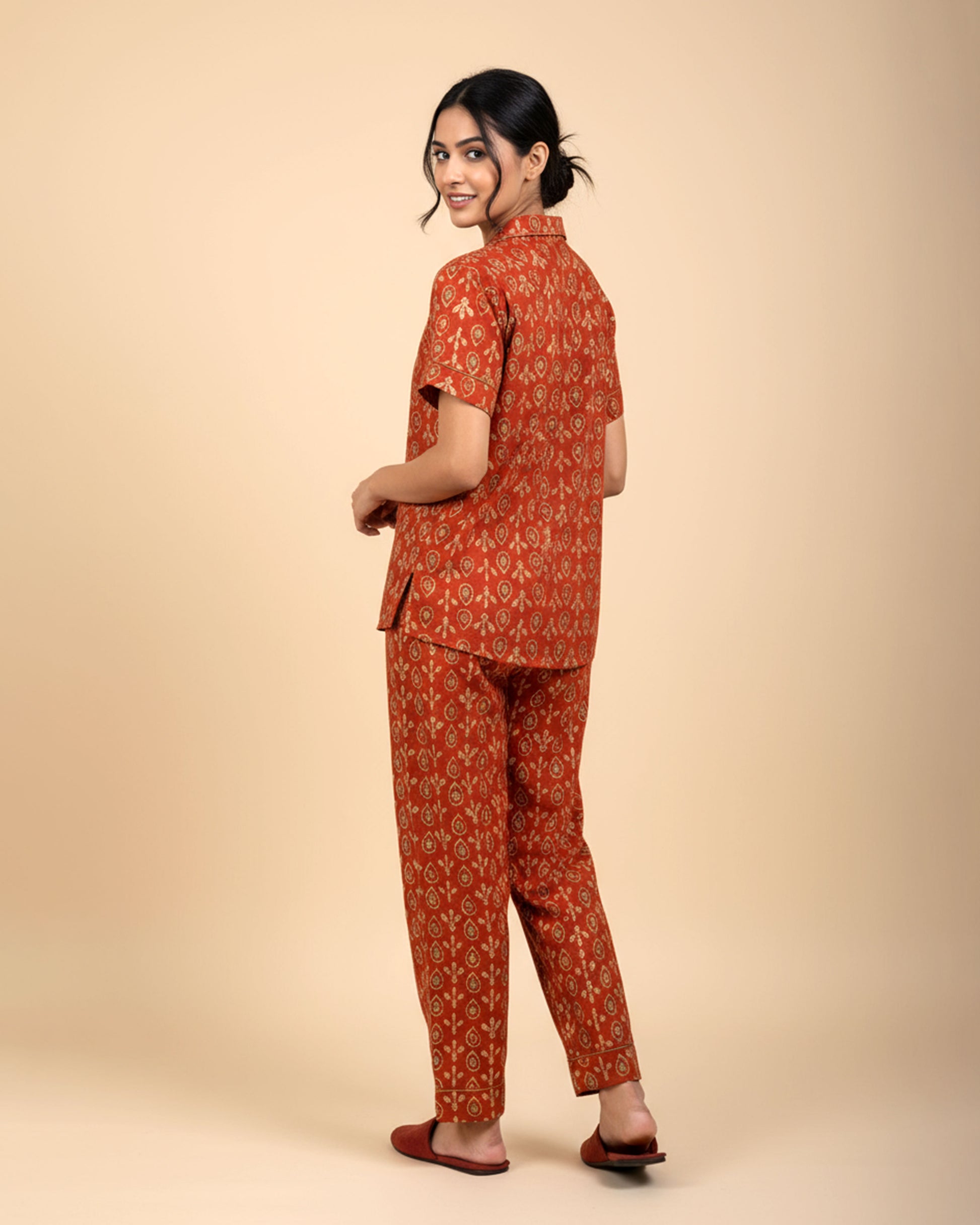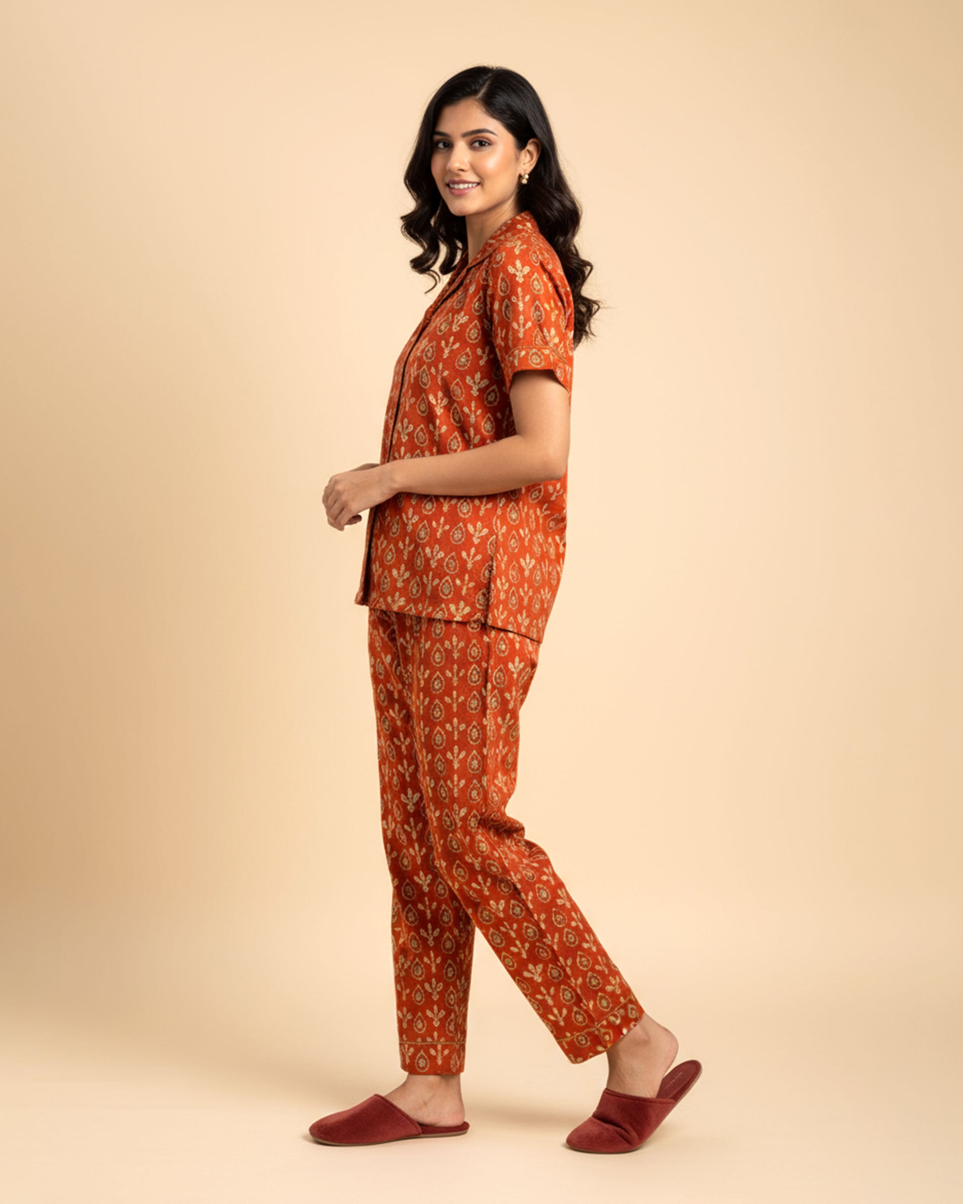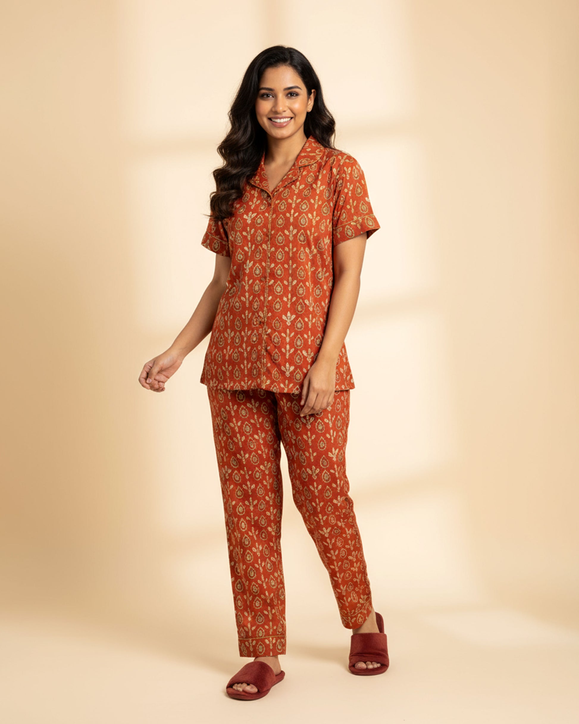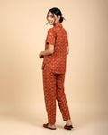 Embrace luxurious comfort with this women's rust orange floral print night suit, a stylish Night Wear set.