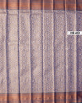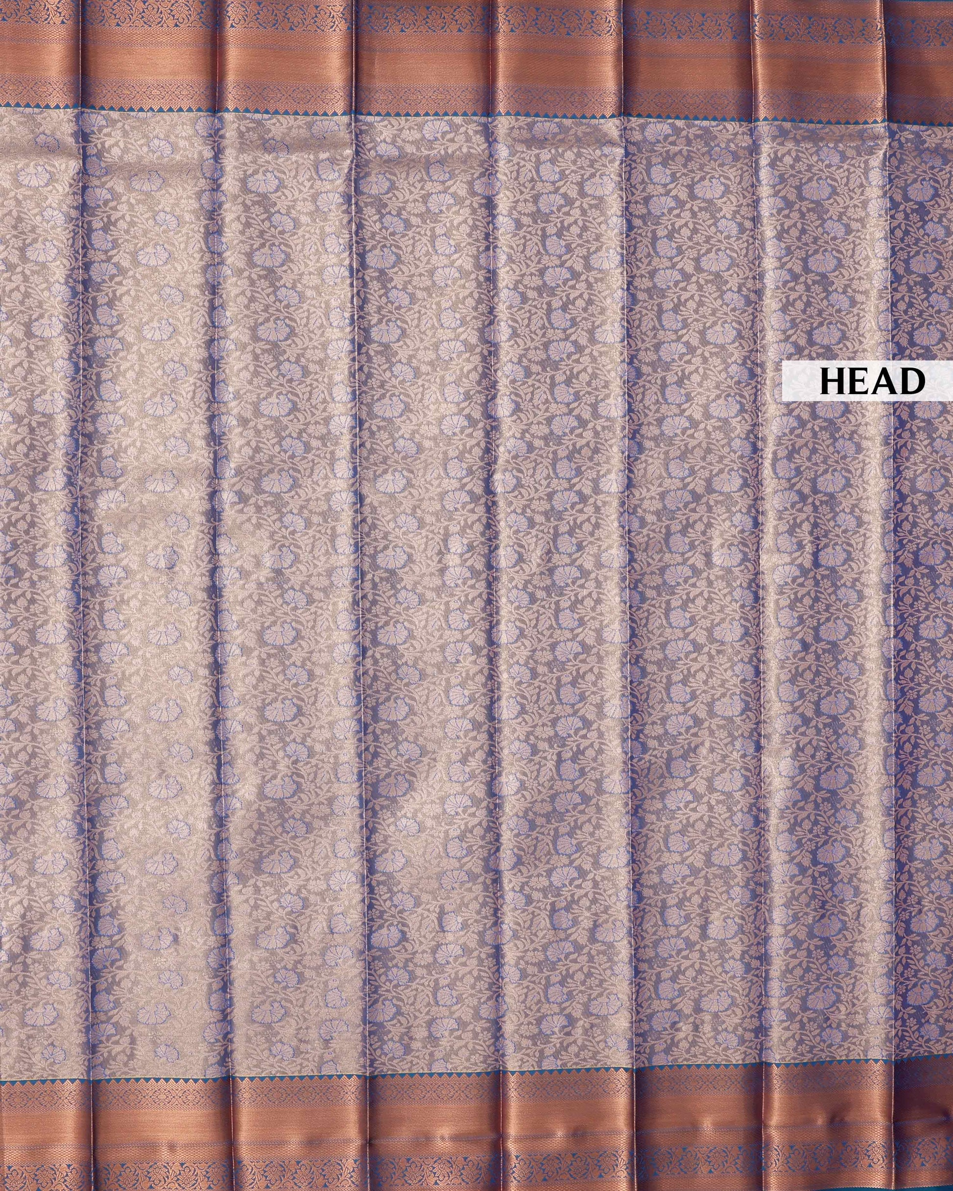 - This Kanchipuram tissue silk saree a silver-toned body with delicate blue floral brocade motifs